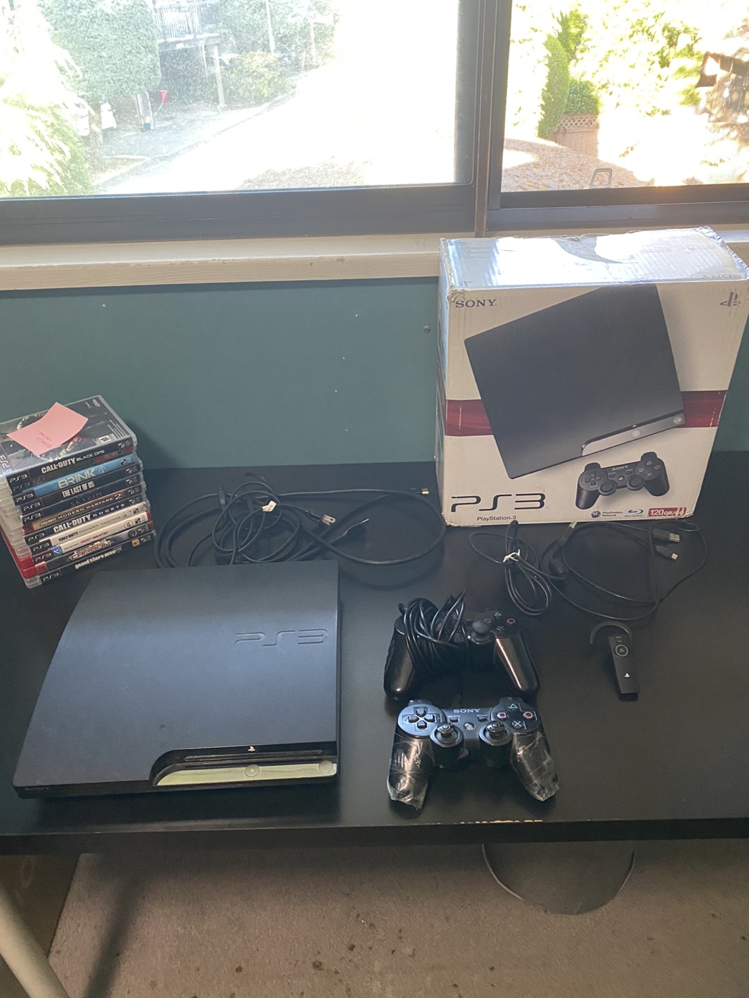 181ps3 with wired controller and a rage controller come with games and hdmi cord and power cord with mic and charging cord top game is advanced warfare i dont have the right case must take all free delivery within reasonable distance if far away just cover cost of gas and i can deliver