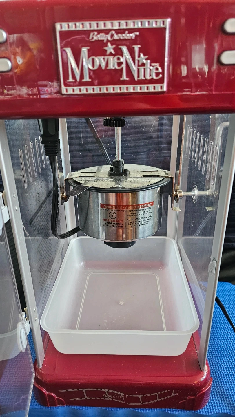 This Betty Crocker Movie Nite popcorn machine makes movie nights extra fun. It's red and has a clear popping chamber. Great for parties or family get-togethers.