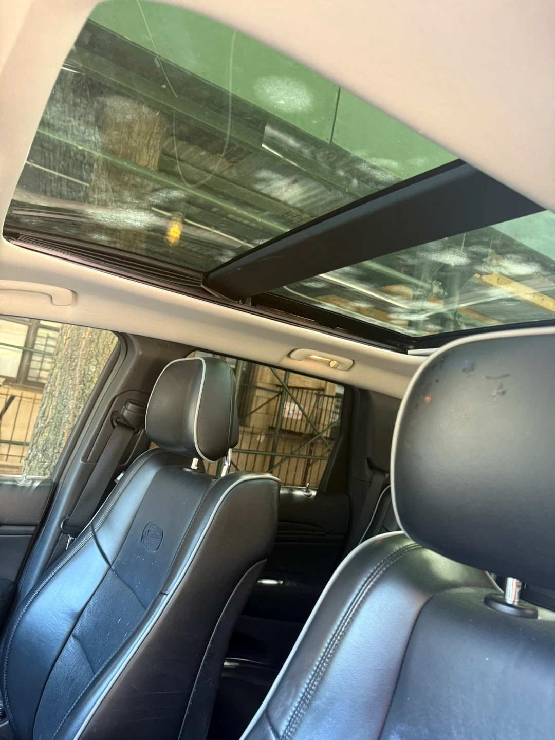 This listing is for a black leather interior from a Jeep Grand Cherokee. It includes front and rear seats with white accent stitching. Features a sunroof and wood-grain steering wheel trim. Front driver's seat shows some wear.