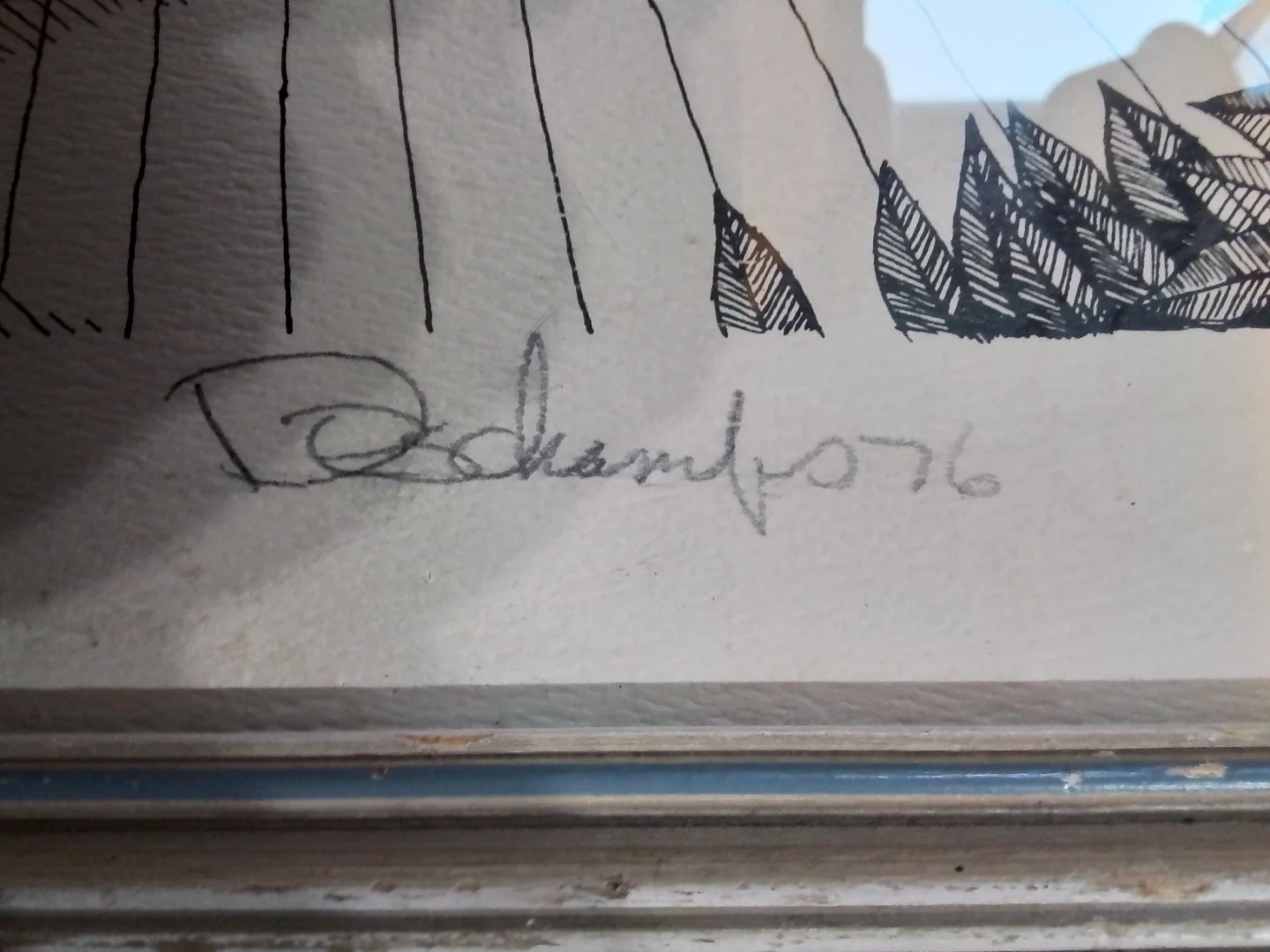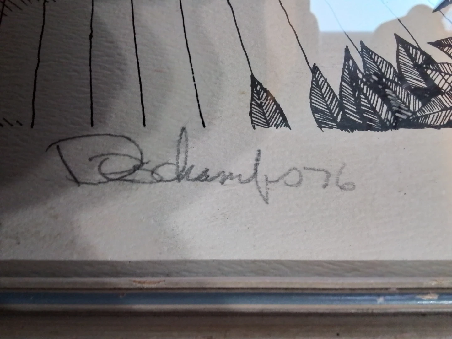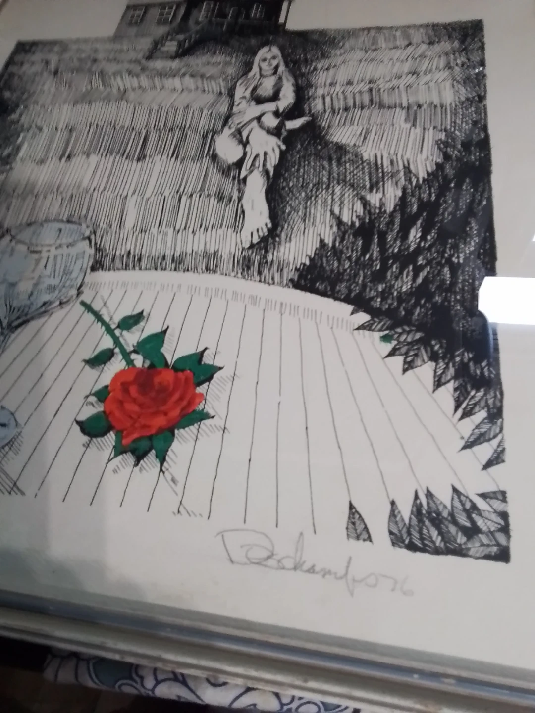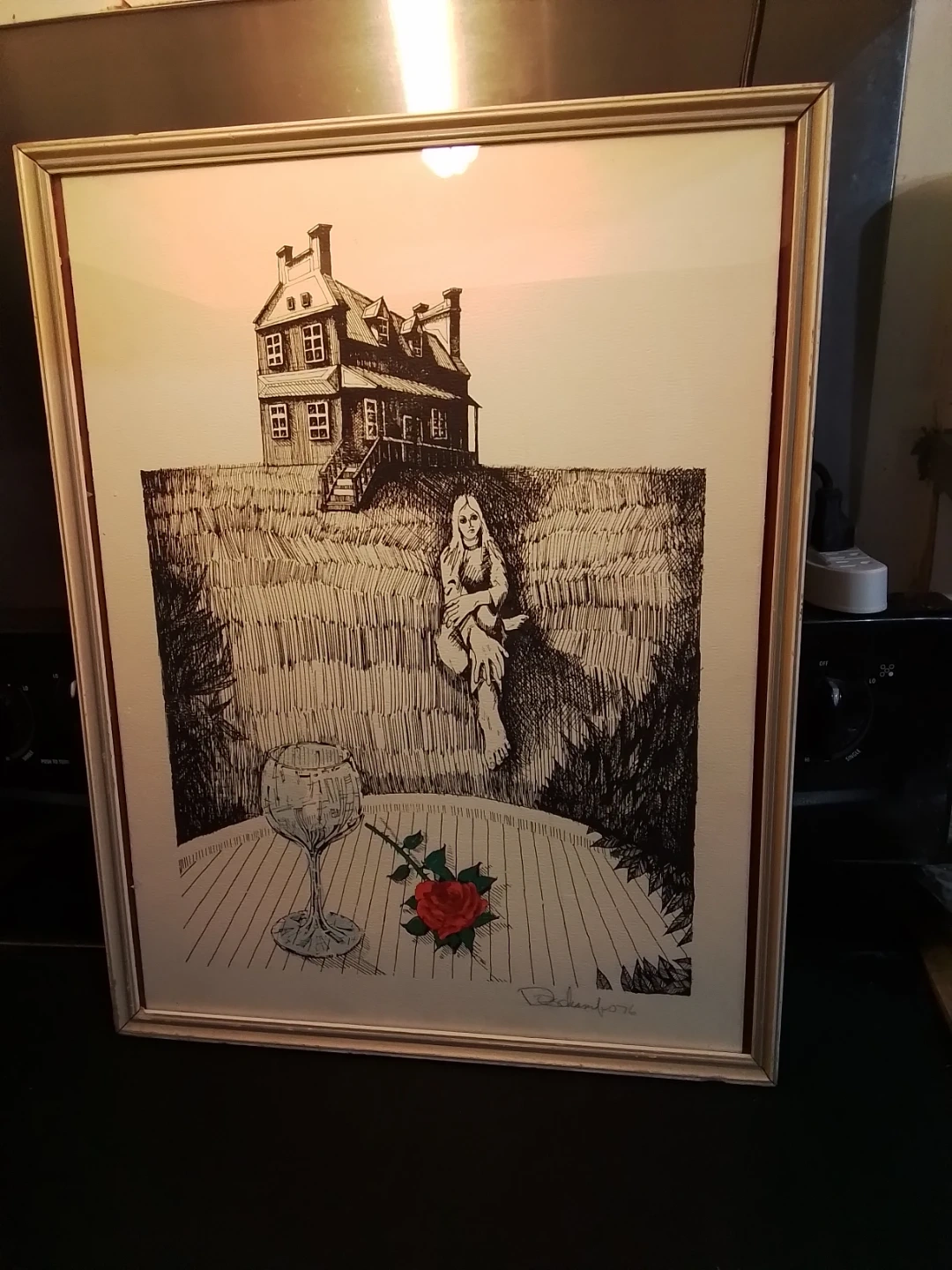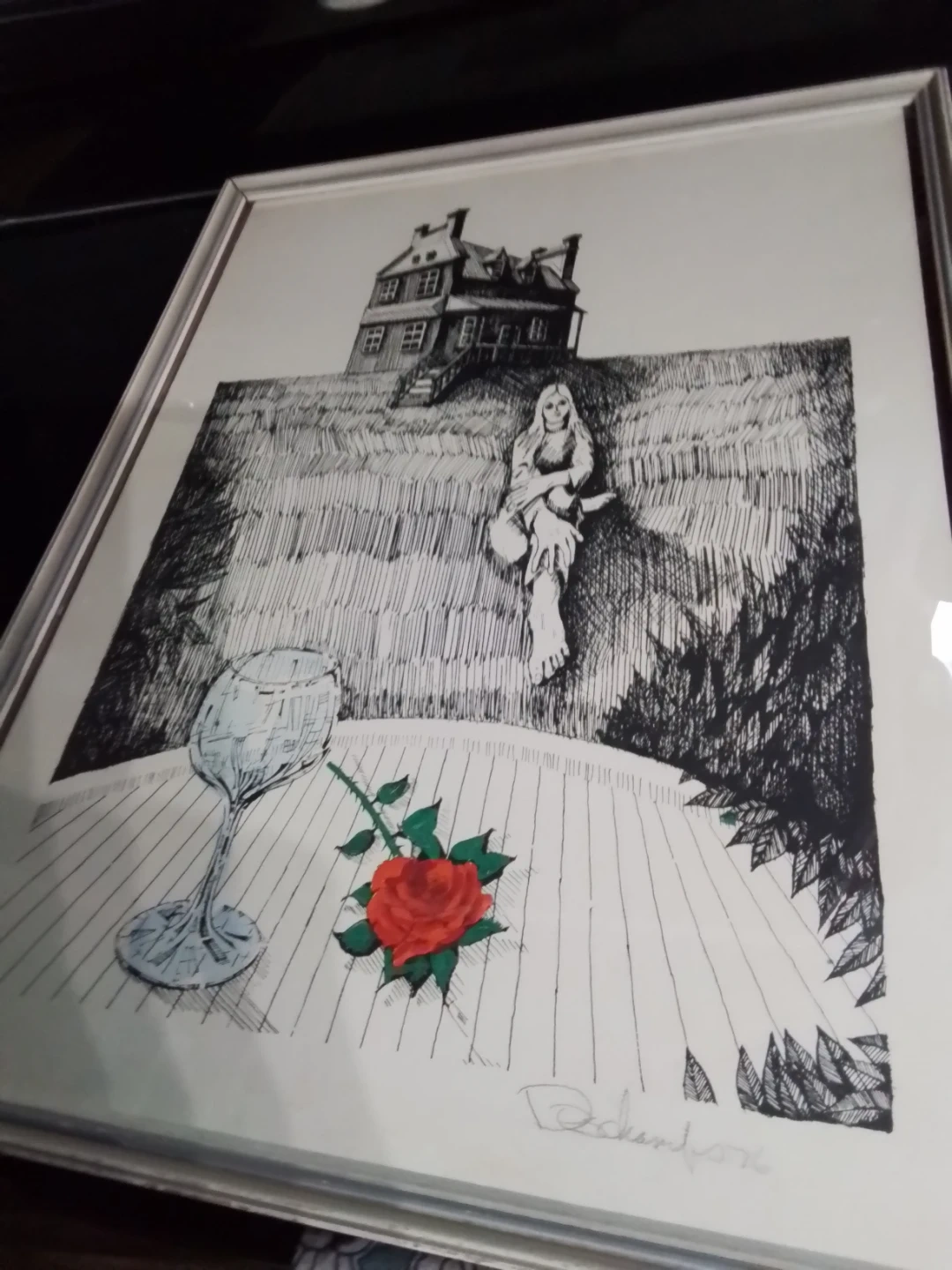 This vintage mixed media artwork, signed Duchamfo in '76, is a unique find. Measuring 17.5x22.5 inches, the piece features a surreal depiction of a house, a figure, and still life elements in black ink. The art is framed and ready to hang, adding a touch of vintage charm to any room. The art is in good condition for its age.