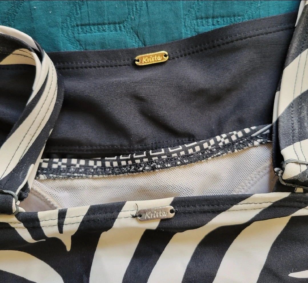 This Krista swim set includes a black swim skirt and a black and white zebra print tankini top. They're both made from a stretchy, quick-dry fabric. The tankini features decorative trim and ruching on the sides.