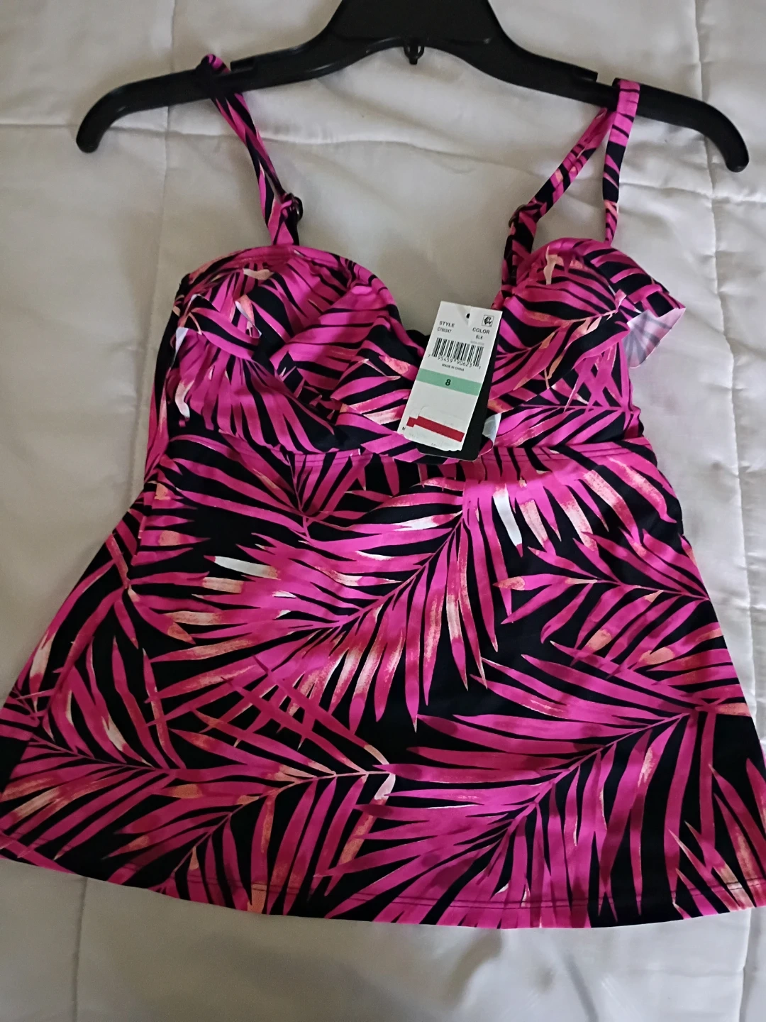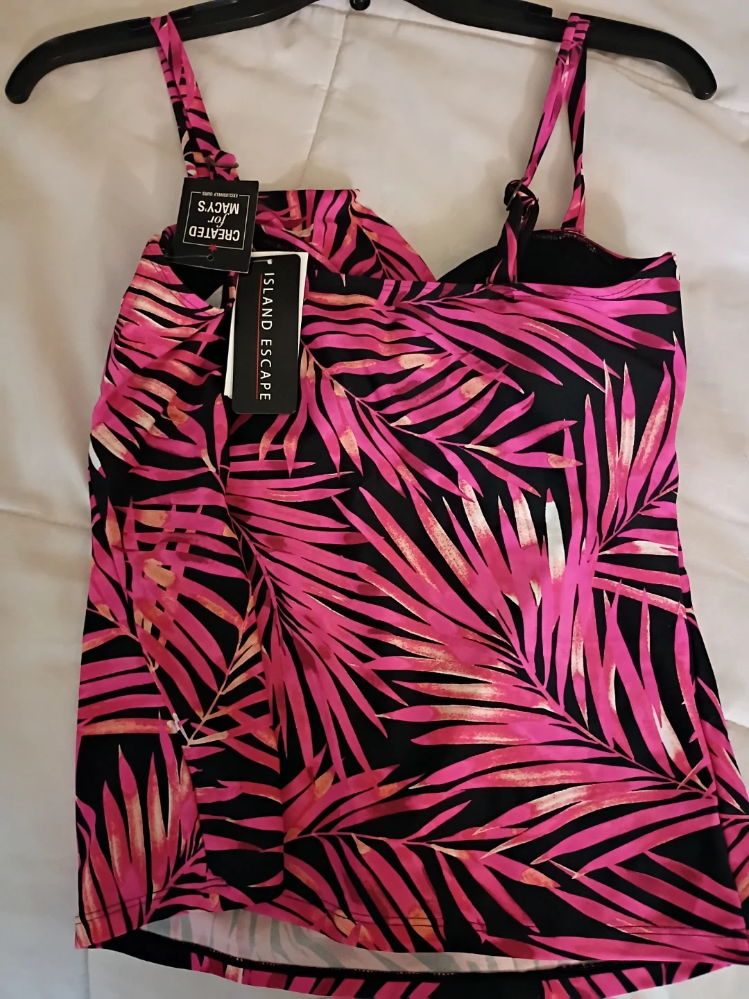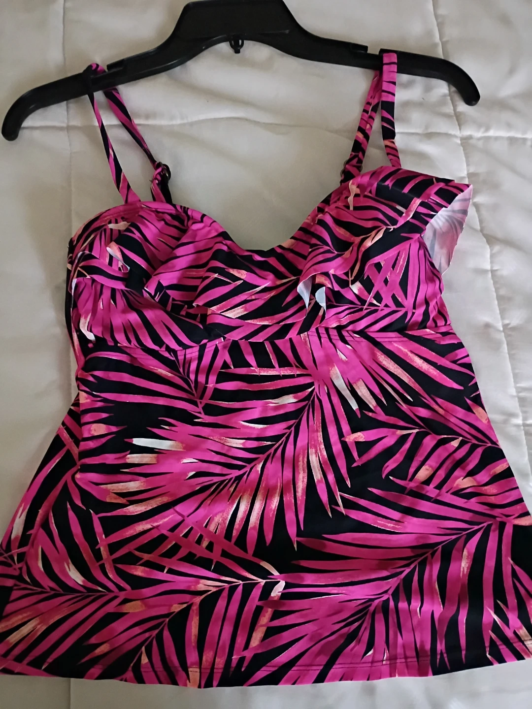 Island Escape tankini top in a vibrant pink and black tropical leaf print. Features adjustable straps and a ruffled neckline. Perfect for a beach vacation!