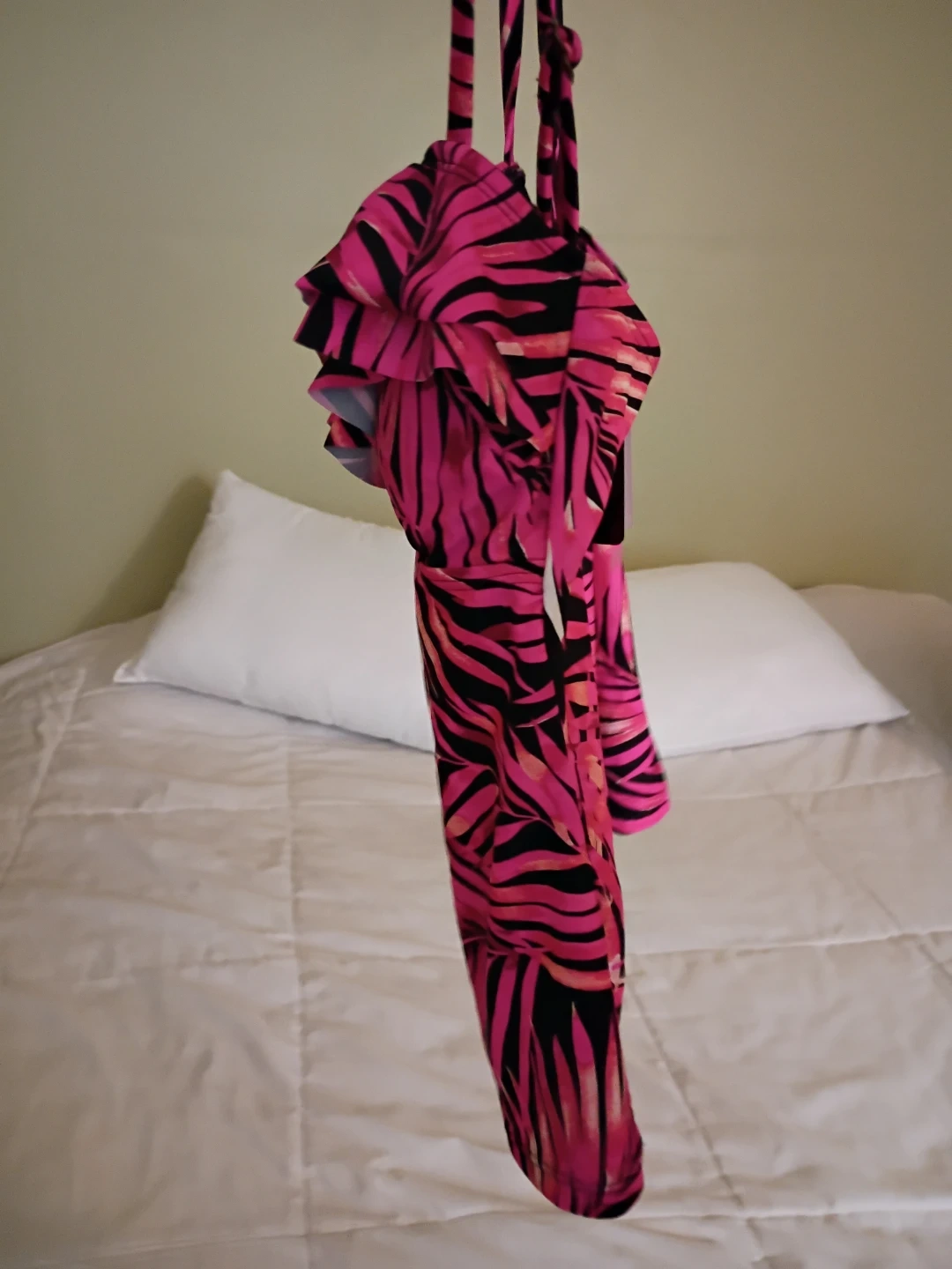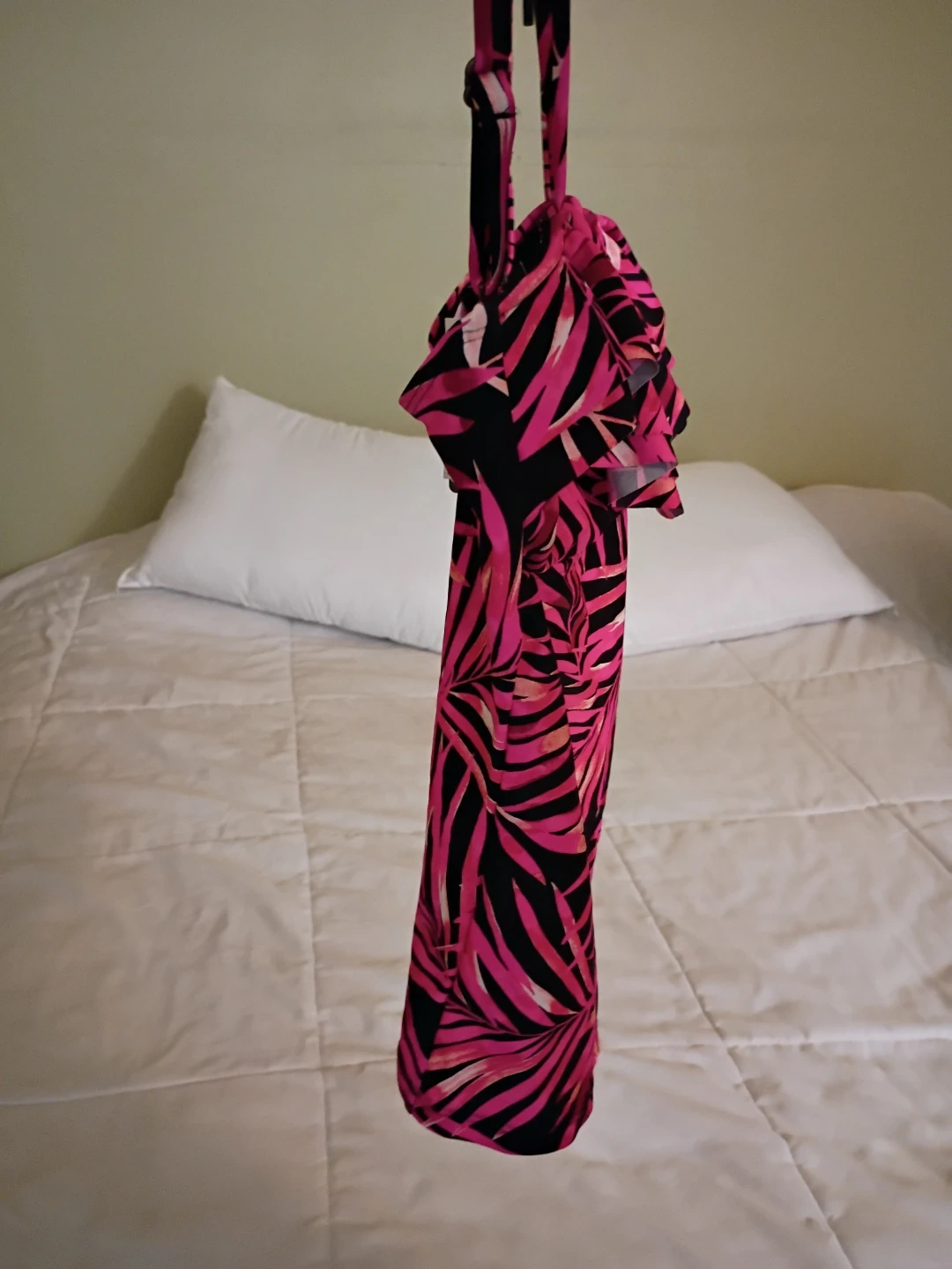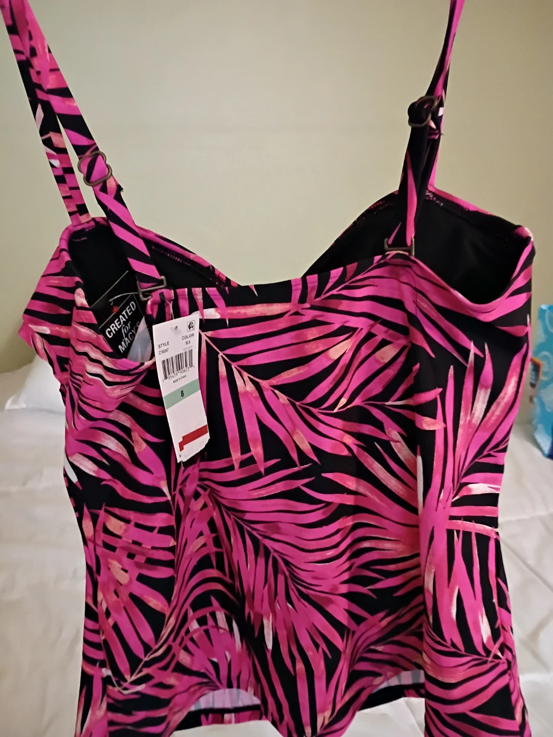Island Escape tankini top in a vibrant pink and black tropical leaf print. Features adjustable straps and a ruffled neckline. Perfect for a beach vacation!