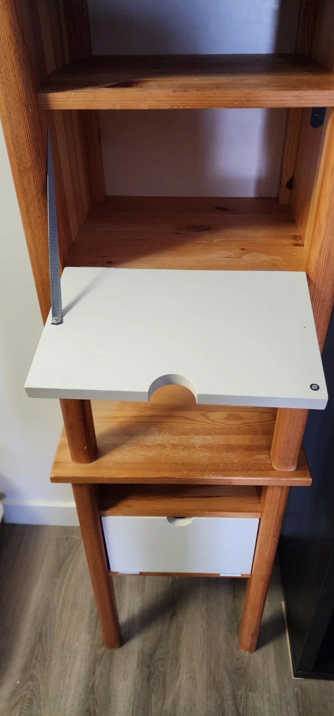 Set of two wood nightstands. Each nightstand features a pull-down. Drawer for storage. Natural wood finish with a rustic appeal. There plenty of storage with 2 storage areas.