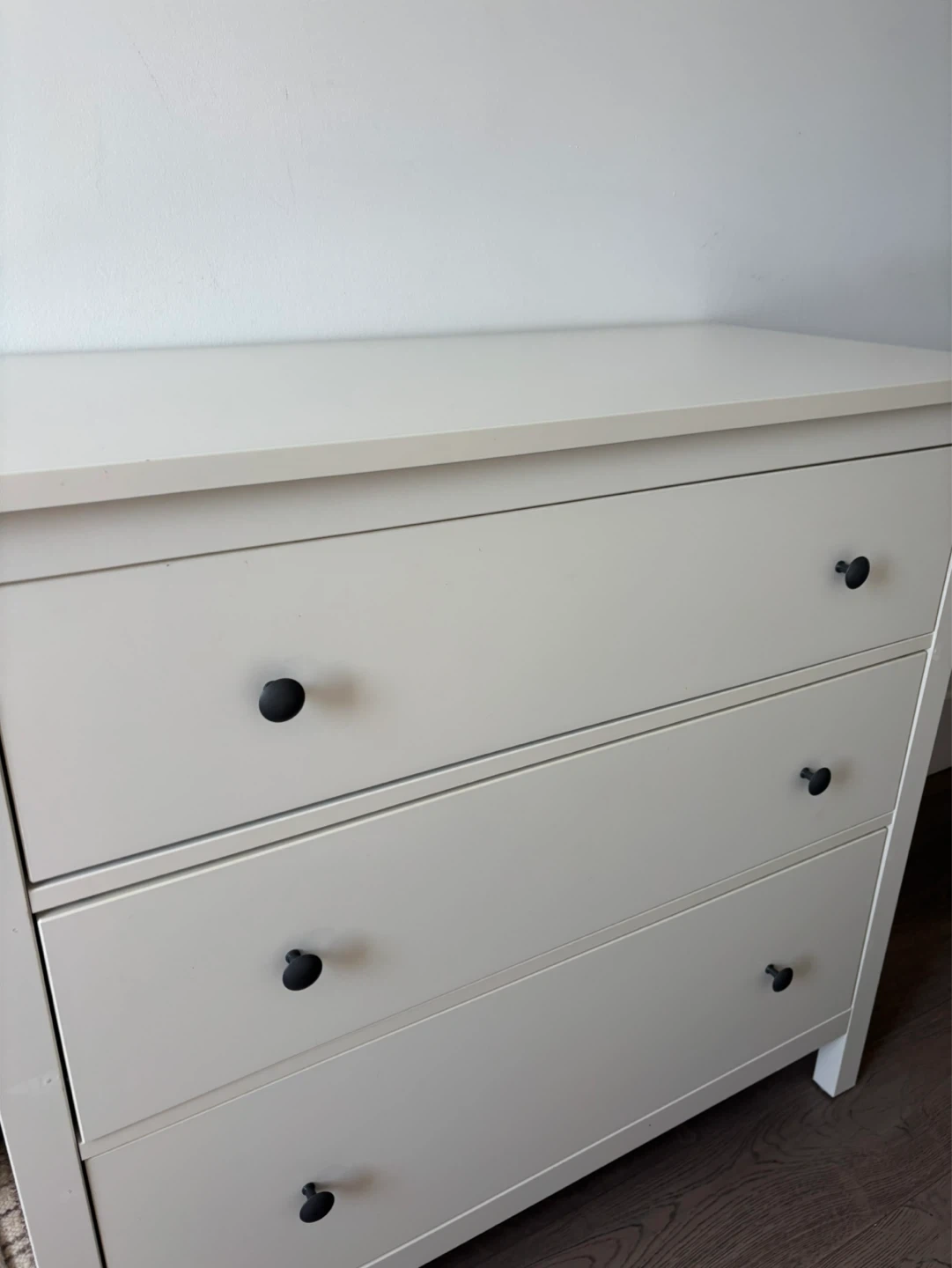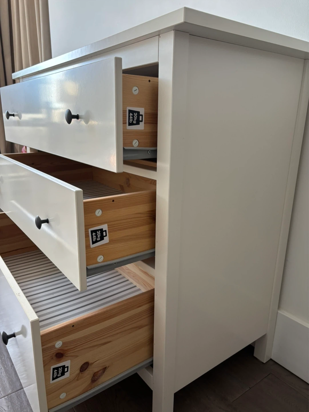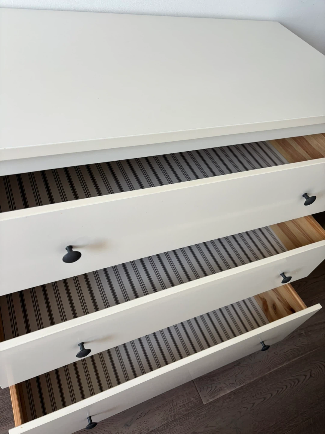 White dresser with four drawers, featuring black knobs. The drawer interiors are lined with a striped fabric. Includes labels on drawers indicating weight limits.