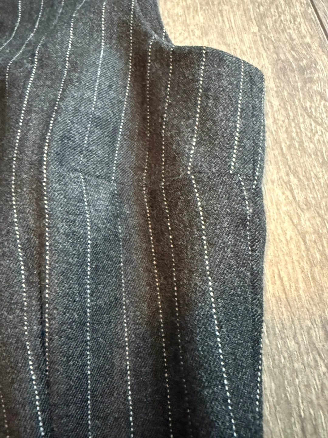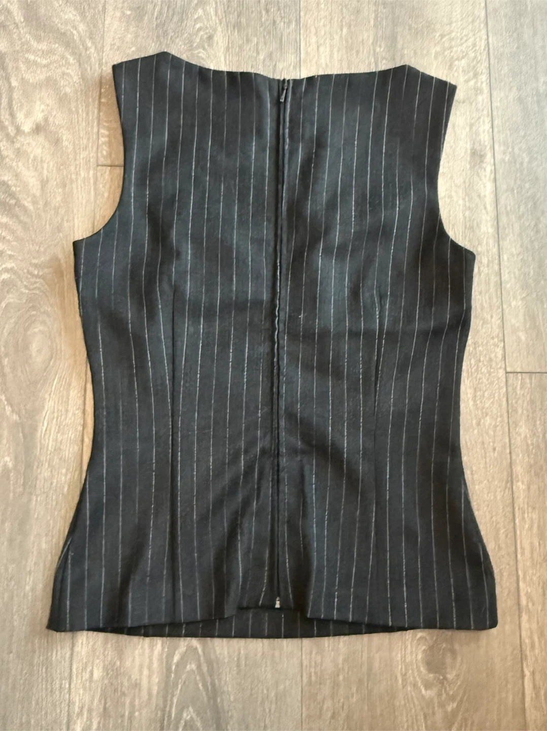 This is a Dolce & Gabbana pinstripe sleeveless vest top. Made in Italy, it's a blend of polyester, wool, and elastane. It features a zip closure at the back.
