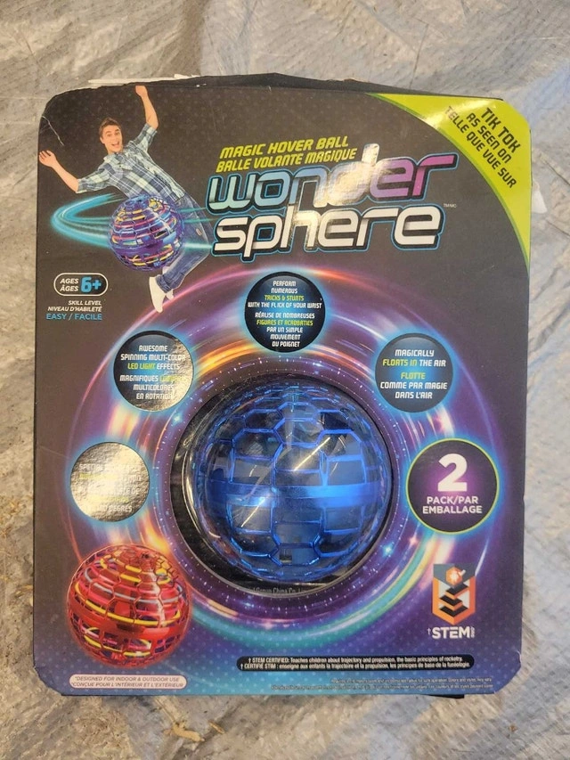 Experience the magic with this Wonder Sphere magic hover ball, perfect for indoor and outdoor use and suitable for ages 6 and up! This new-in-box, two-pack set features awesome spinning, multi-coloured LED light effects, allowing you to perform glamorous tricks and stunts with just a flick of your wrist! It magically floats in the air, providing endless entertainment for both kids and adults.
