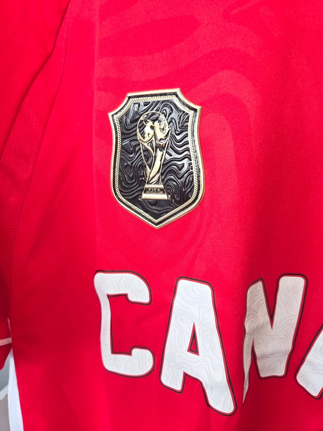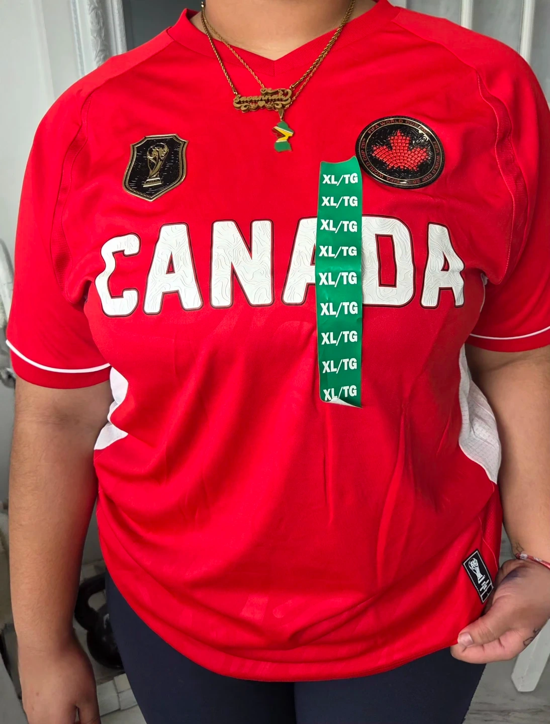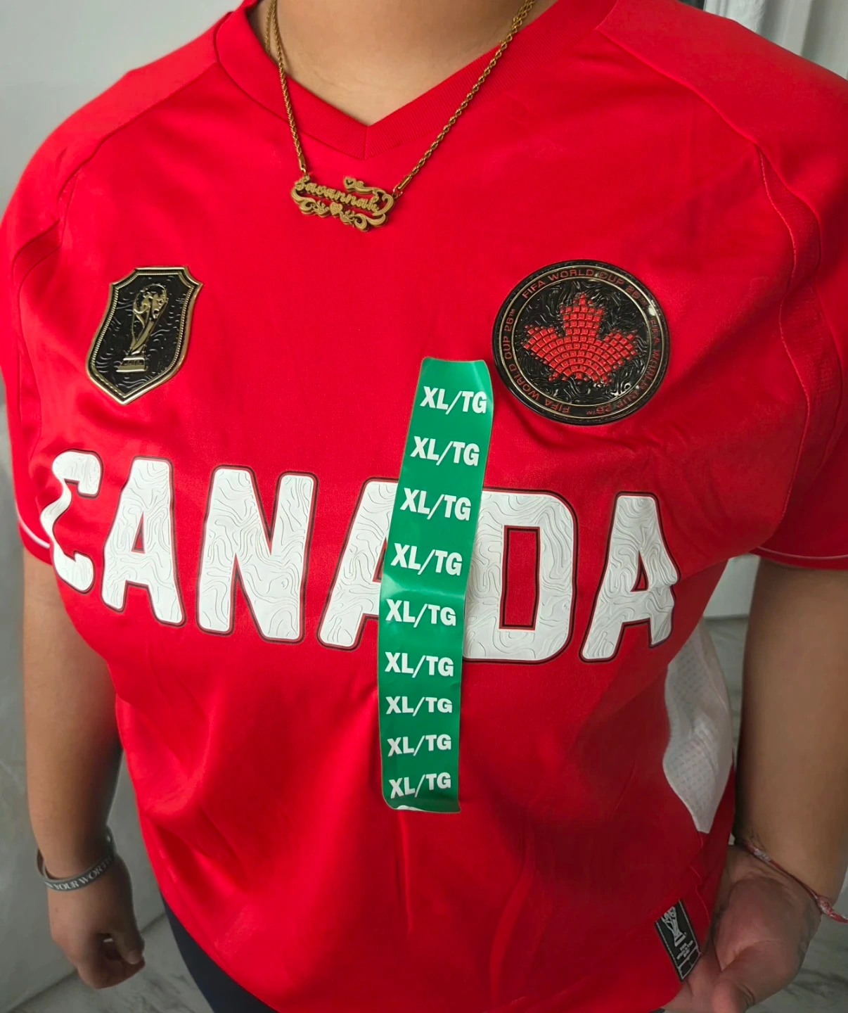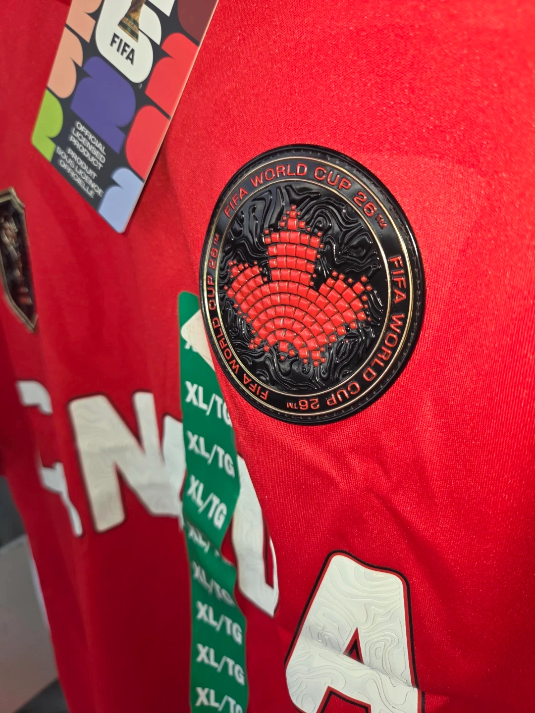 Red Canada FIFA World Cup jersey. Features 'CANADA' graphic and World Cup badges. Size XL/TG