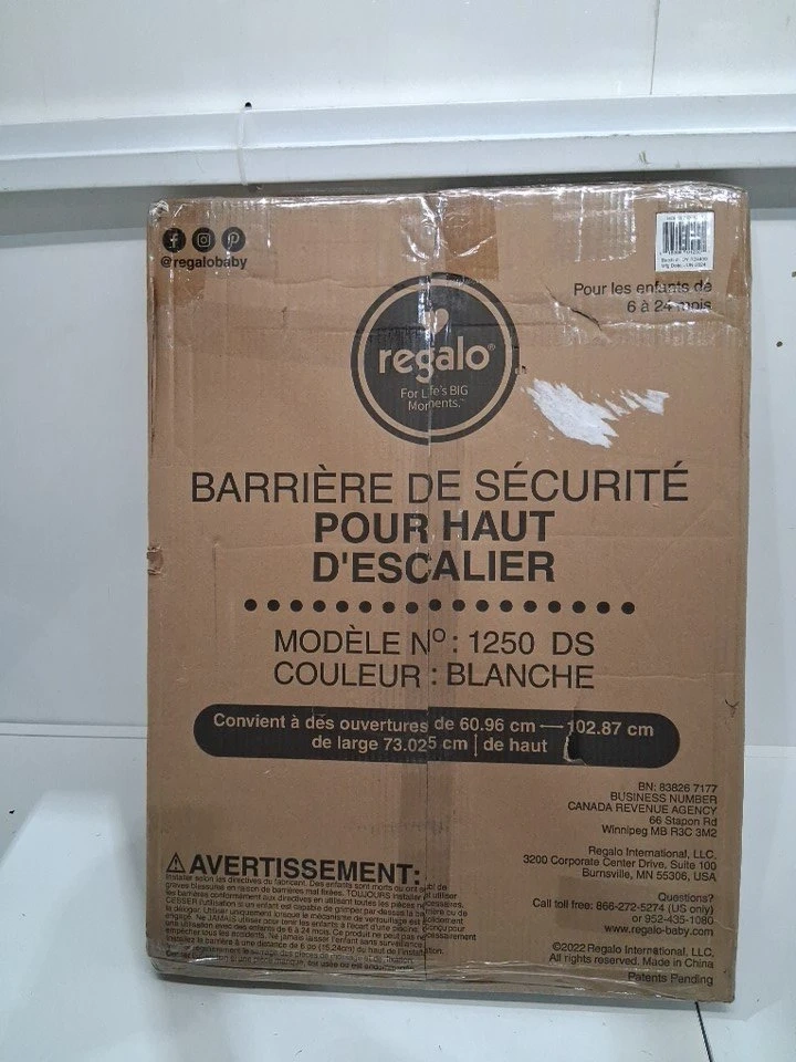 Keep your little one safe with this Regalo 2-in-1 Extra Wide White Baby Gate, perfect for doorways, hallways, and stairs, fitting openings between 24 to 40.5 inches wide, and standing 28.75 inches tall. This gate is hardware mounted and features a safety-lock, making it ideal for children aged 6-24 months and even pets. This item is new and comes with all original hardware for secure installation.