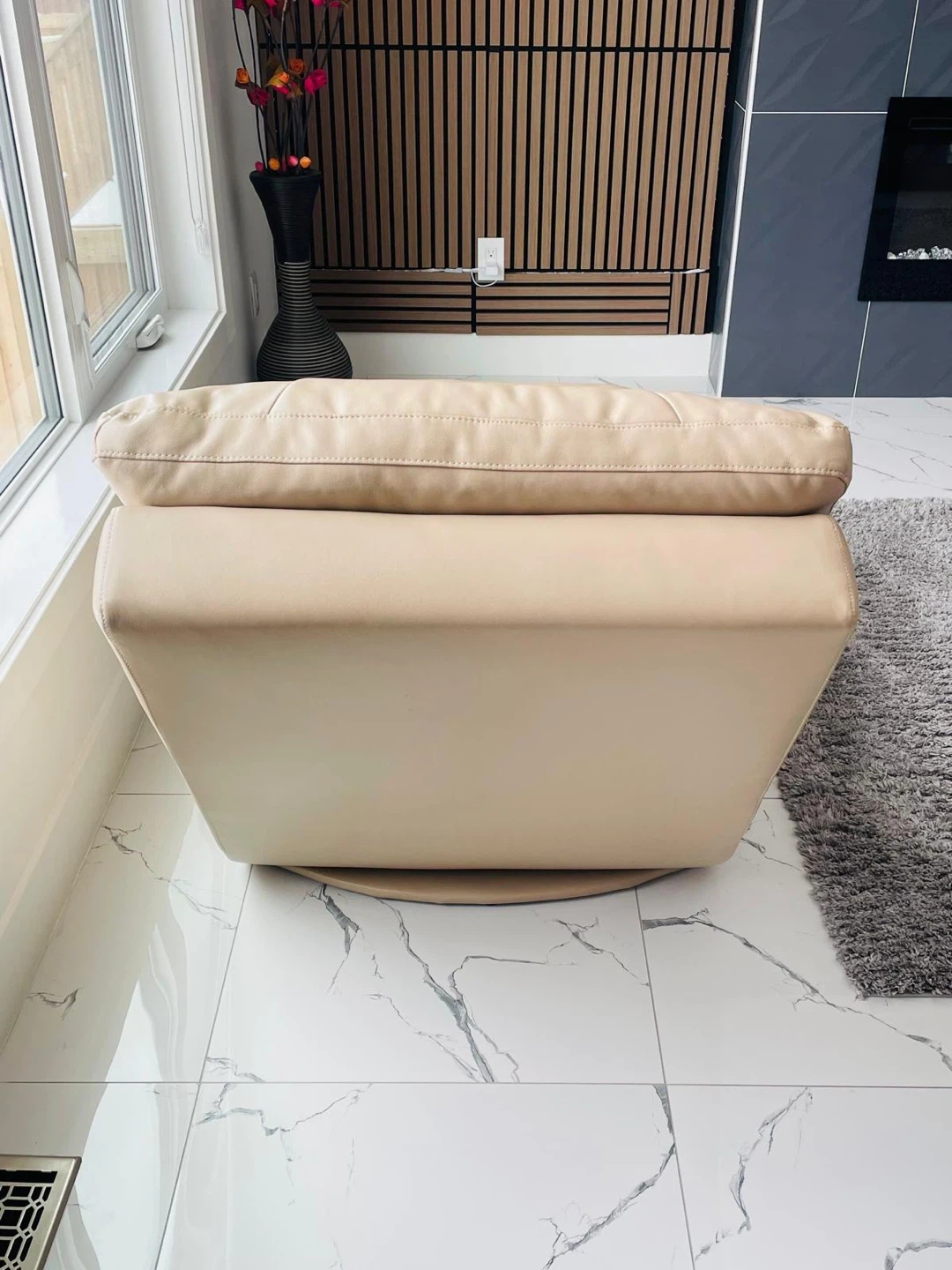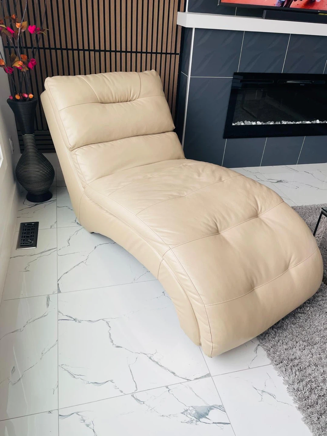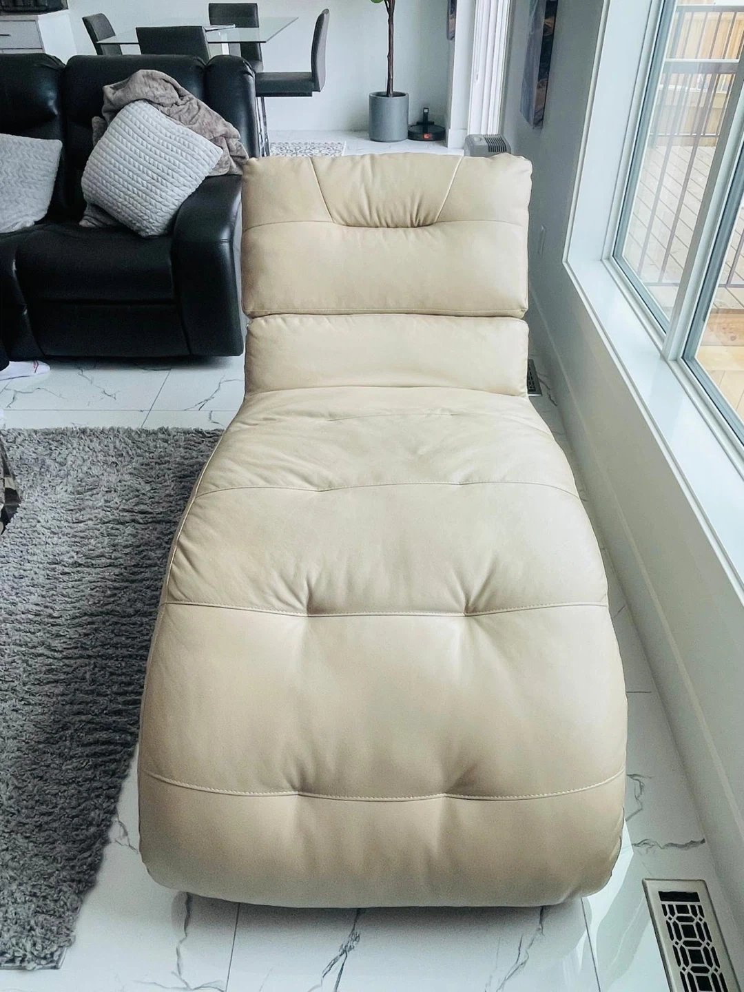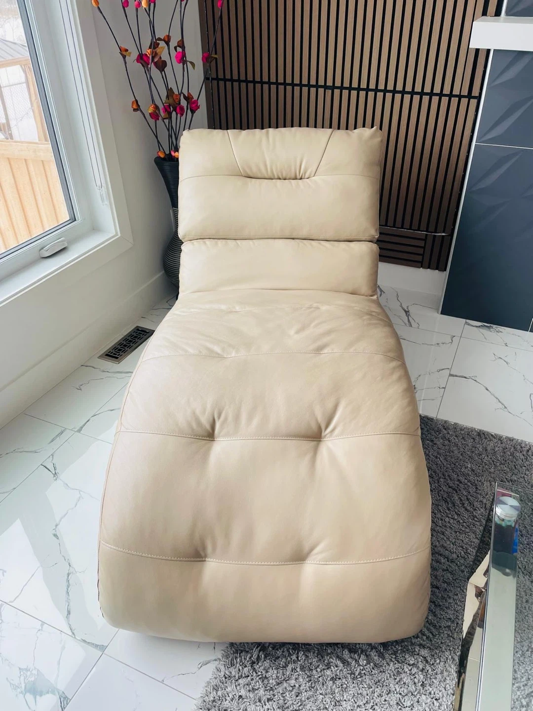 A stylish cream leather chaise lounge chair. It's tufted for extra comfort and has a swivelling base. This piece is perfect for relaxing in your living room or bedroom. Brought from the brick two years ago. Asking $450.