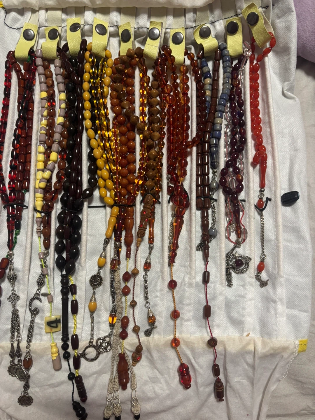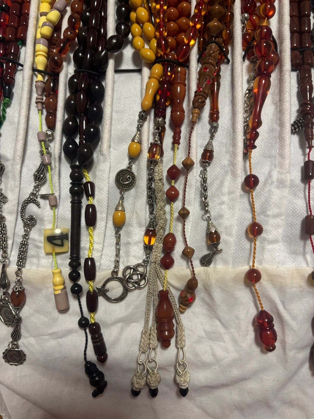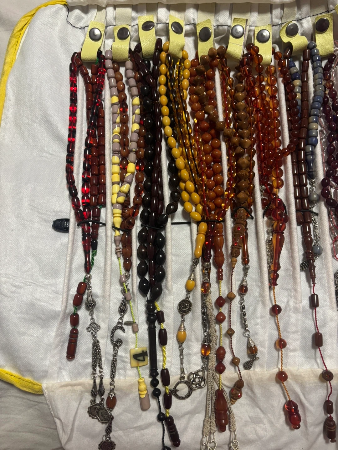 A collection of assorted prayer beads. These beads are made from various materials including amber, wood, and stone. Each strand has unique bead shapes and decorative tassels or metal charms. They're suitable for personal use or as a decorative item.