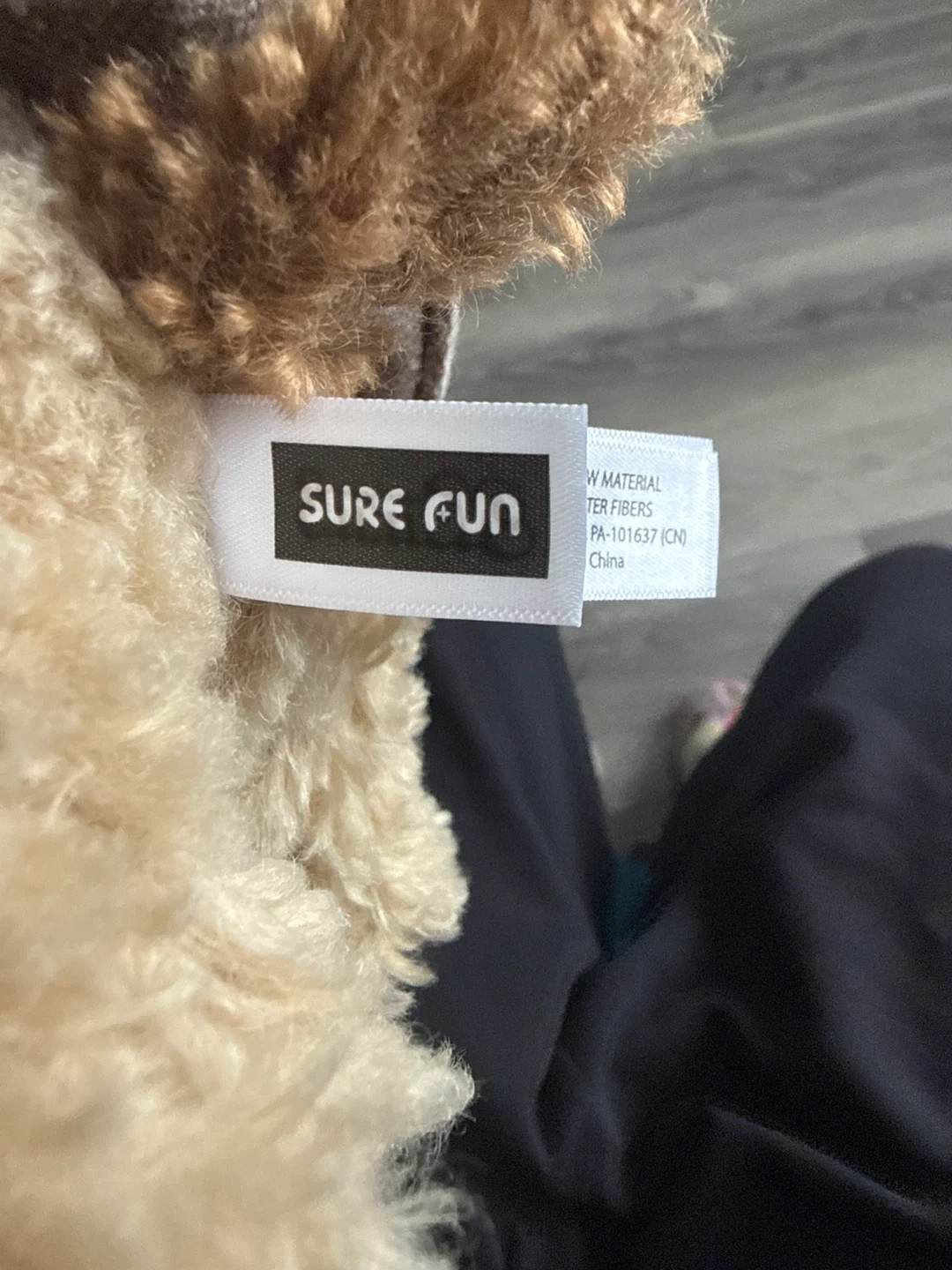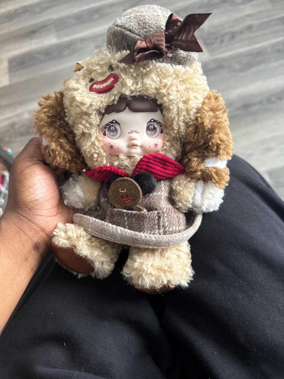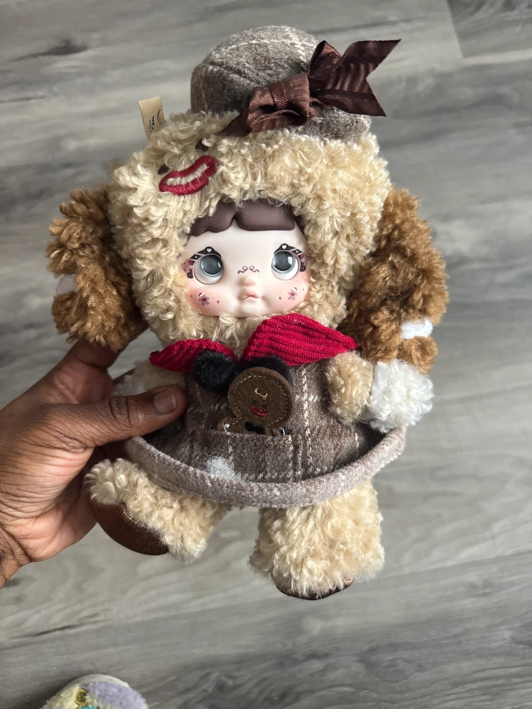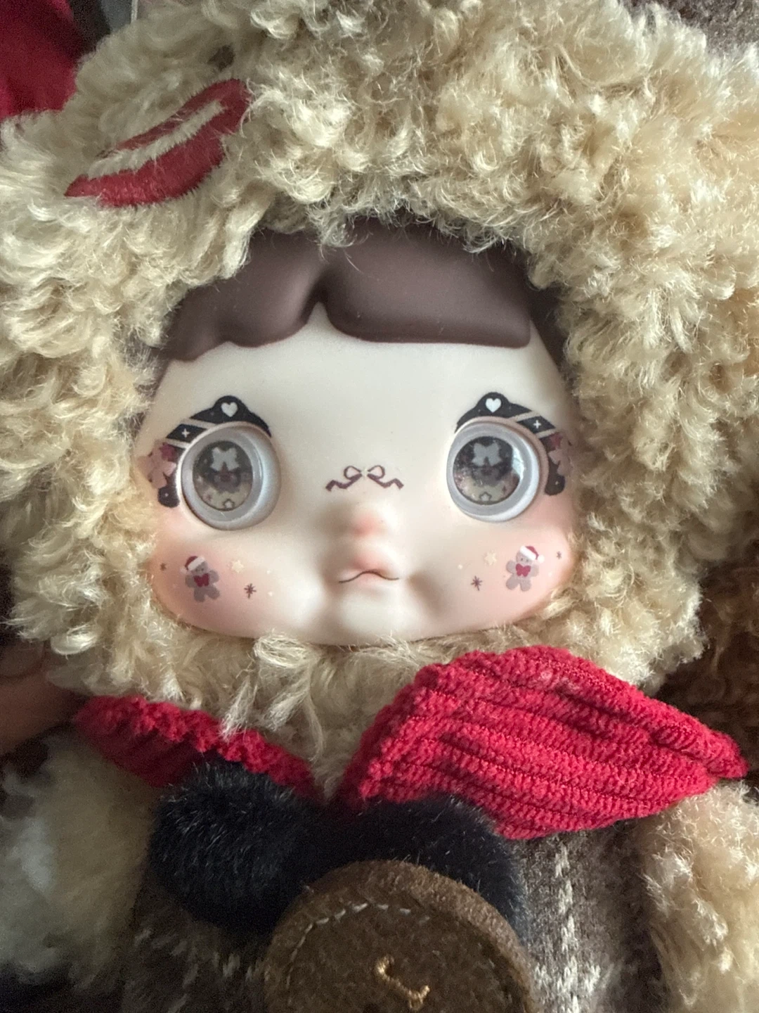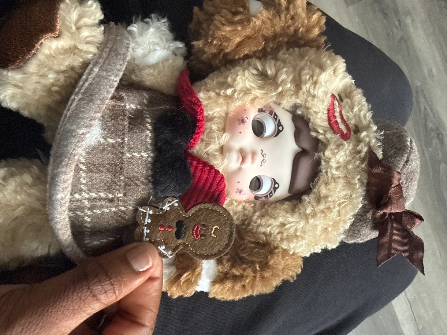 This is a cute doll with a furry hood and outfit. It has detailed facial features and a gingerbread button accent. Made from textile fibers.