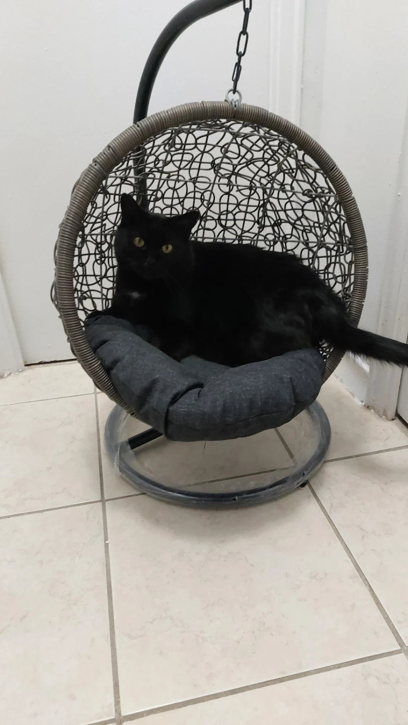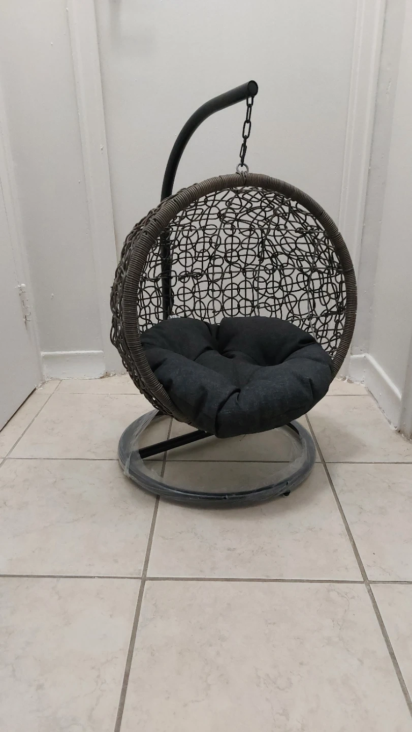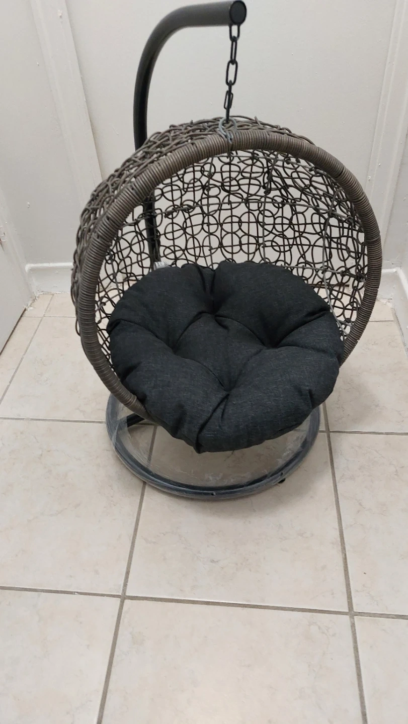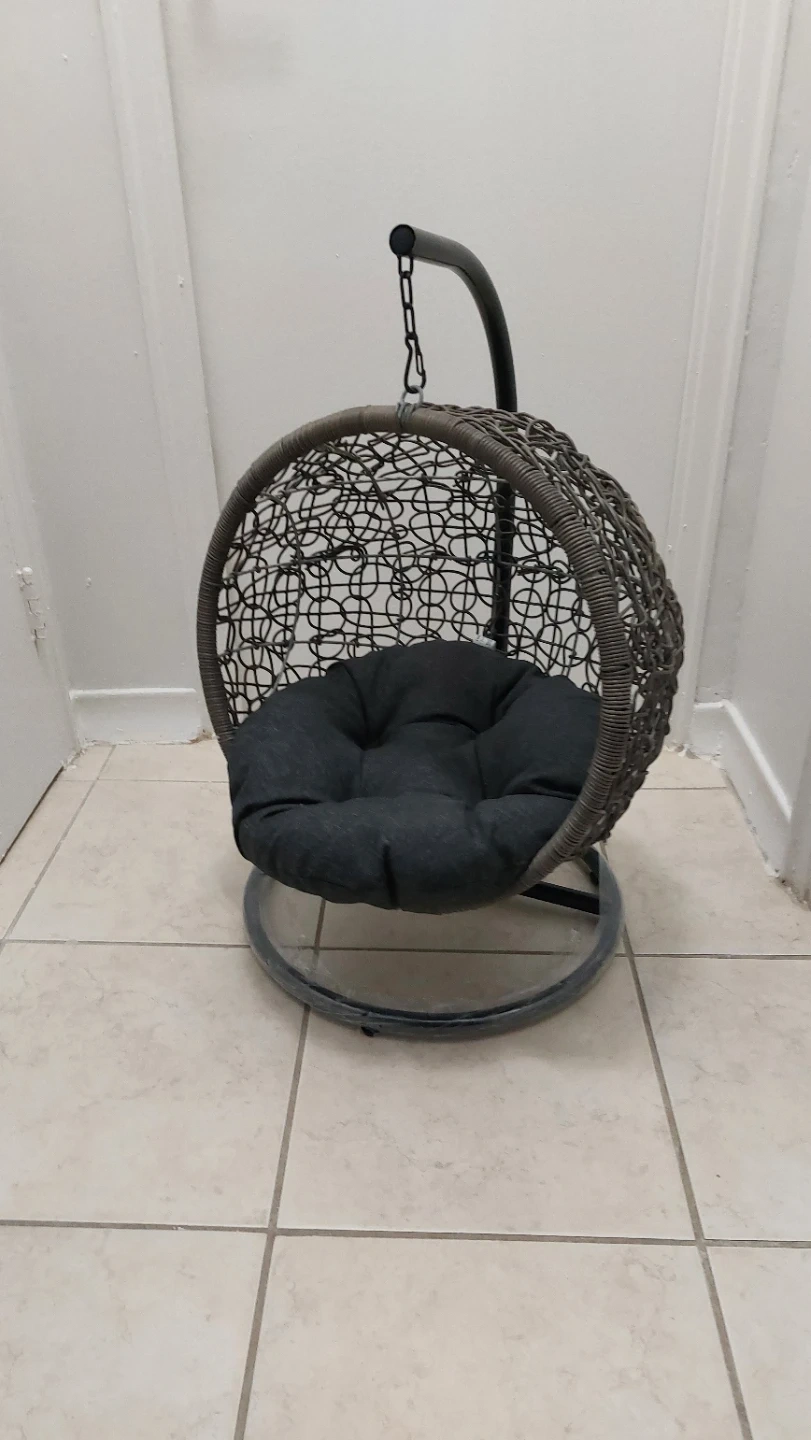 This comfortable hanging cat/small dog chair features a durable wicker-style basket and a plush dark grey cushion. It's designed for relaxation and adds a cozy touch to any space. The chair includes a sturdy stand and chain for easy setup.