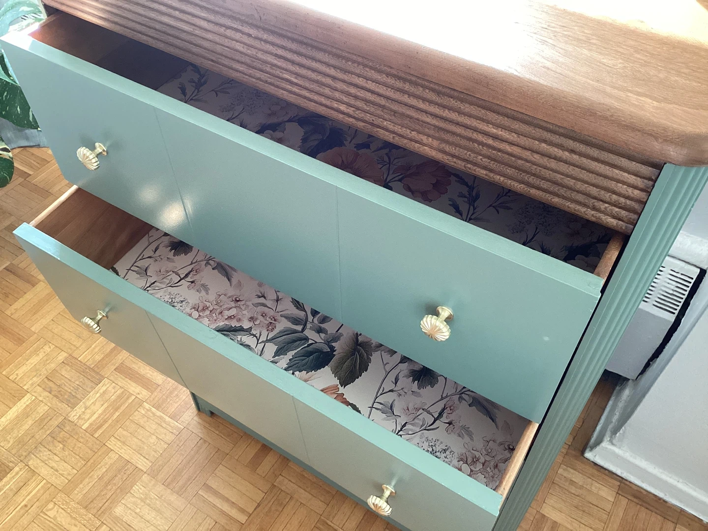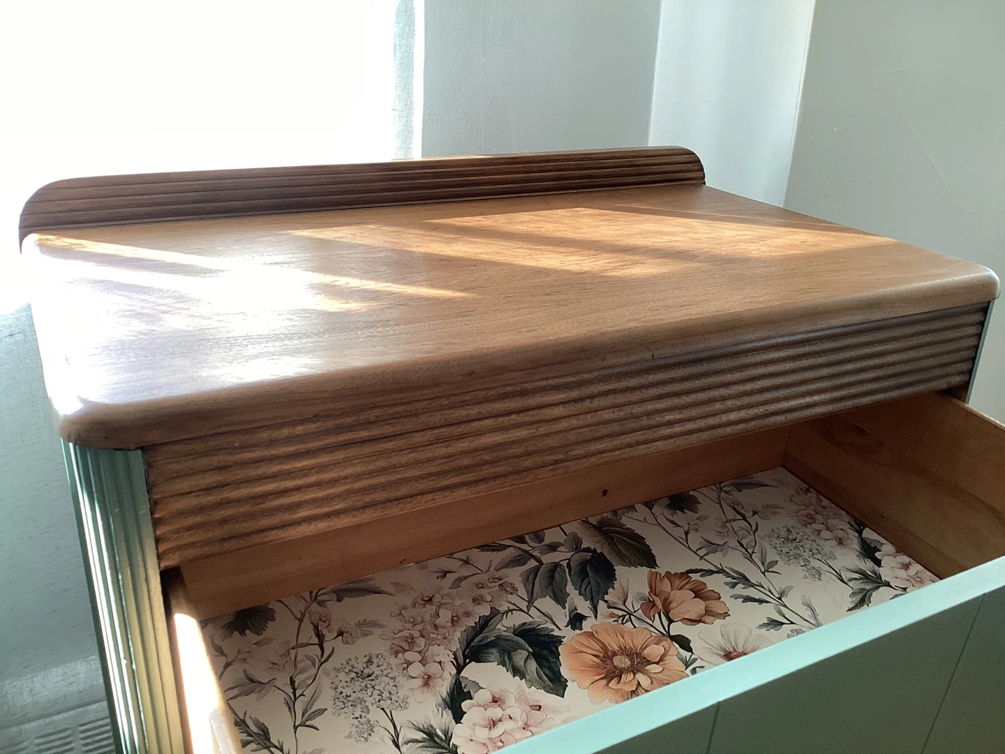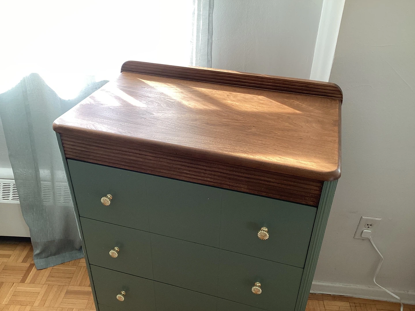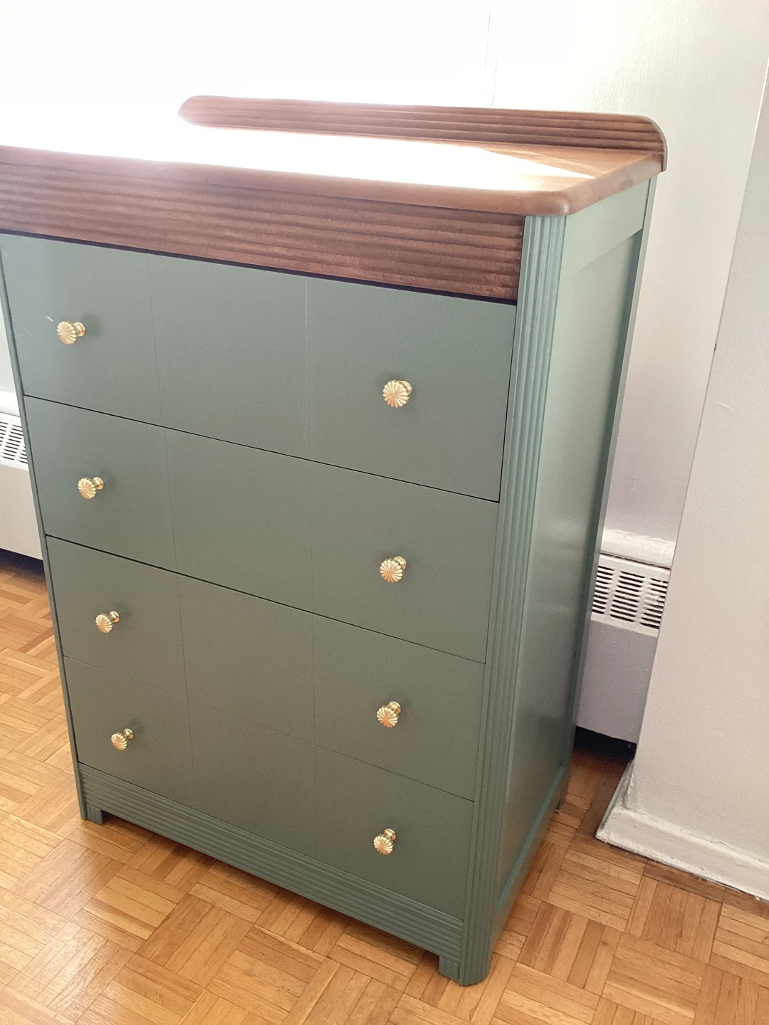 Beautiful newly refinished dresser in a muted sage/olive green with a warm solid wood top and gold knobs. Clean lines with subtle curved details give it a timeless mid-century feel that works well in both modern and classic spaces.