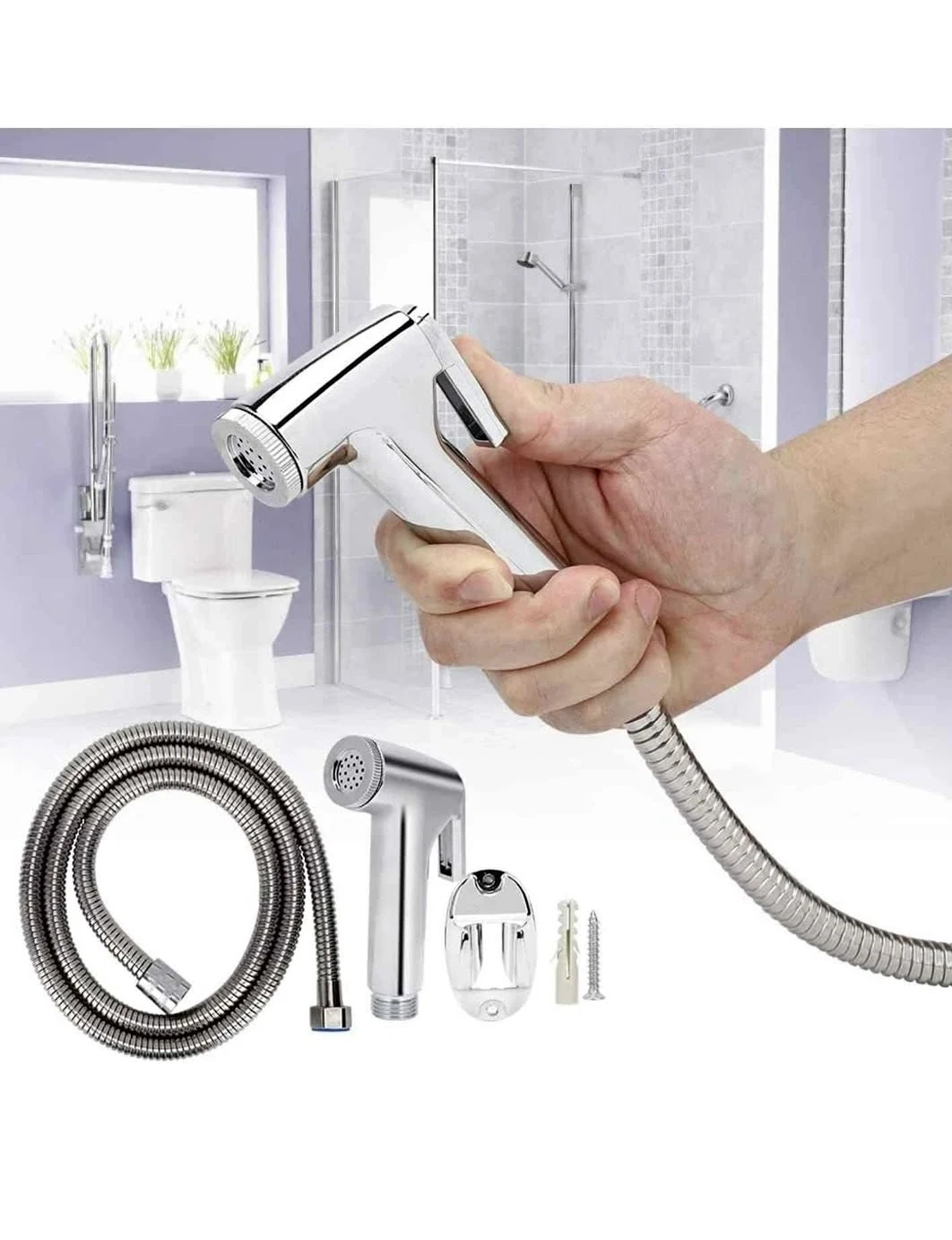 This bidet sprayer set includes a chrome metal handheld showerhead and a flexible hose. It's ergonomically designed for a comfortable grip and convenient to use. It comes with a wall mount bracket and screws for easy installation.