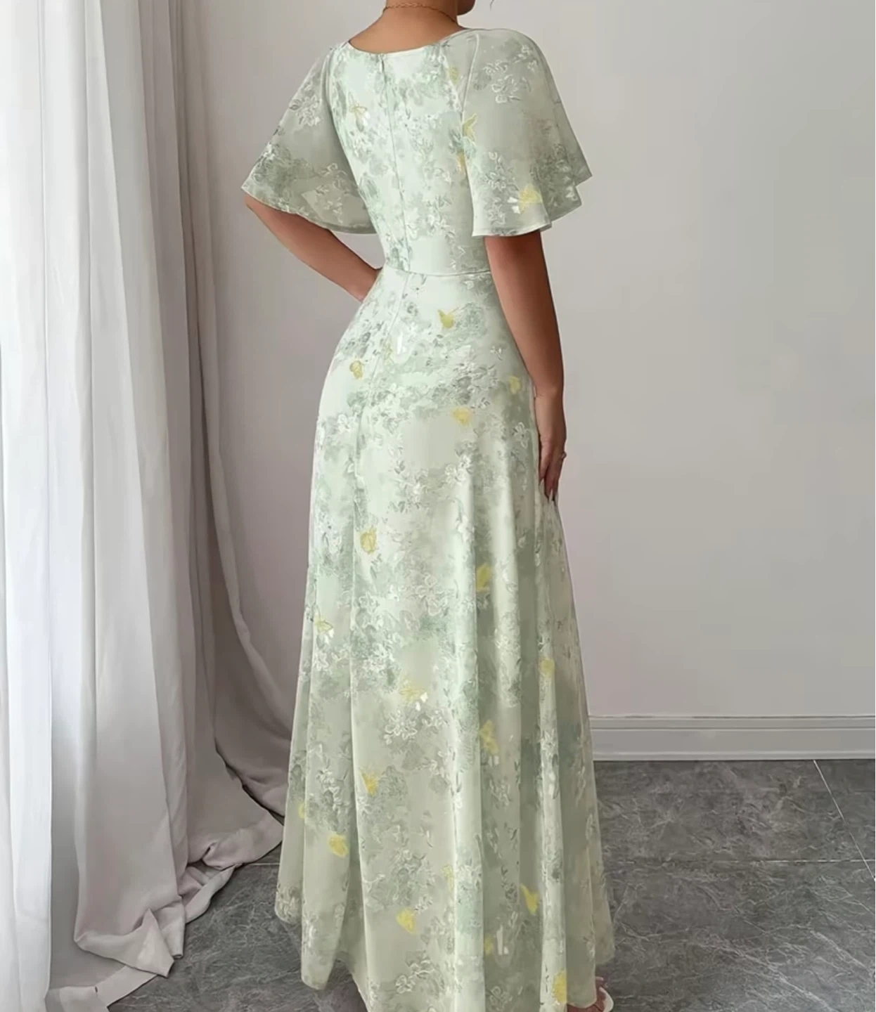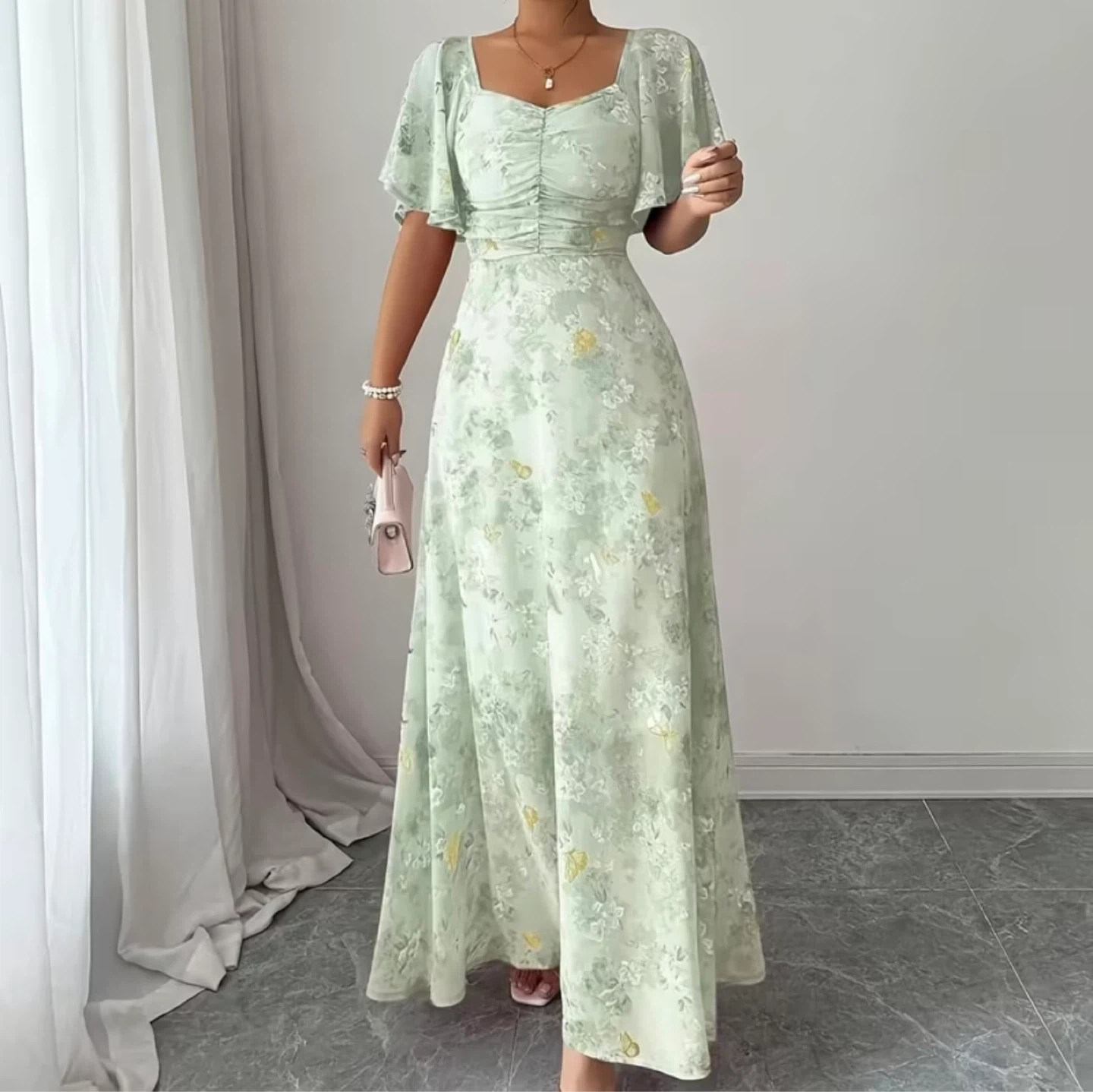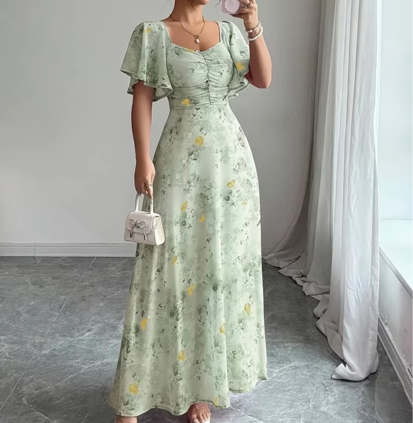 This light green floral maxi dress features flutter sleeves and a ruched bodice. It's a size medium. Perfect for a summer outing!
