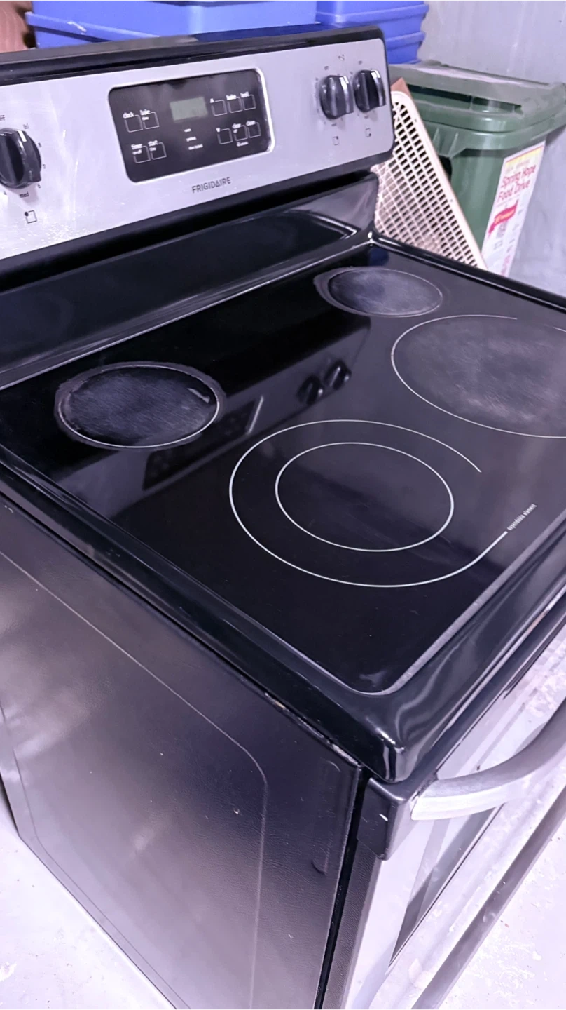 This Frigidaire stove has a smooth glass cooktop with four electric burners. It features an oven with racks and a convenient storage drawer at the bottom. Expandable element on cooktop for versatile cooking! It's a great addition to any kitchen.