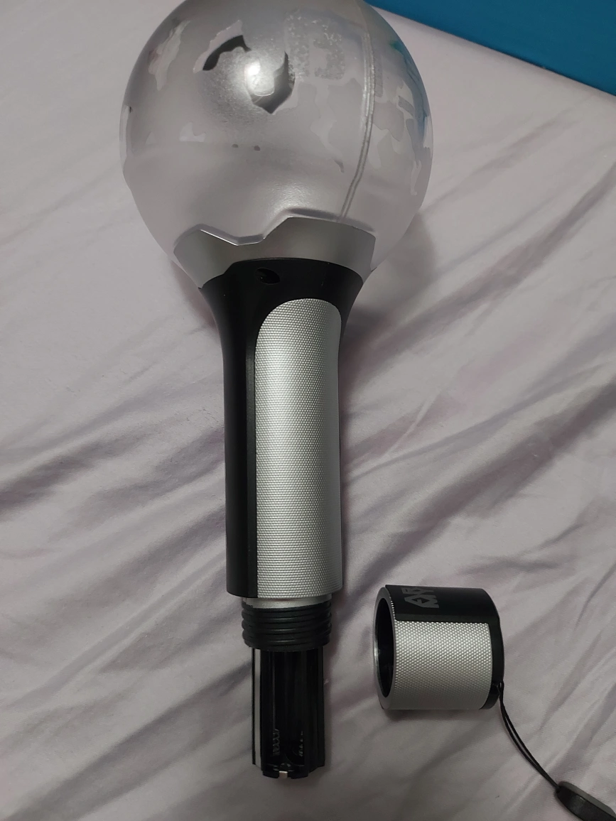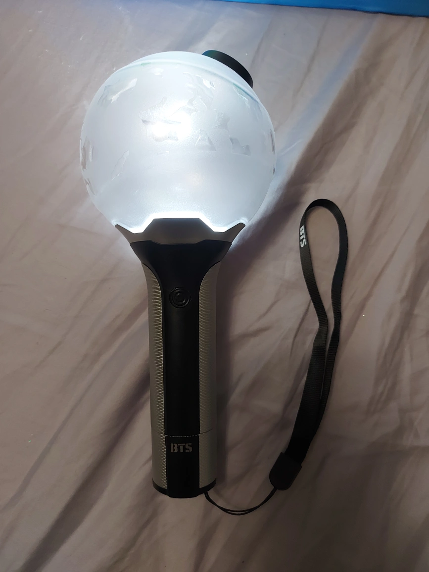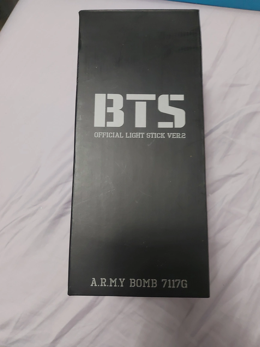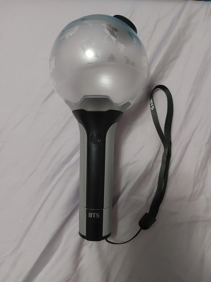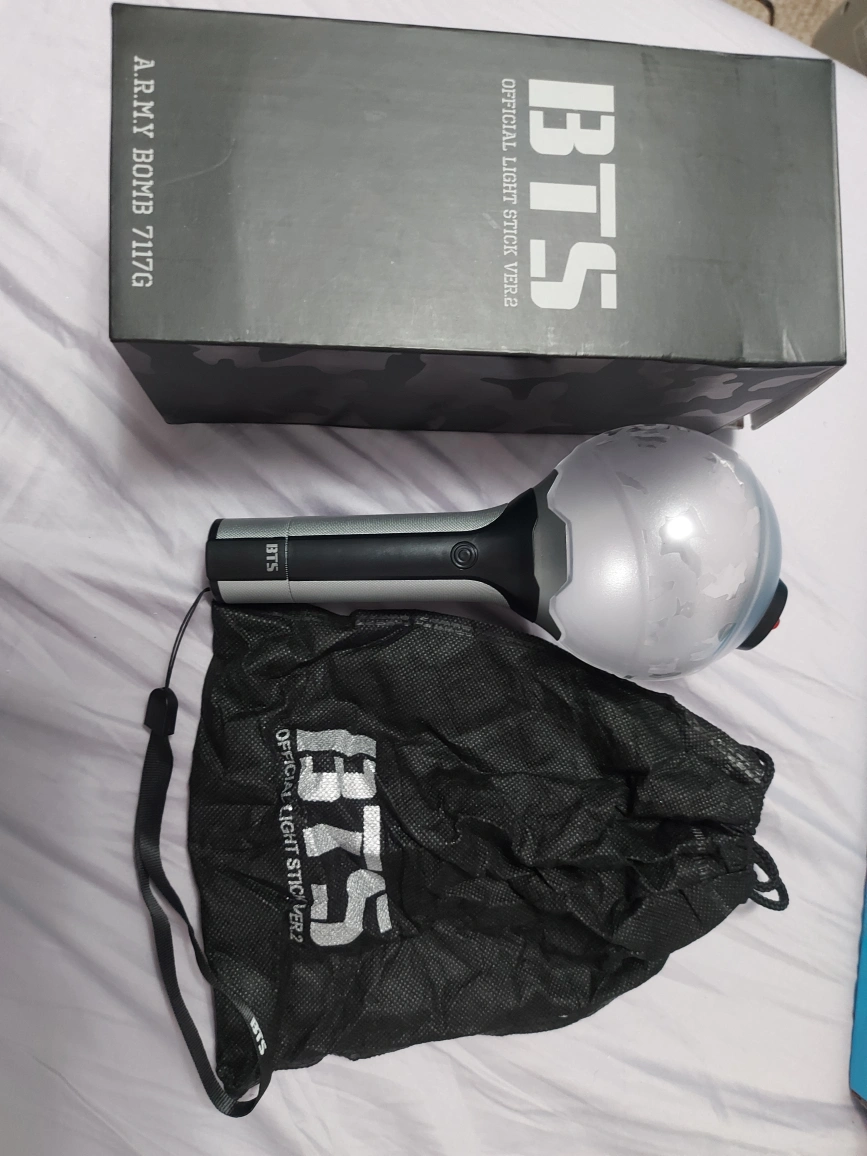 Official BTS light stick, version 2, in great condition. Includes box, light stick with strap and mesh carry bag. Requires 3AAA batteries not included.
