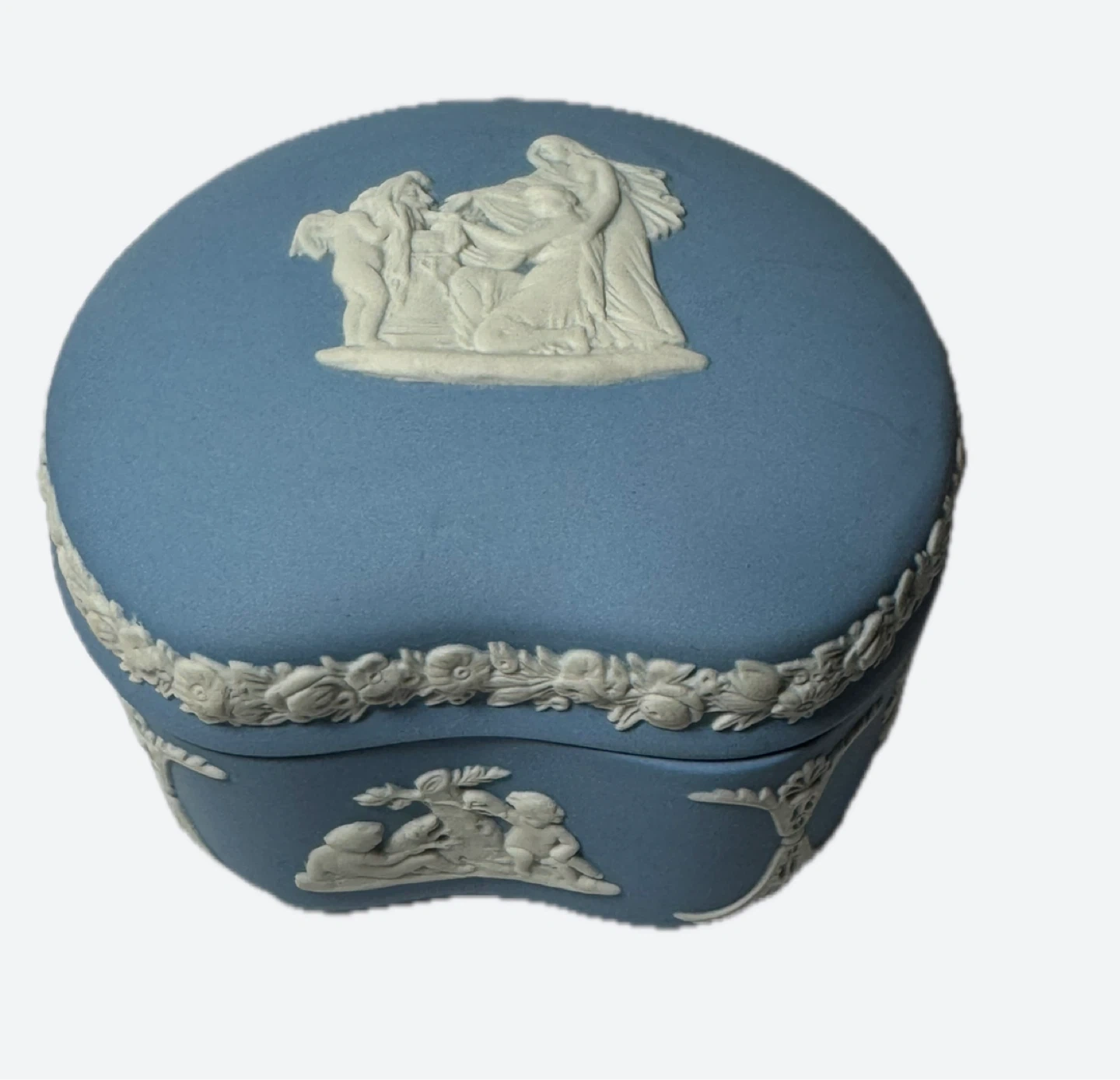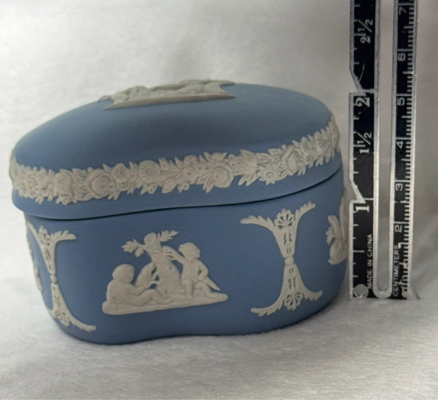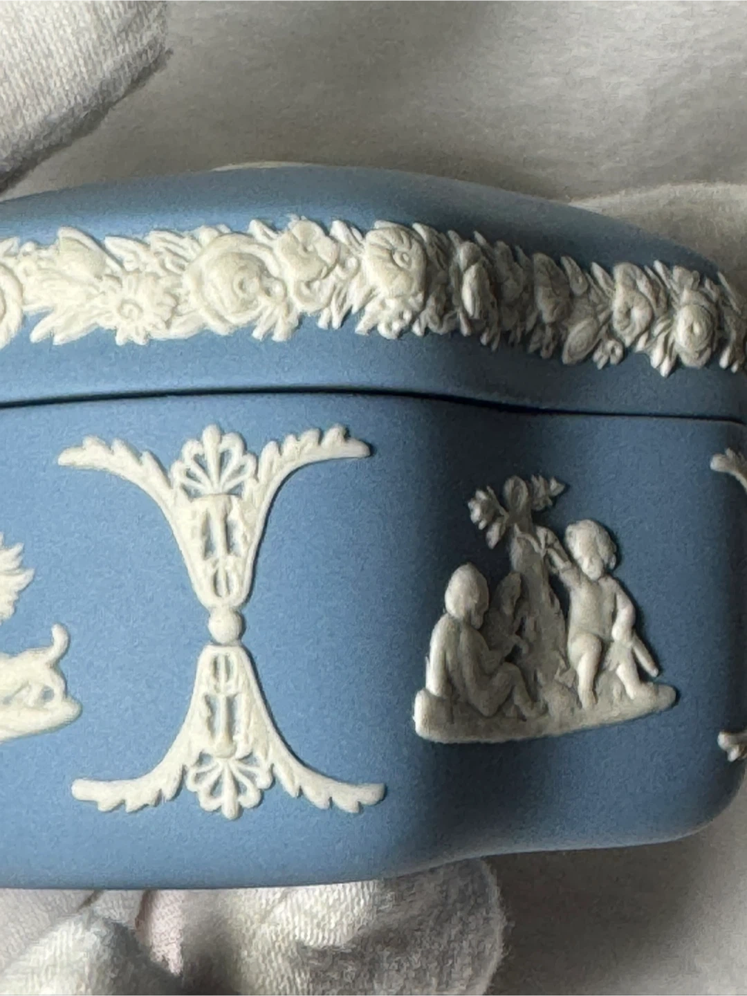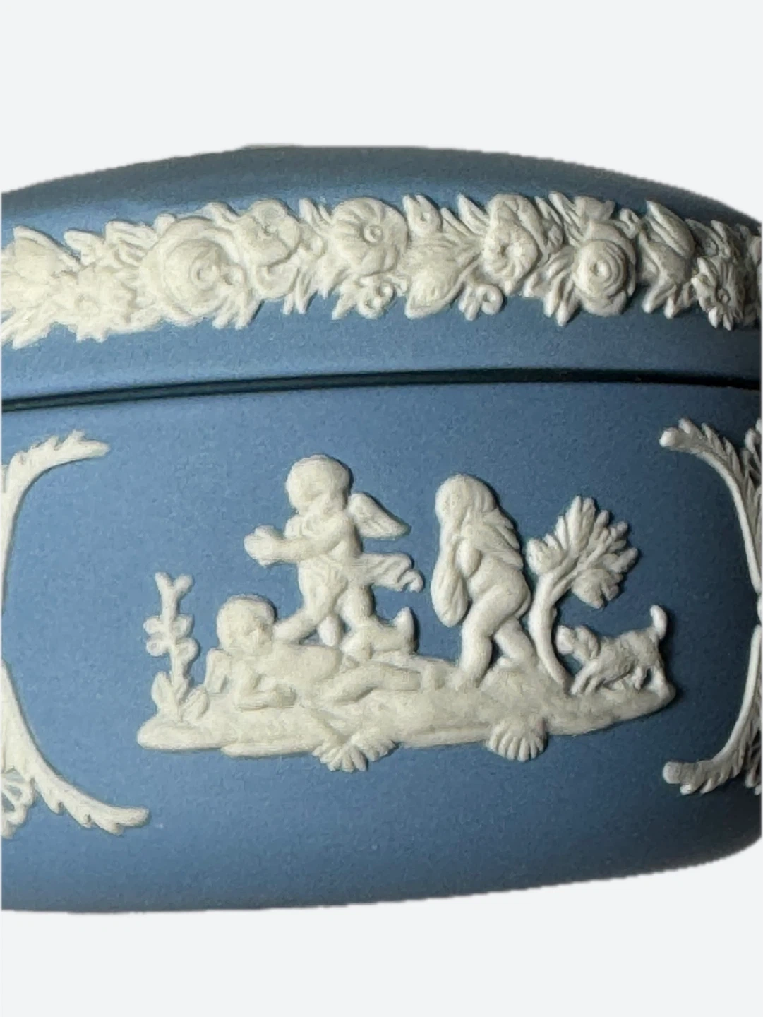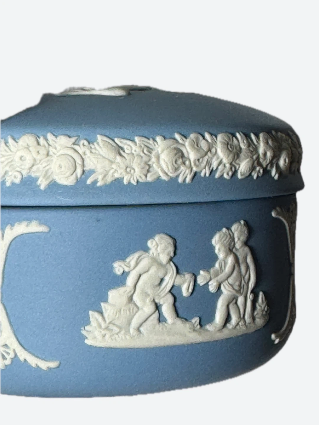Beautiful blue Jasperware trinket box adorned with white cherub and floral reliefs.