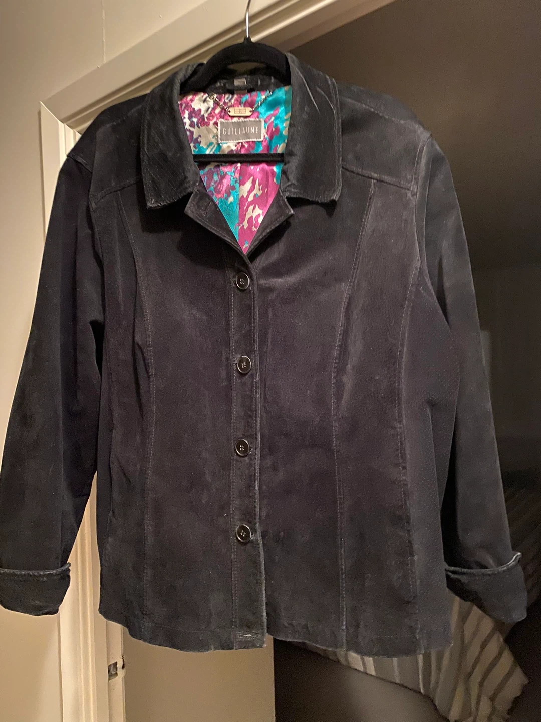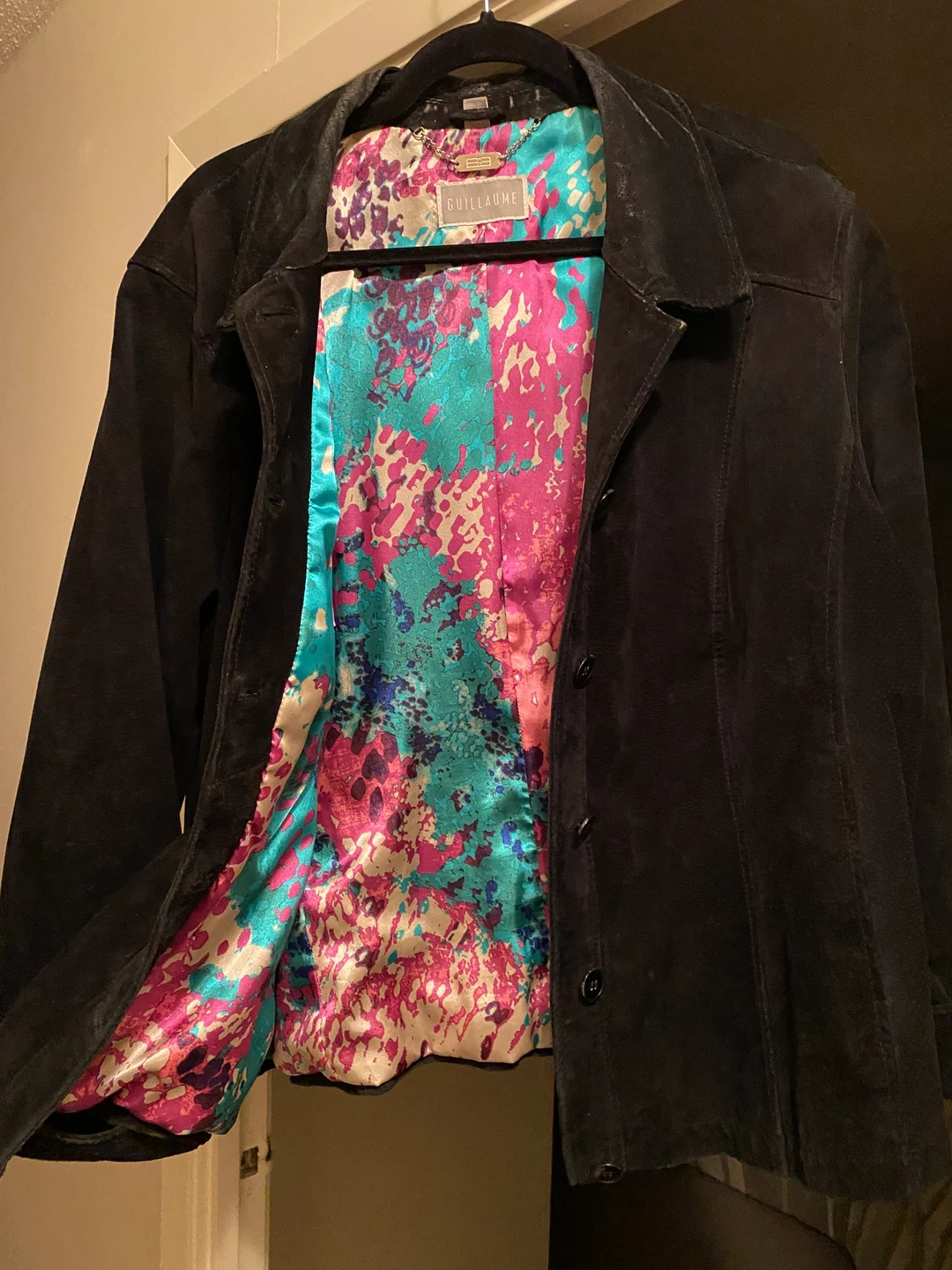 This is a stylish black suede jacket. It's lined with a colourful abstract print in shades of turquoise, pink, and white. The jacket features a classic button-up front and collar.