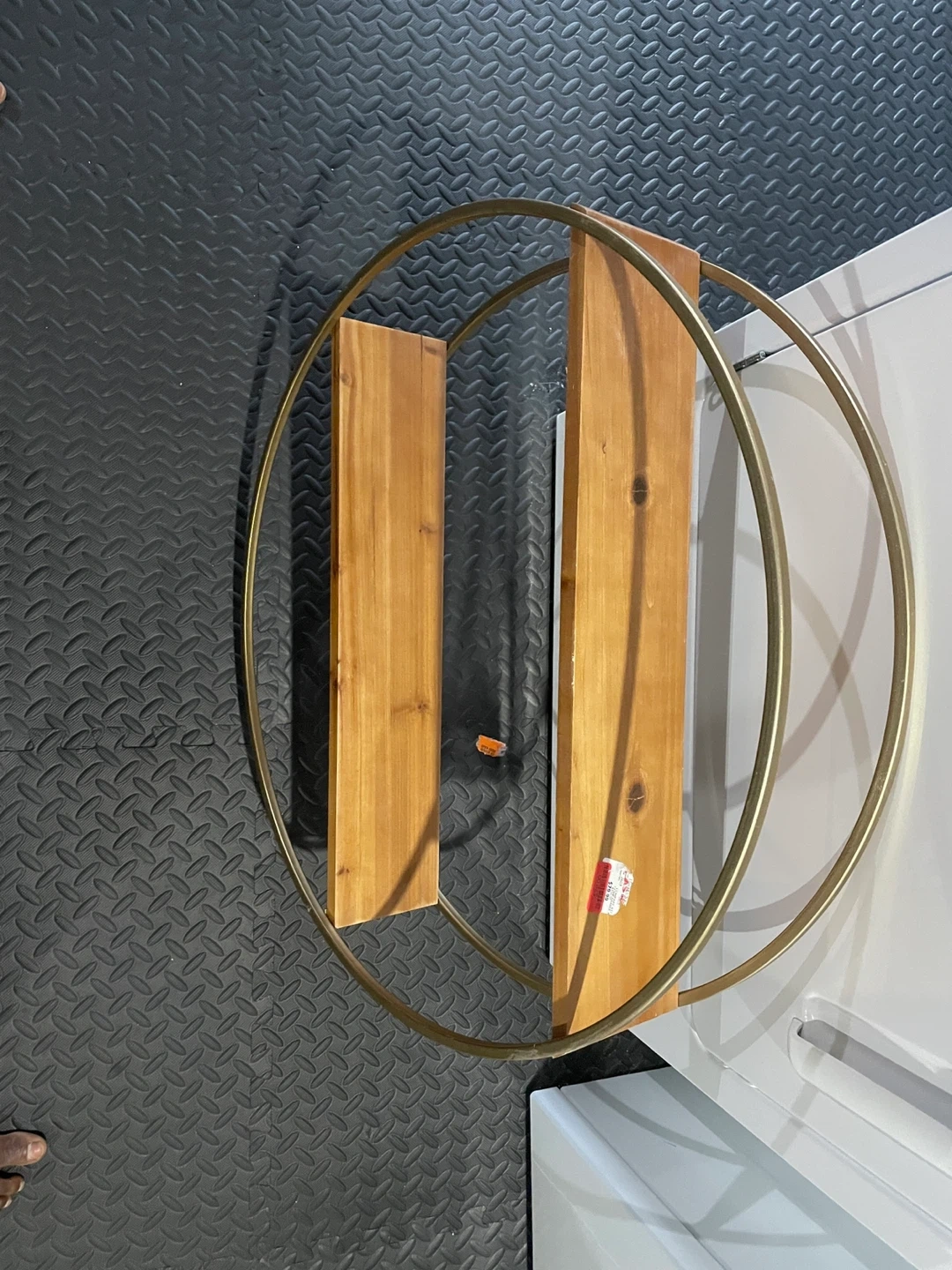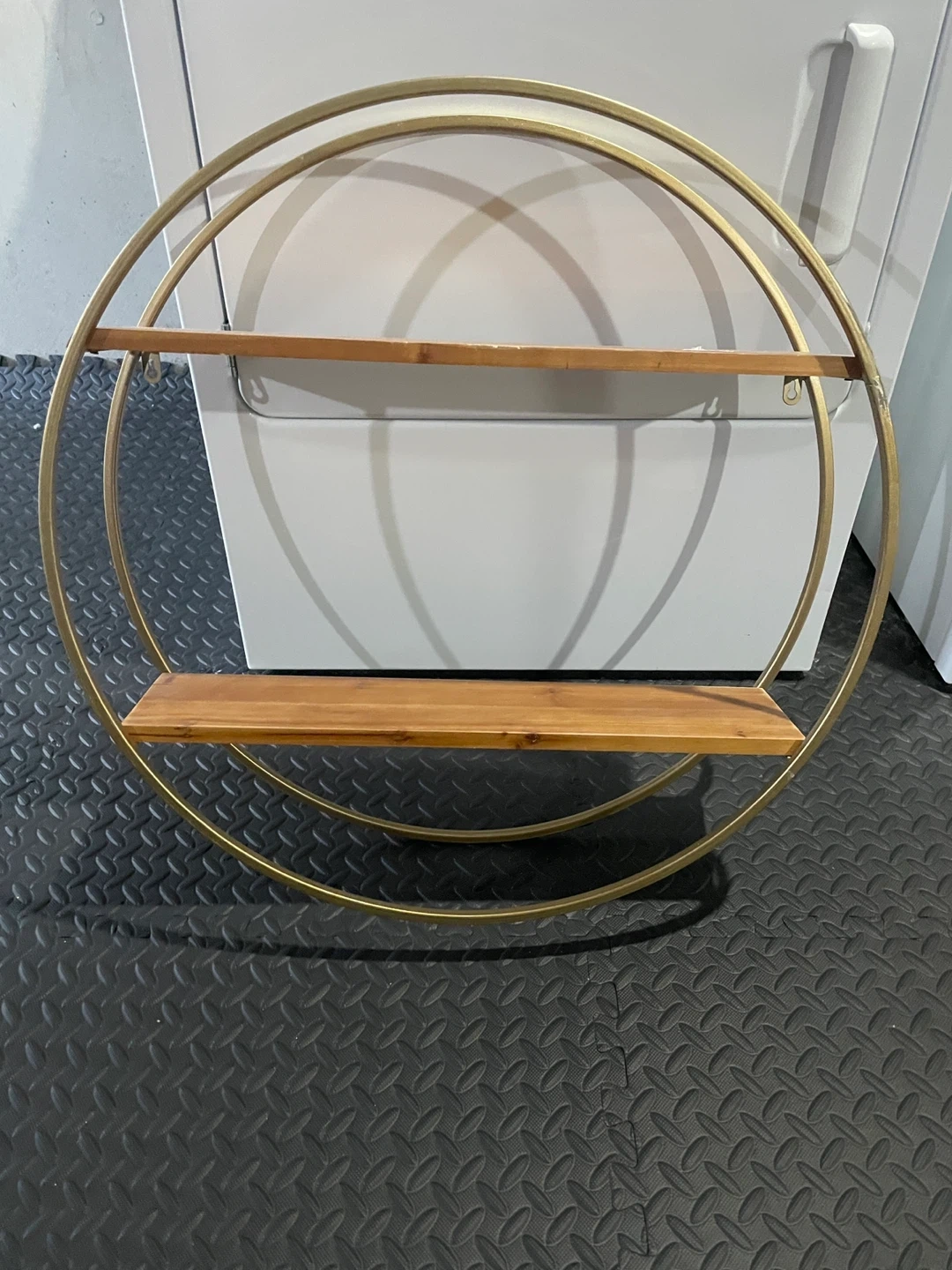 A unique circular wall shelf featuring two wooden planks. This piece combines a modern metal frame with natural wood elements. It's great for displaying decorative items or small plants.