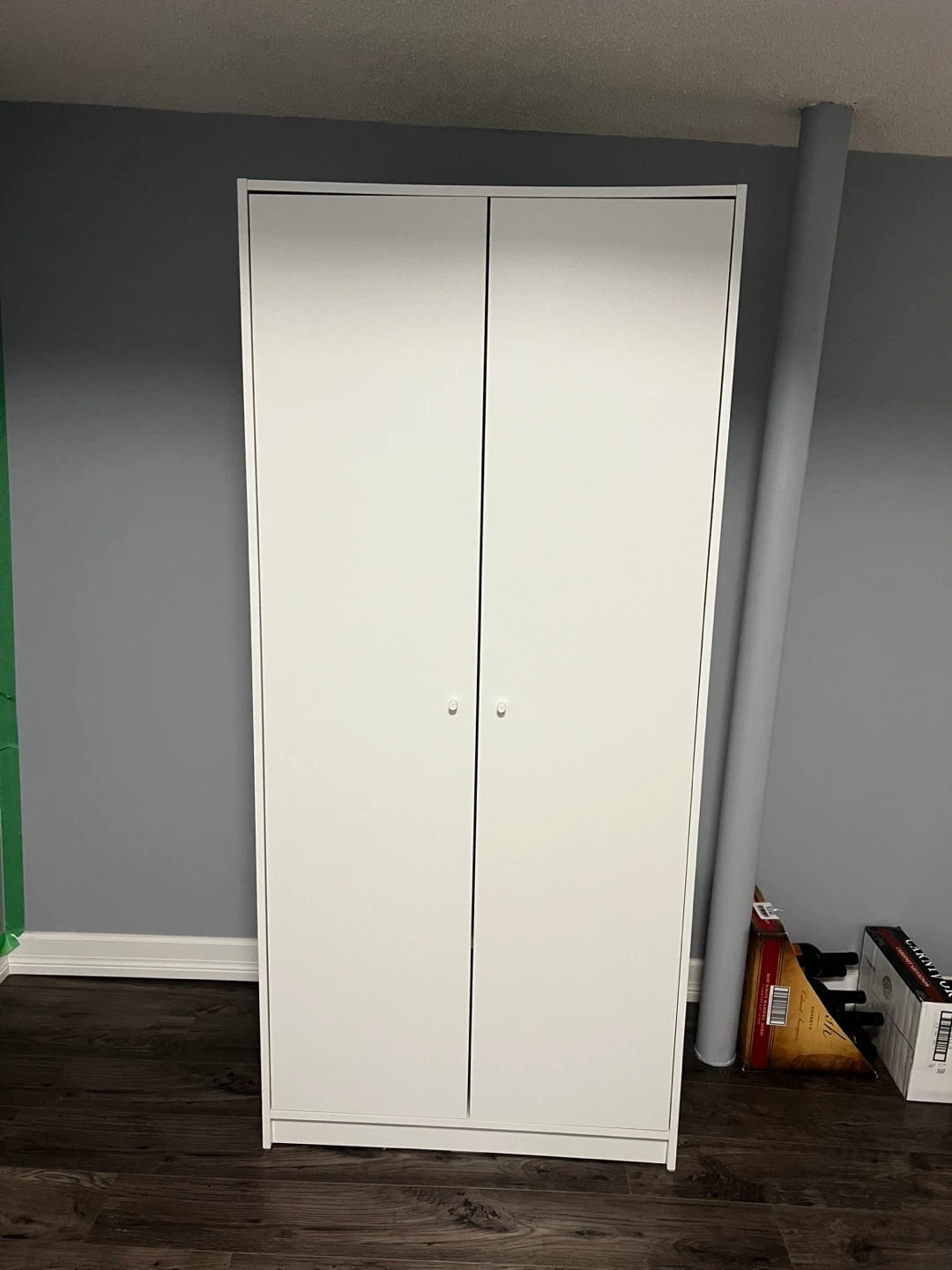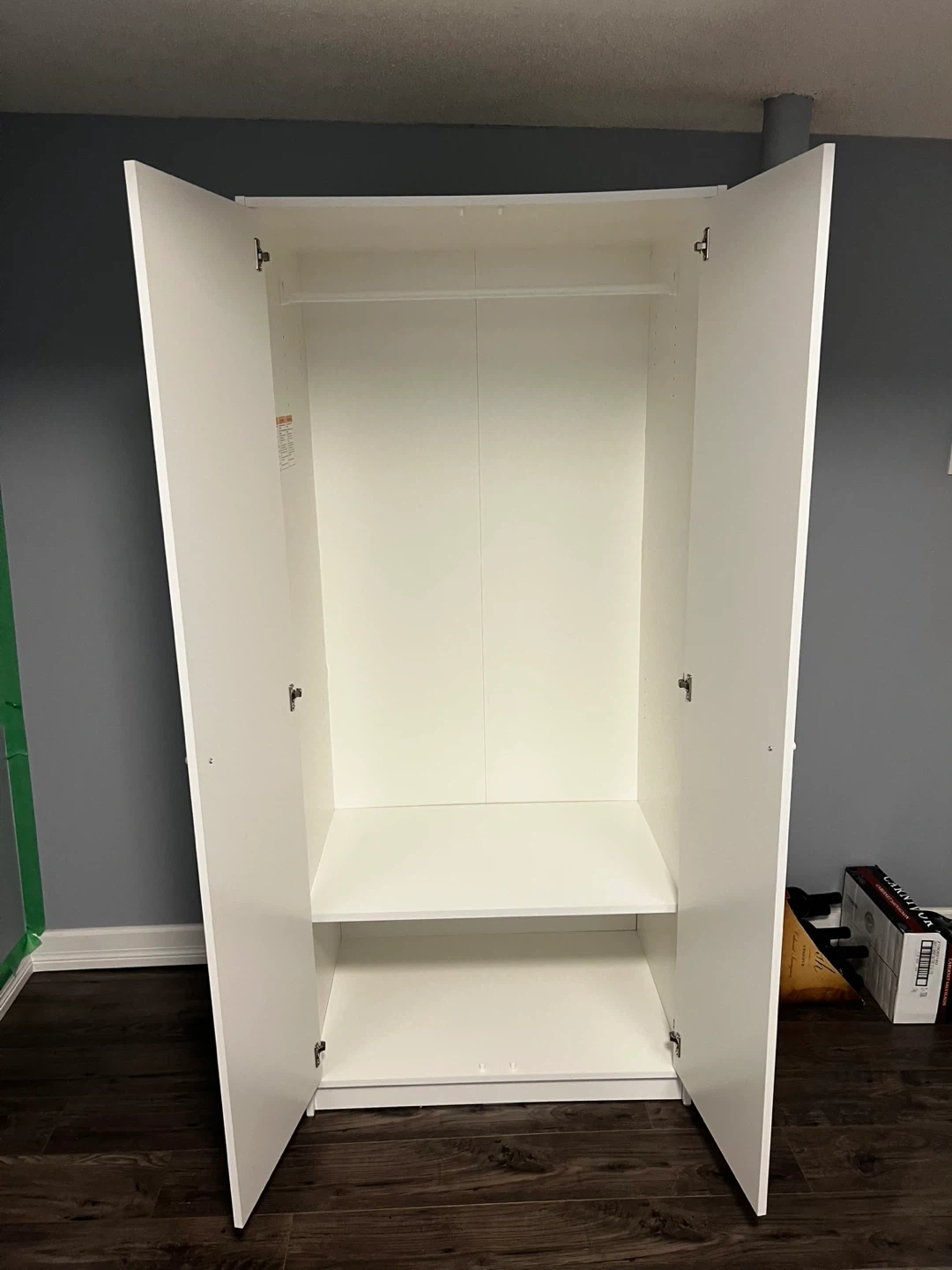 A clean white double door wardrobe with a hanging rail and a shelf. It's perfect for storing clothes and linens. The interior is bright white, offering a spacious feel.