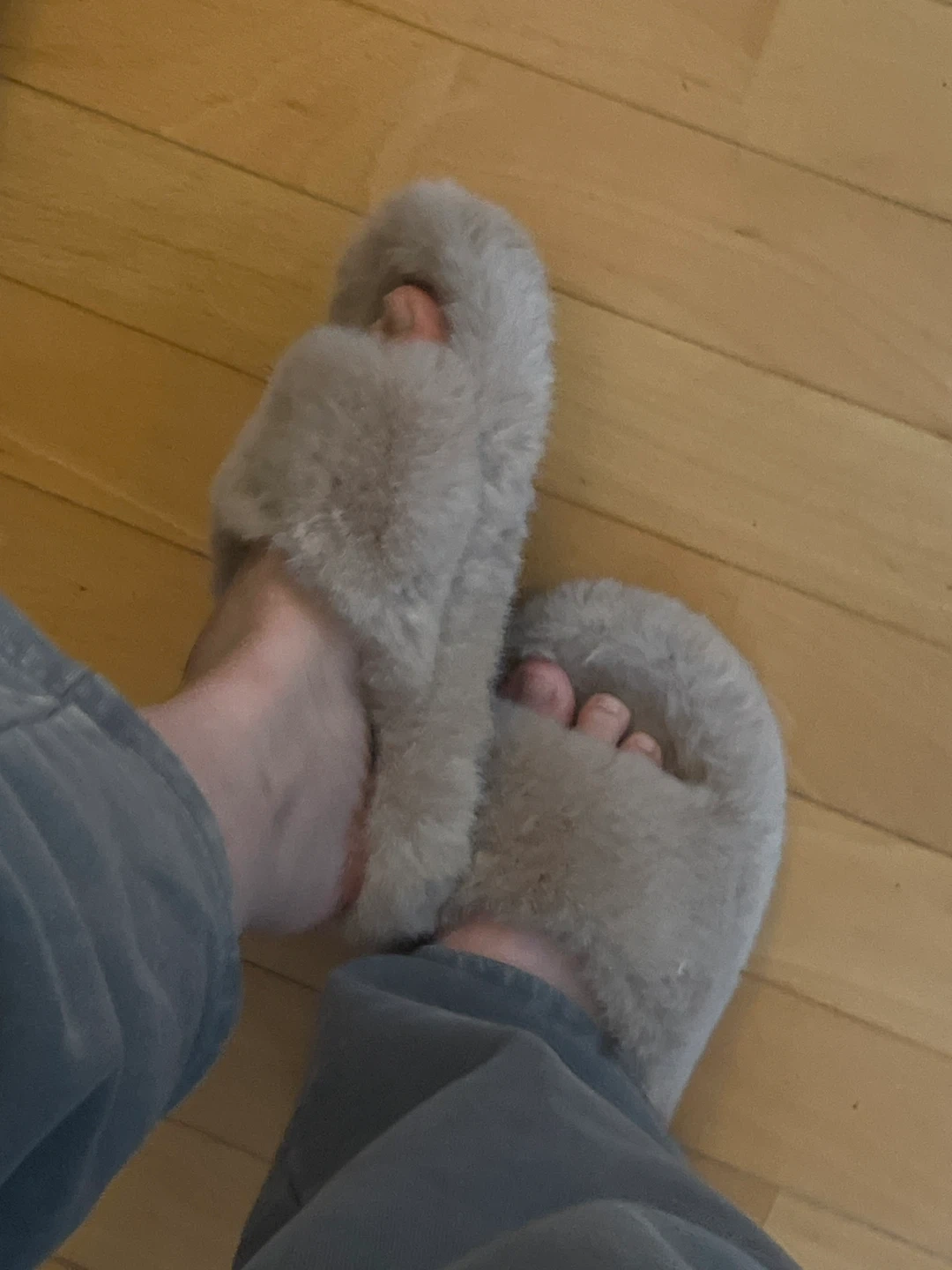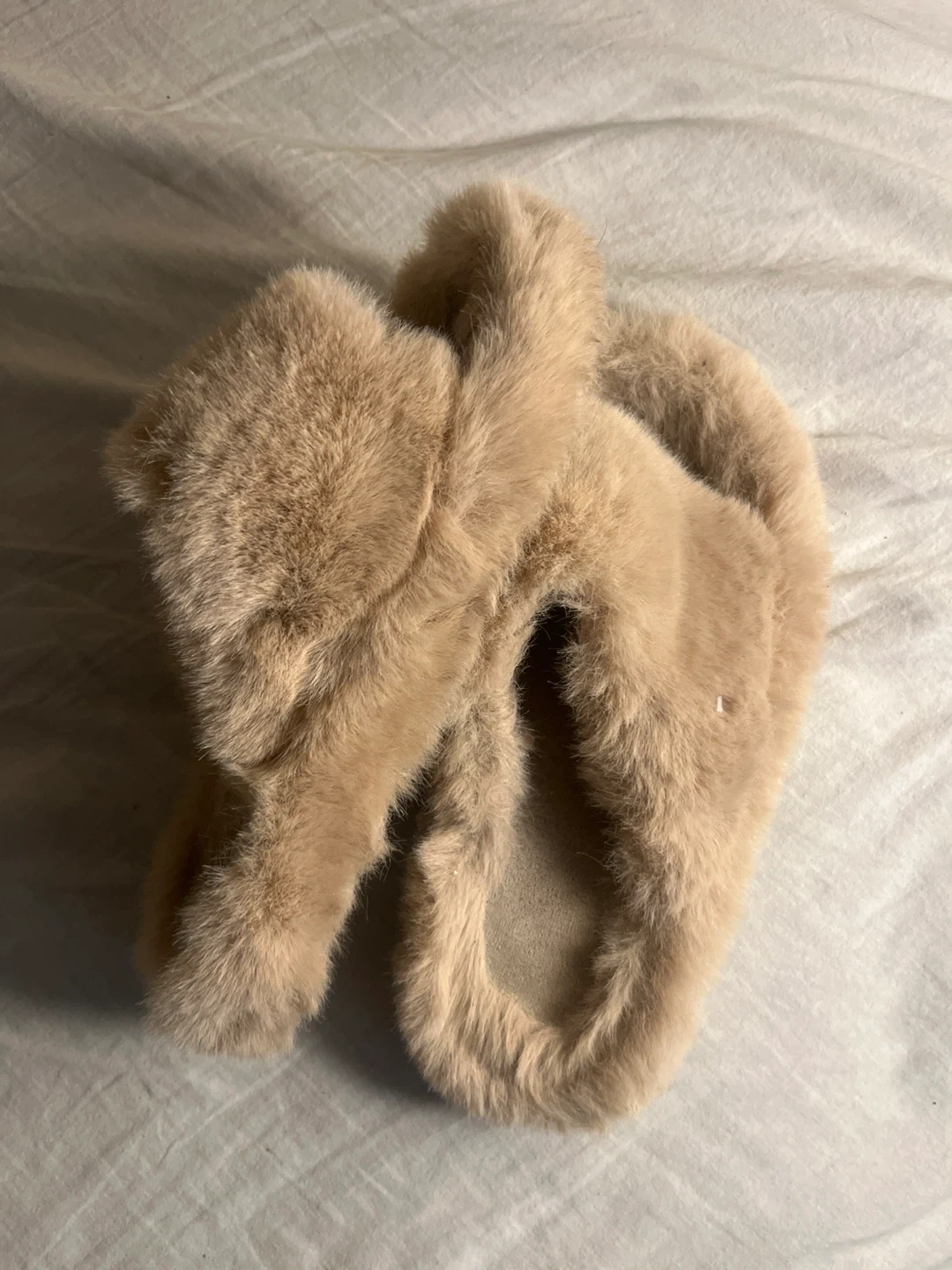 Comfy, fluffy slippers in a neutral beige colour. Plush faux fur on the outside with a soft lining inside. These slide-on slippers offer cozy warmth for your feet. Size is medium. No need anymore, I got new one. Pls message if interested.