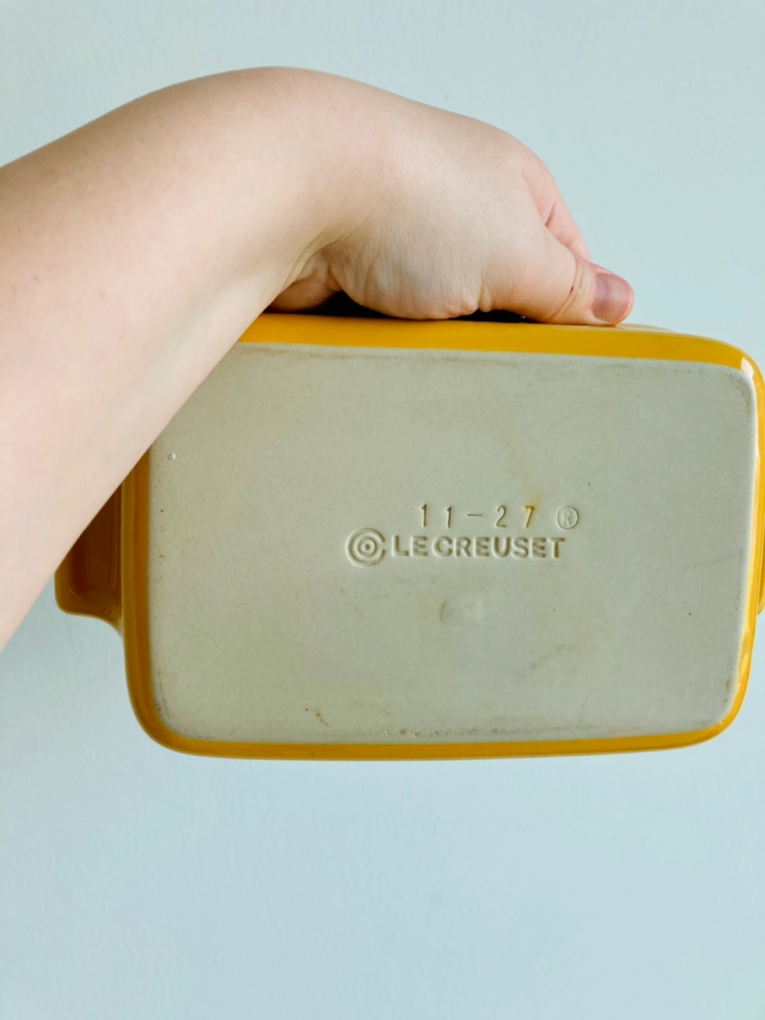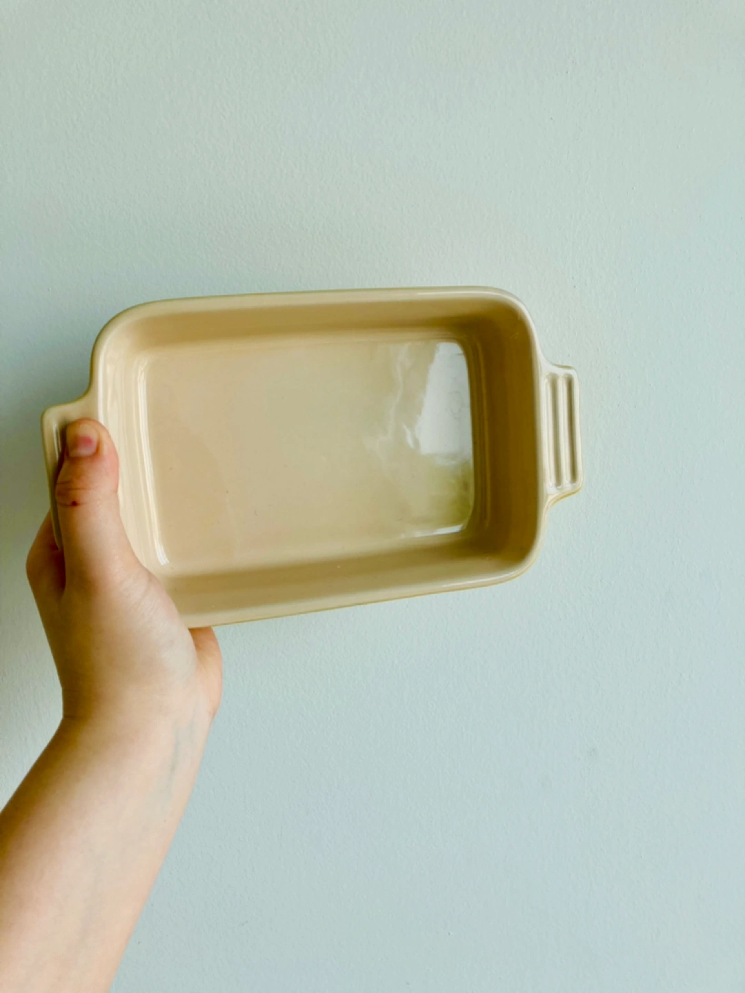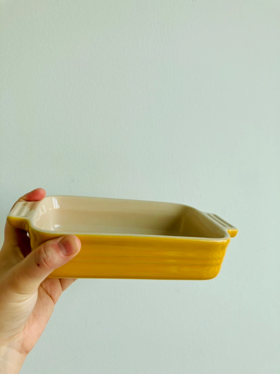 Yellow 16 oz casserole/baker with a yellow exterior and off white interior. Stoneware. Measures 7" in length( 8.75 with handles), 5" wide x 1.5" high, In Excellent condition.