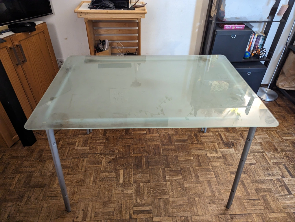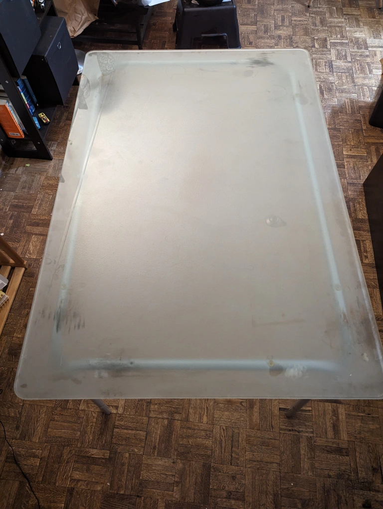 Well used Glass table still in a good condition. Trying to get rid of stuff. So please feel free. Glass can be separated from the legs and moved. Price is negotiable and please take care of the pick up.