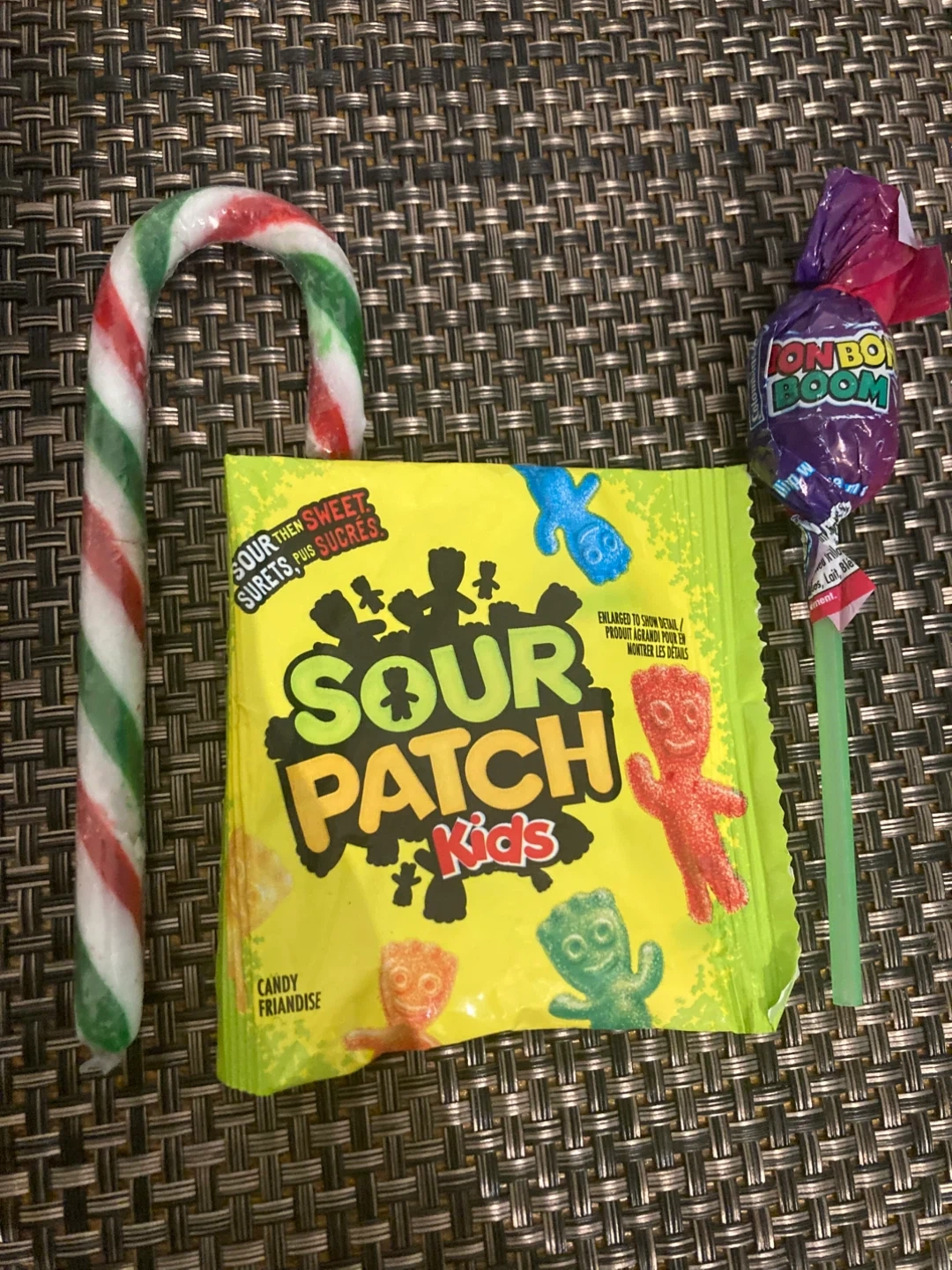 This bundle includes a bag of Sour Patch Kids candy and an On-Go Boom lollipop. The Sour Patch Kids bag is the classic sour then sweet gummy candy. Perfect for satisfying your sweet and sour cravings!