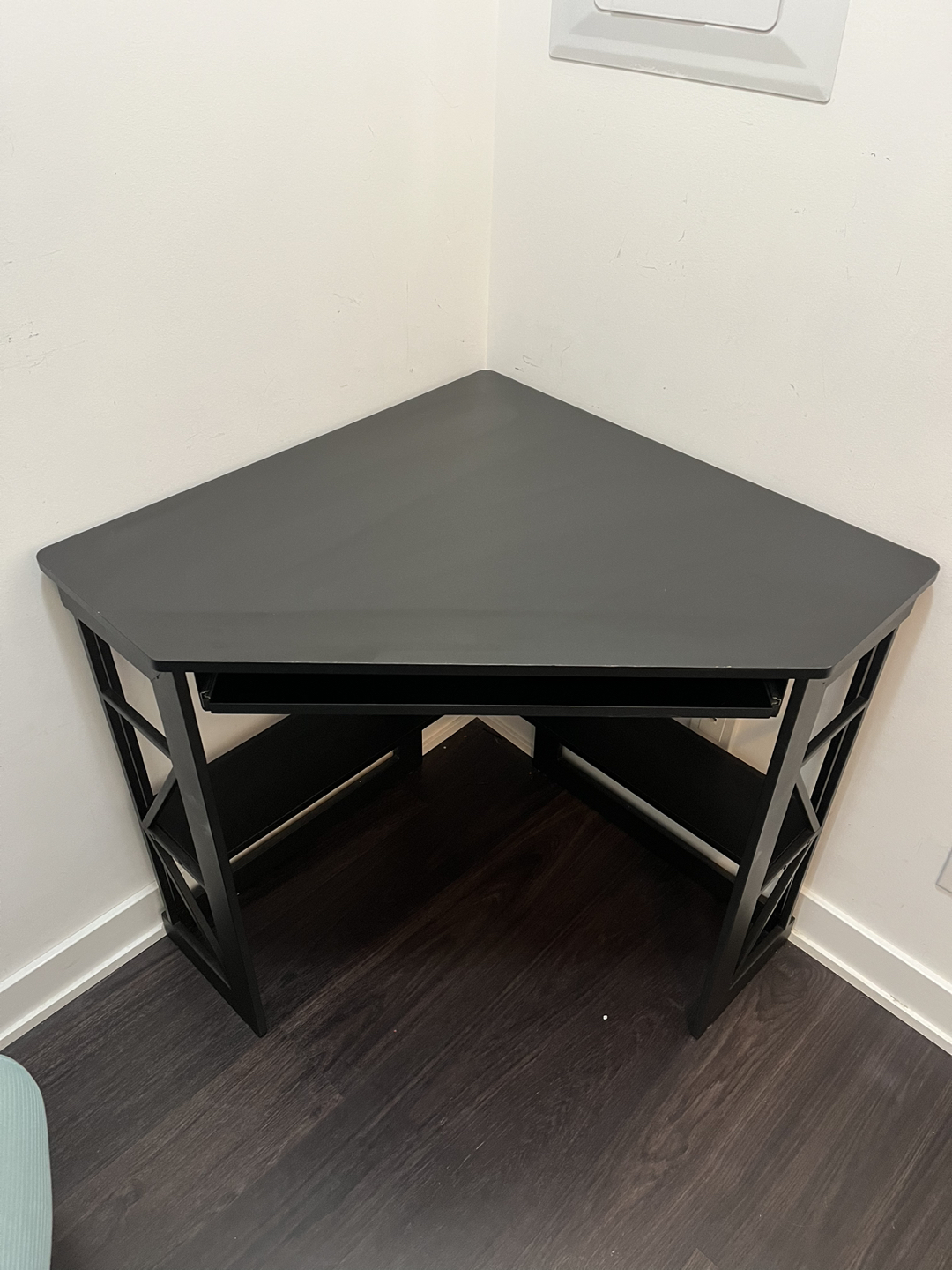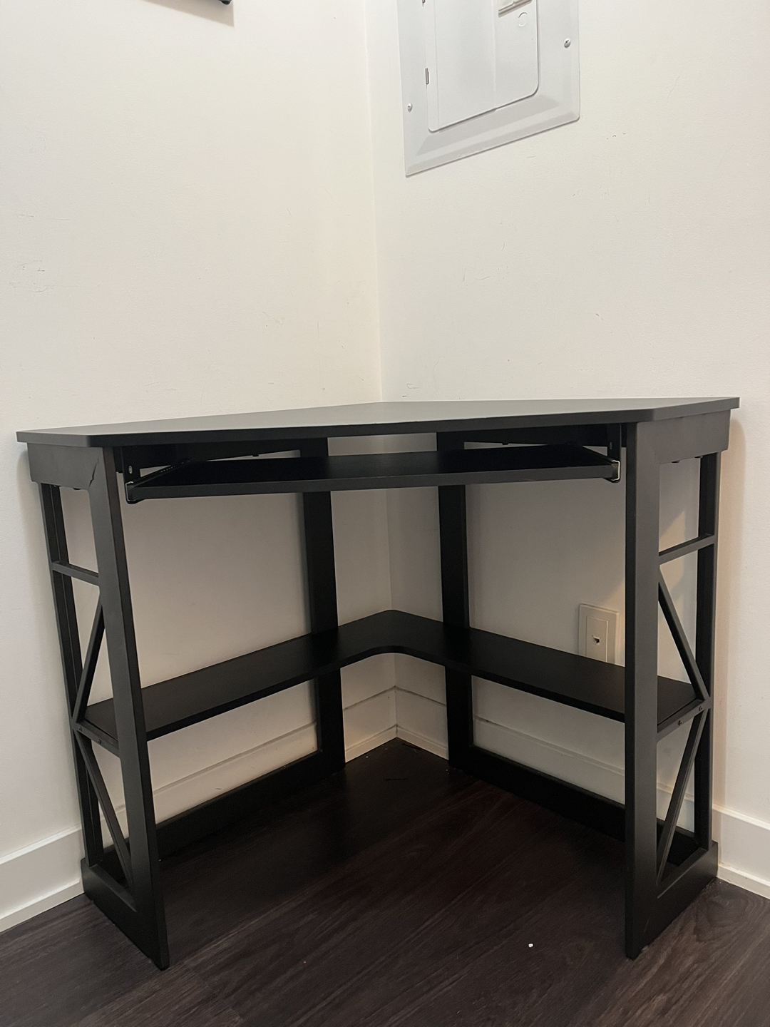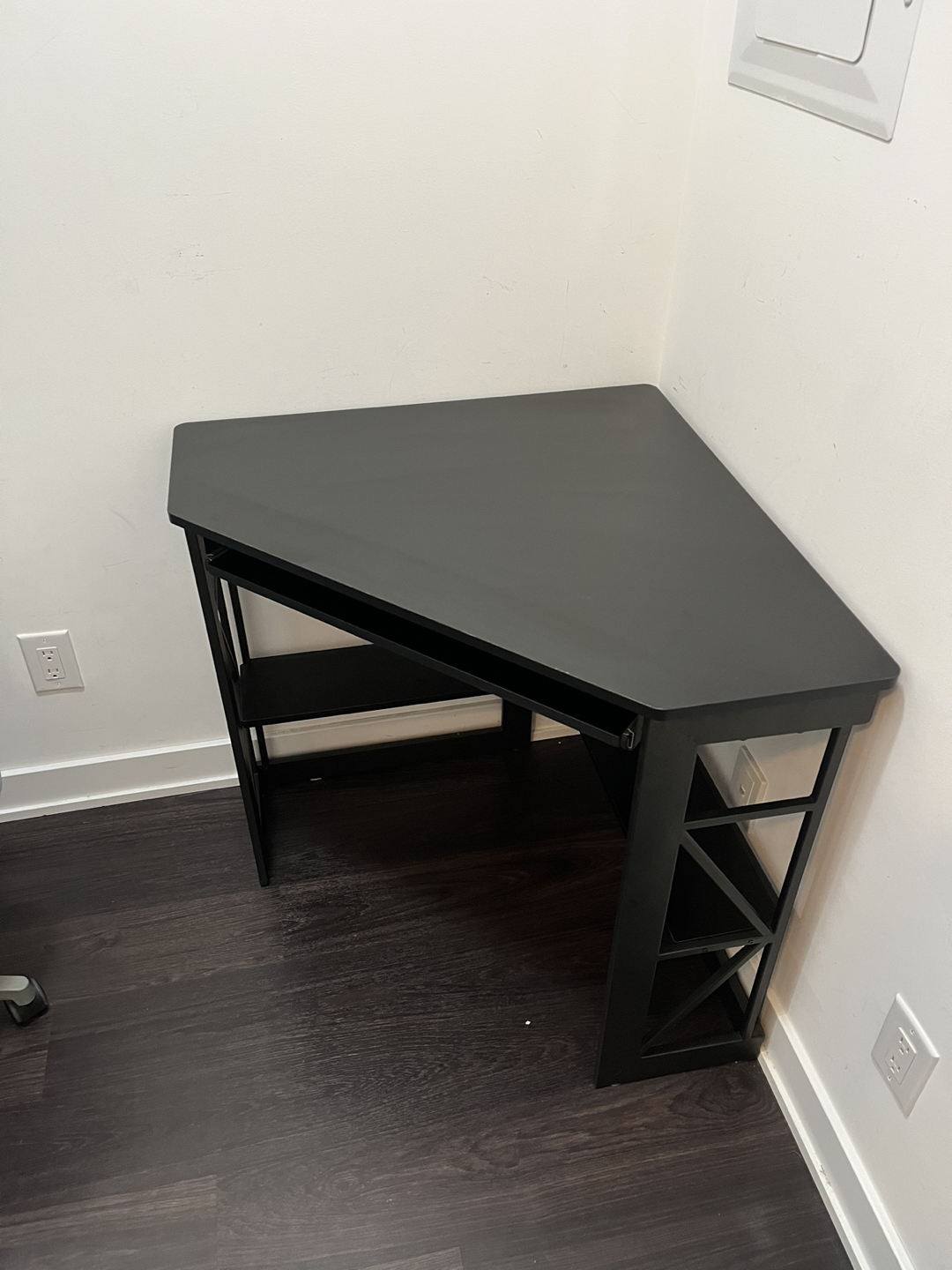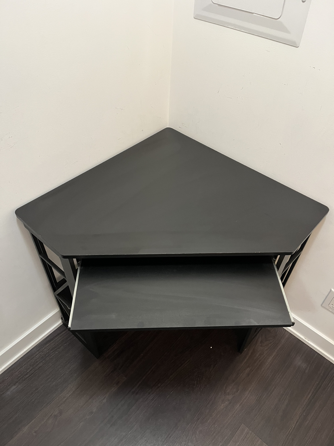 Small corner desk like new (1 year old). It’s black. Has a pull out keyboard surface.