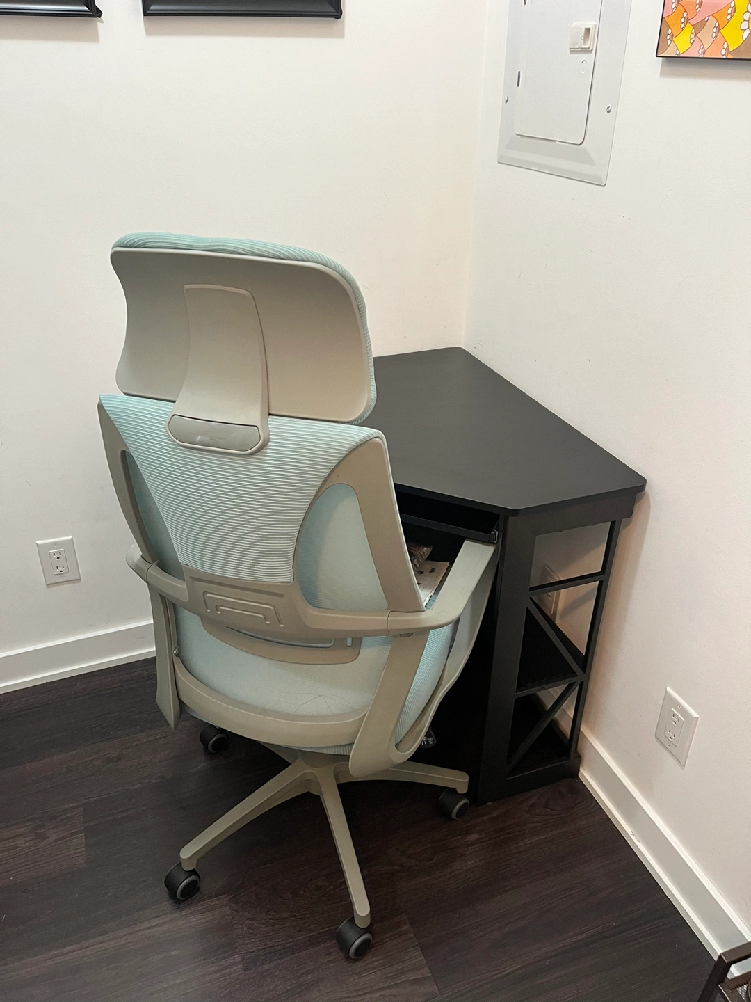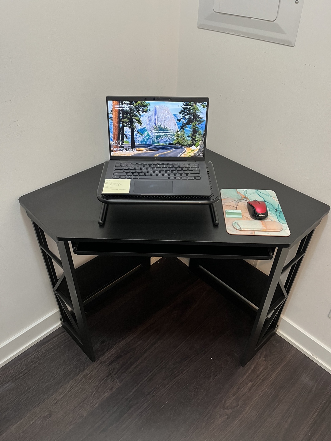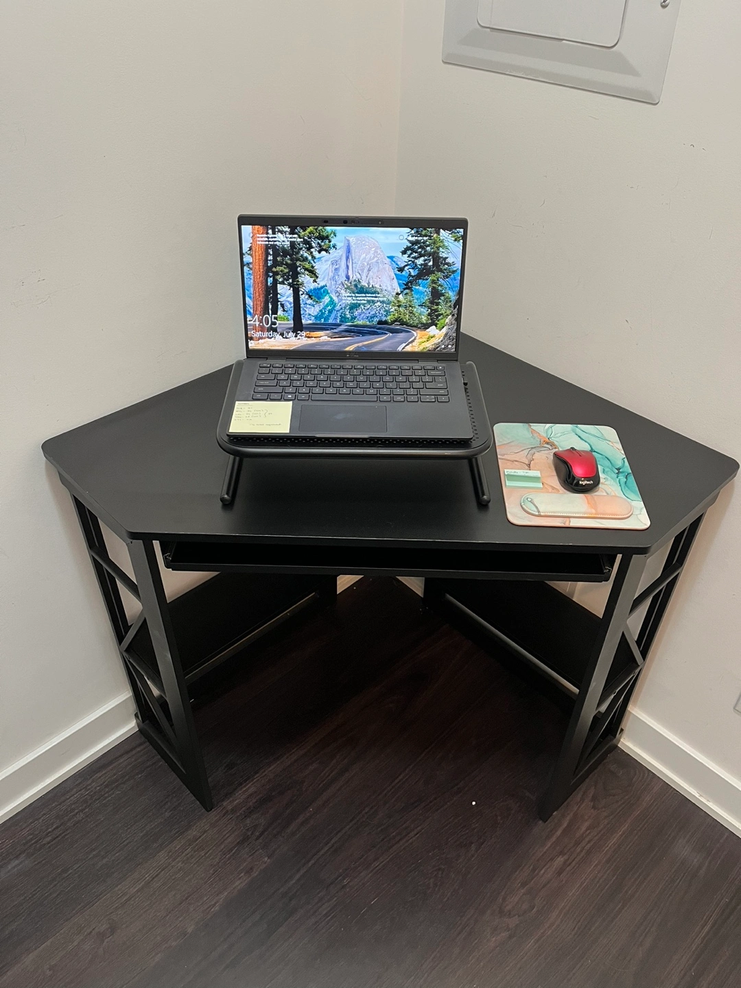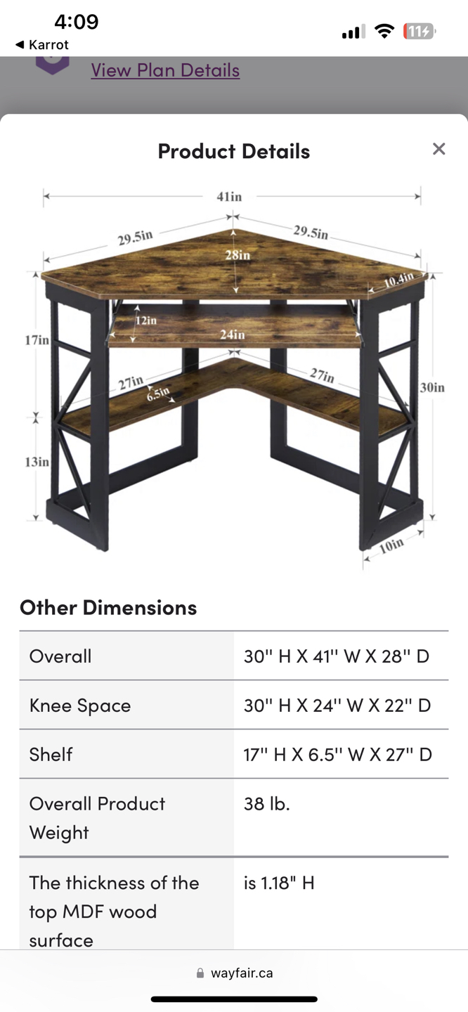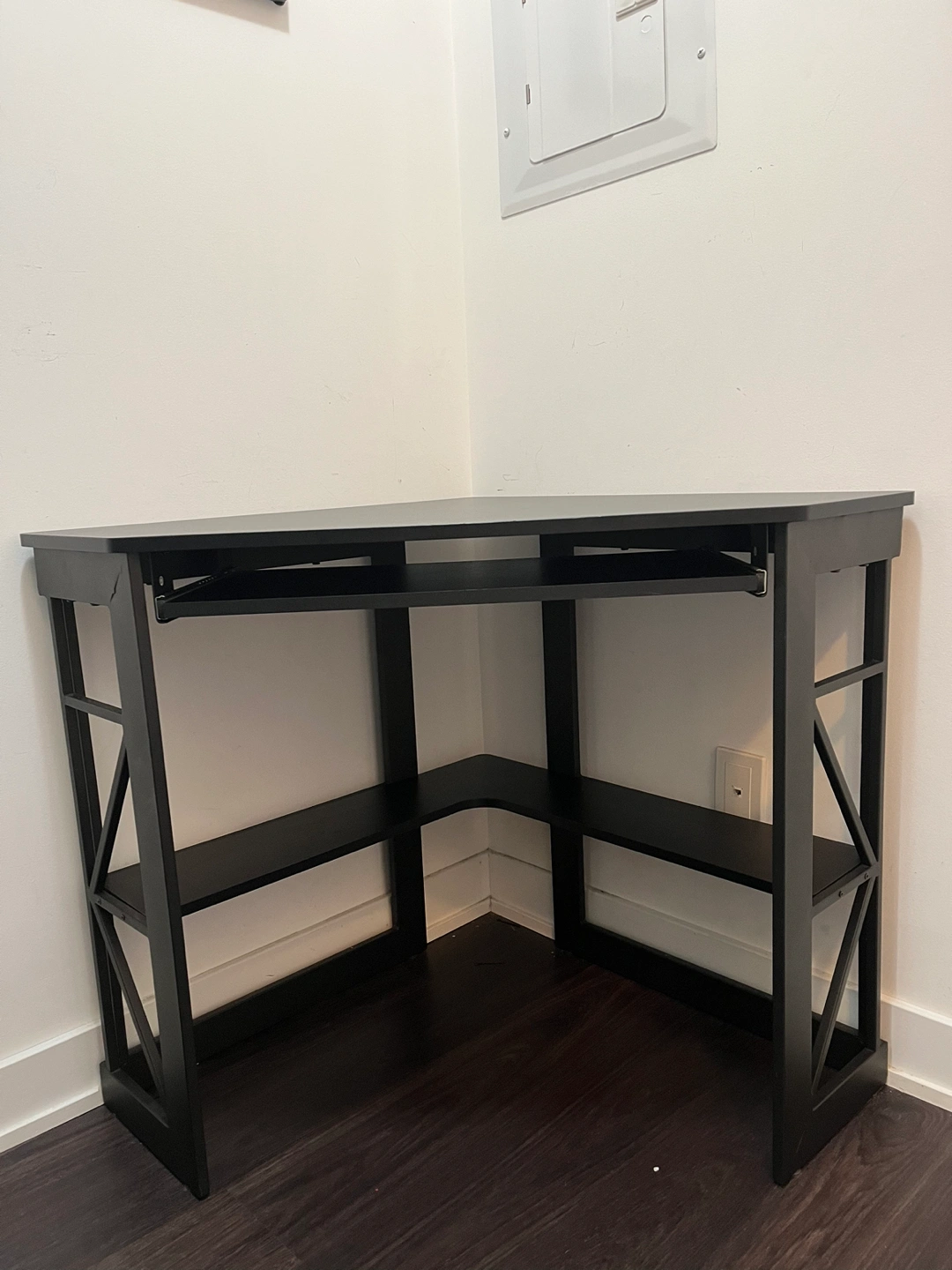 Small corner desk like new (1 year old). It’s black. Has a pull out keyboard surface.