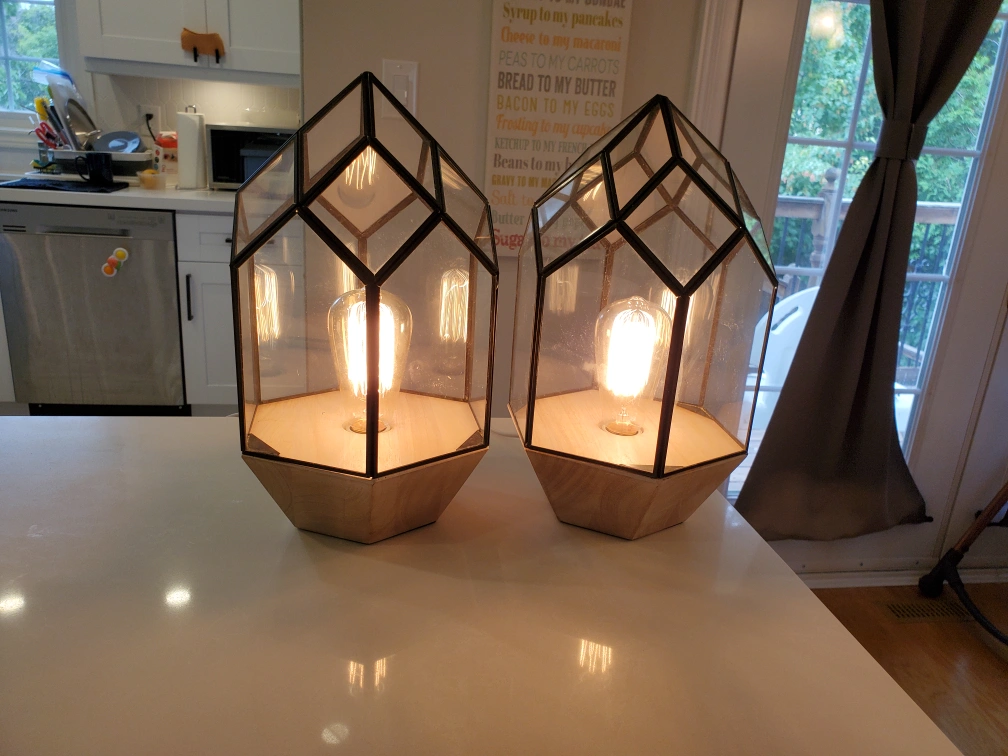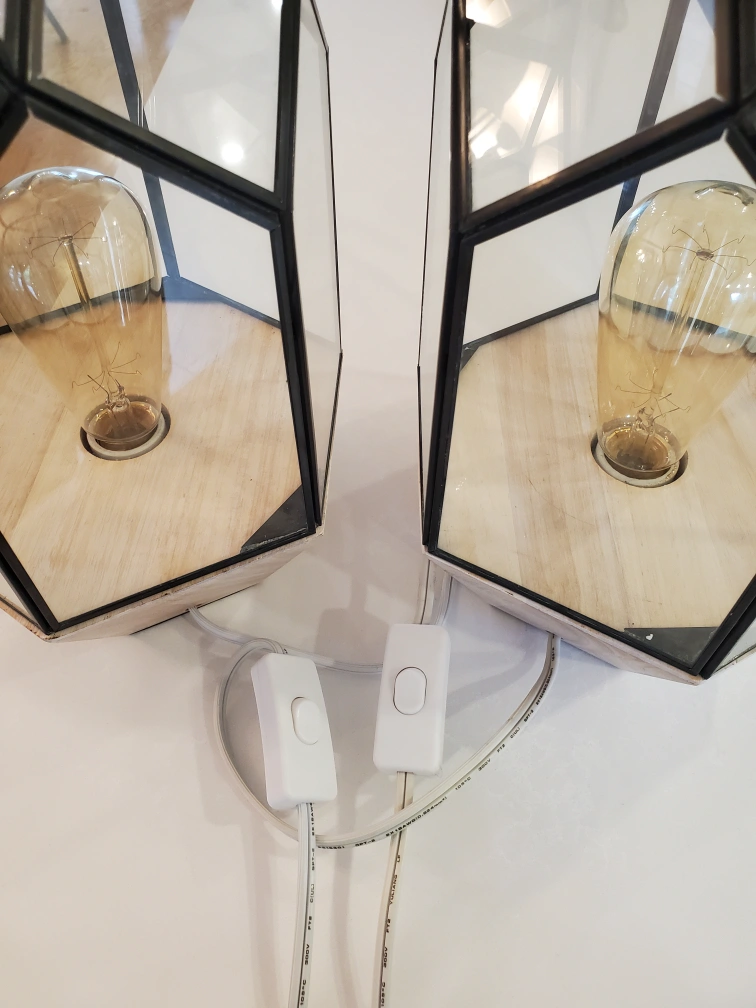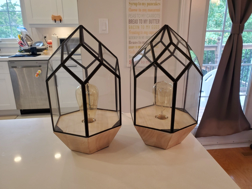 Two (2) geometric domed clear glass with black metal frame and real wood base table lamps. Both for $75. Edison bulbs included.