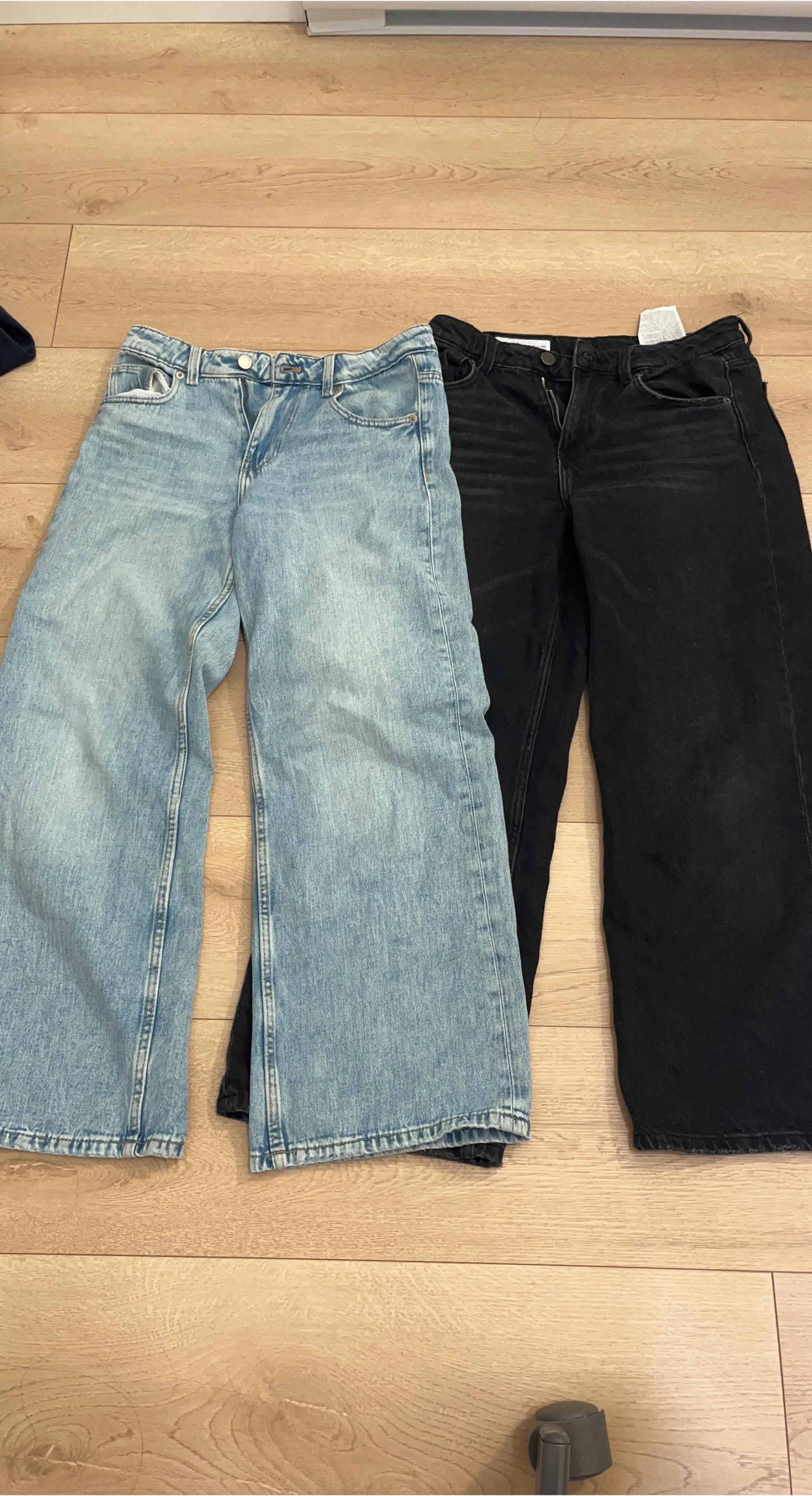 Two pairs of Zara wide leg jeans, one in a light wash and the other in black. Both are size 11-12 and perfect for those who are around 152 cm! The black one has a tiny rip on the side so I adjusted the price !