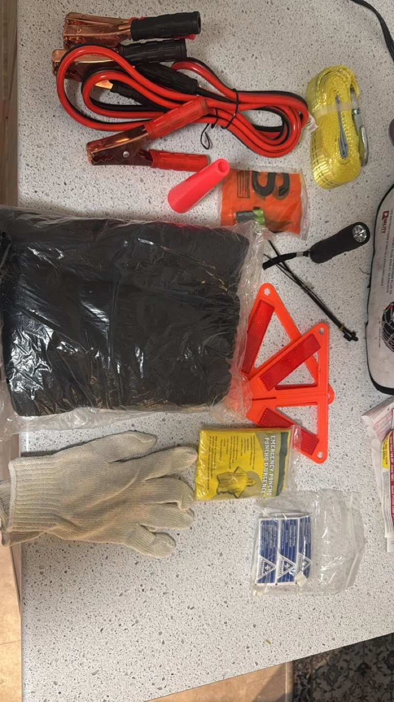 This 47-piece emergency car kit includes jumper cables, gloves, a flashlight, and safety triangles. It's a handy roadside assistance kit for your vehicle. Essential for unexpected situations on the road!