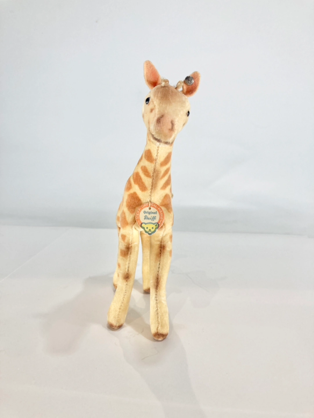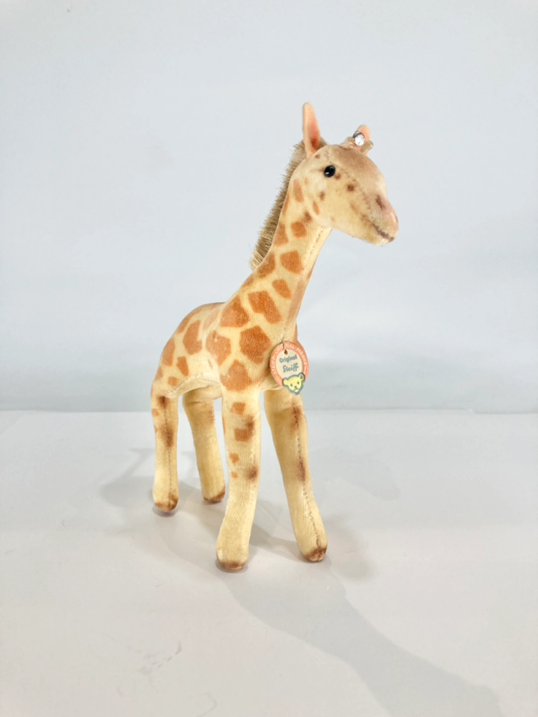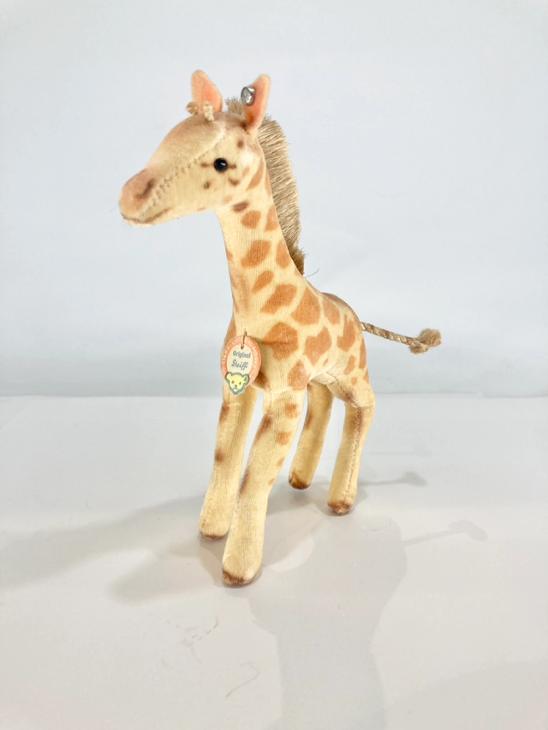 Incredibly cute little giraffe from the renowned Steiff Co. of Germany. Has the iconic ear tag and the rarely surviving paper tag. Stiff bristled mane, glass eyes, sturdy on its feet. Great condition- check out the pictures!