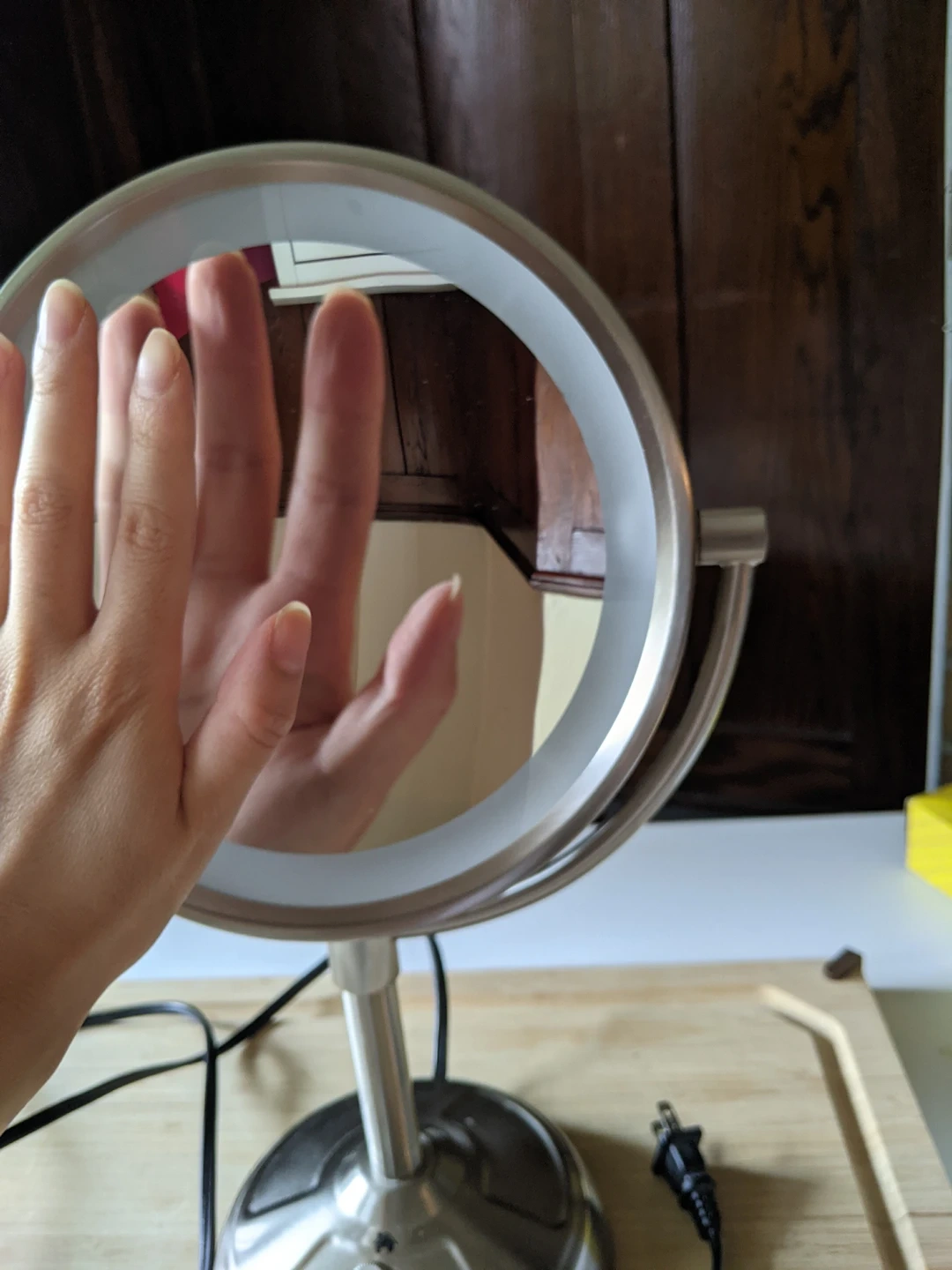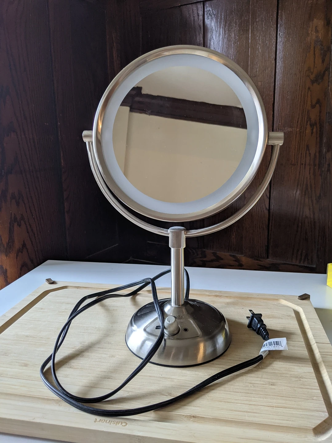 Been using for a few years and lights still work. 3 light settings for office, home and outdoors. 2 sided mirror with 1 of the sides being magnified. Great condition!