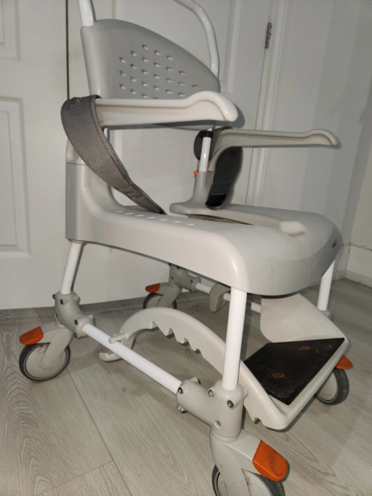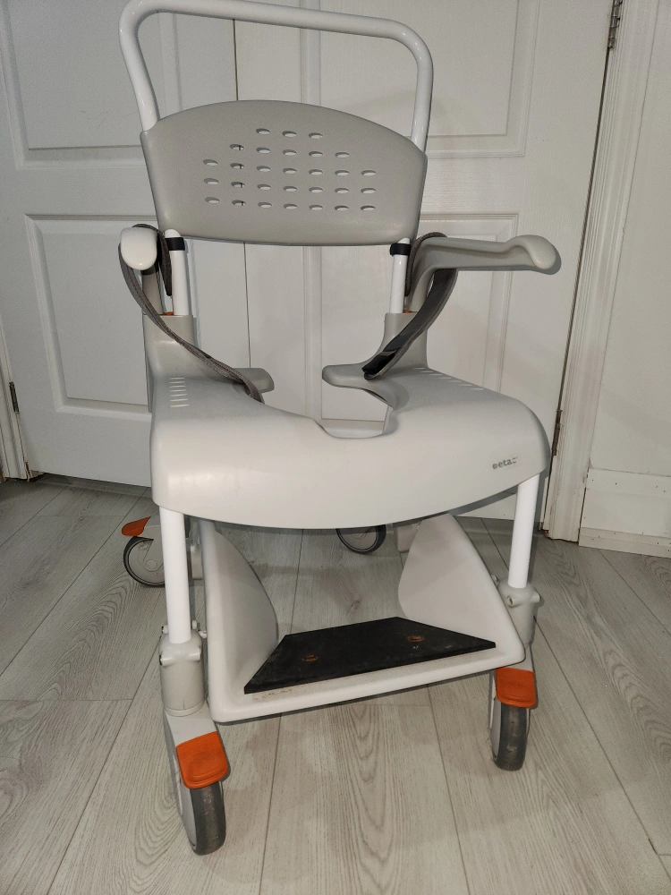 Please see all pics. This chair is designed for its dual purposes. It has a moulded plastic seat and backrest that are durable, easy to clean, and also contoured for optimum comfort. The seat futures an aperture to enable use as an over toilet commode and to enable personal cleaning. Maximum weight 130 kg (286 lbs). Footrest for additional support, four sturdy castors that can be locked for security. Dual armrest for lateral support. Great to provide homesupport to your love one. Smoke-free home. Available for pickup near Martin Grove and Westway . Welcome to see my other listings.