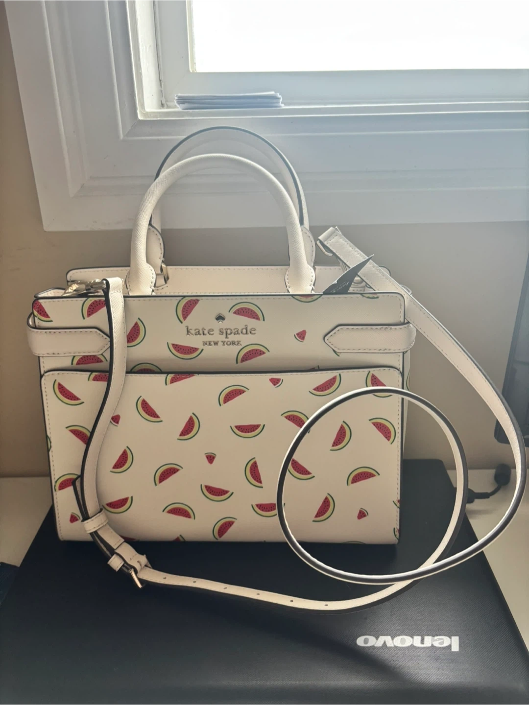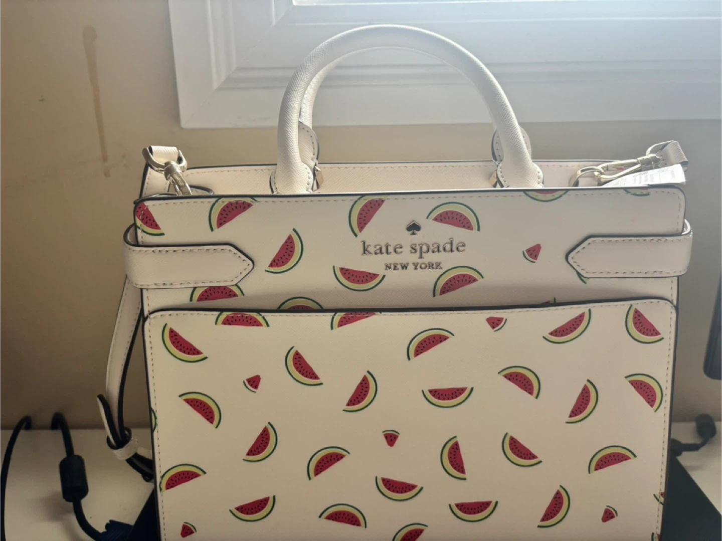 A Kate Spade New York satchel bag with a fun watermelon print. It's white with a watermelon design and has dual top handles with an adjustable shoulder strap. This bag is perfect for adding a pop of colour to your everyday style!