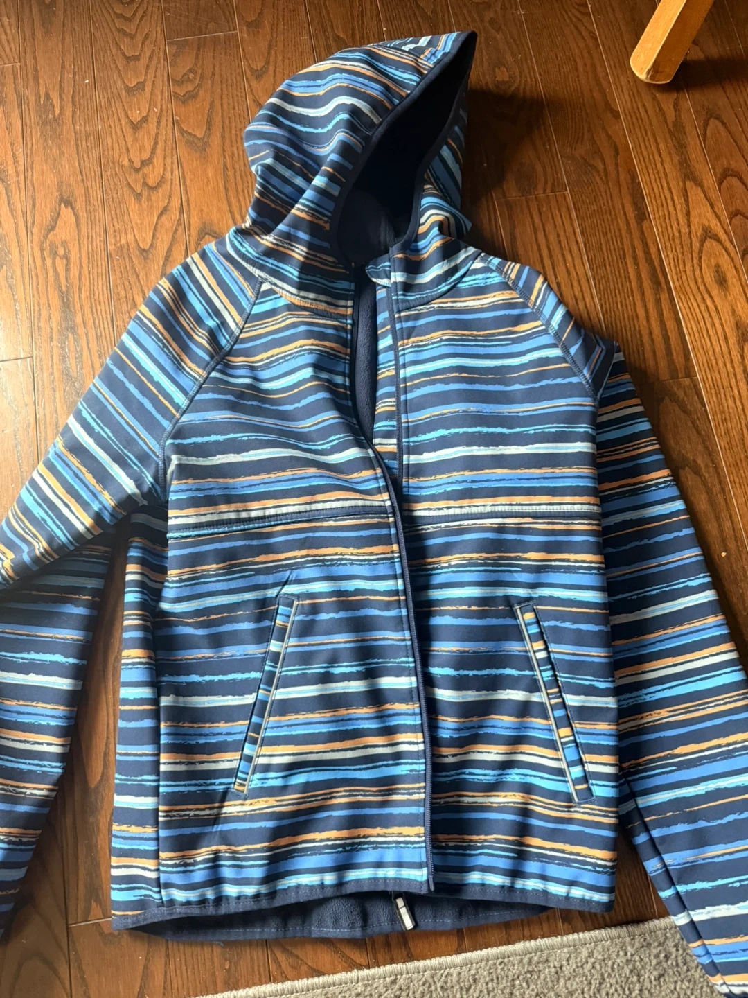 Comfy hooded jacket with a blue, orange, and white stripe pattern. Features a full zip front and two front pockets. Great for layering on cooler days! Size Large, fits 12-14
