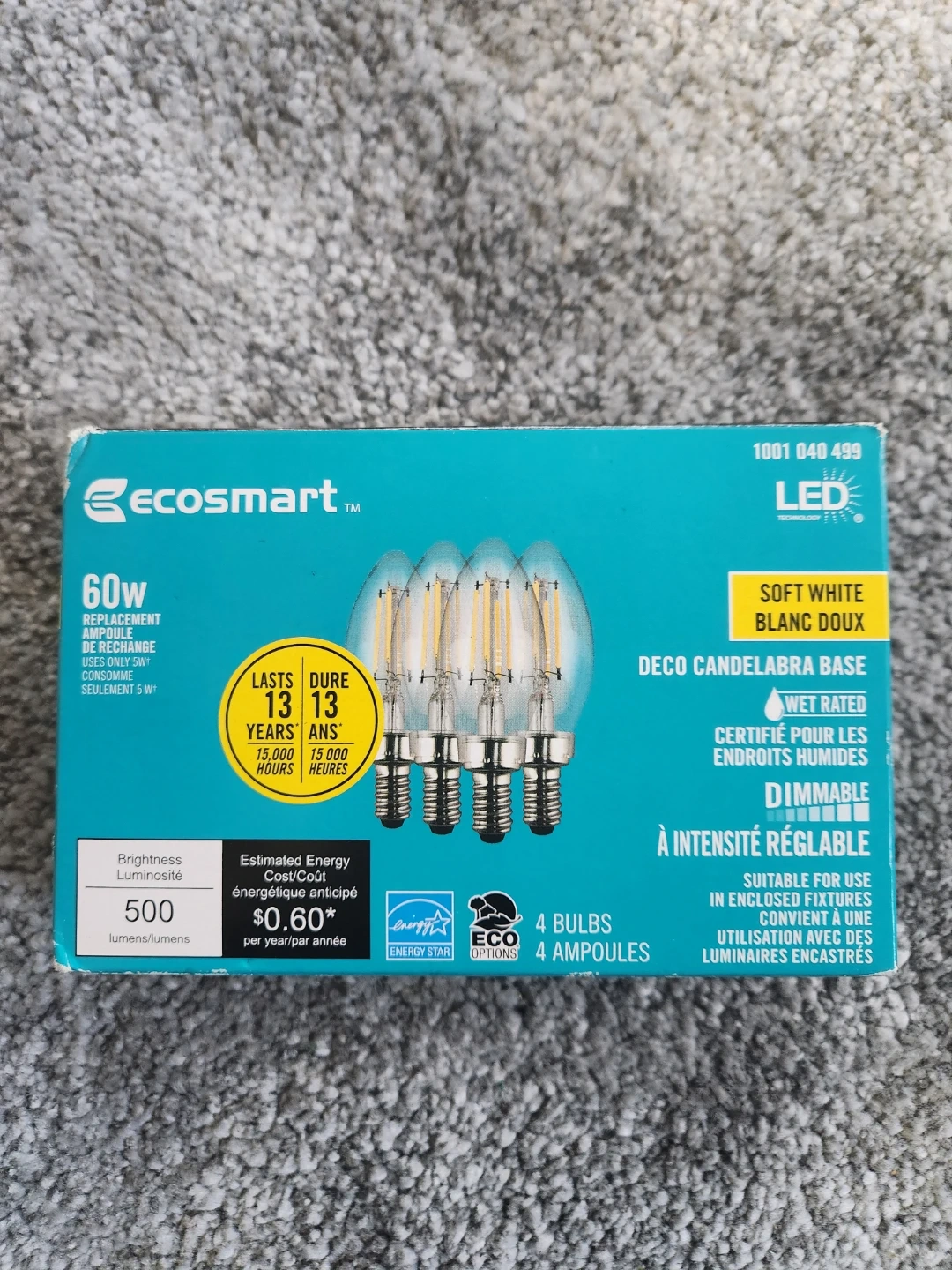 Four Ecosmart LED bulbs with a soft white glow. These deco candelabra base bulbs last 13 years and provide 500 lumens each. They're dimmable and wet-rated, suitable for enclosed fixtures. This 60W replacement uses only 5W.