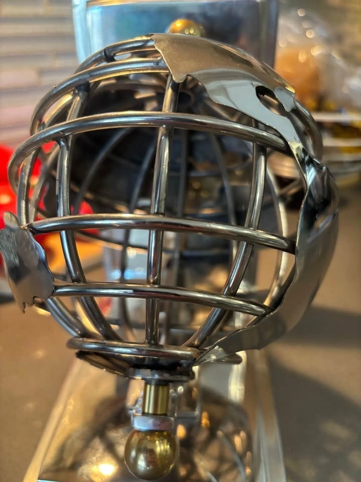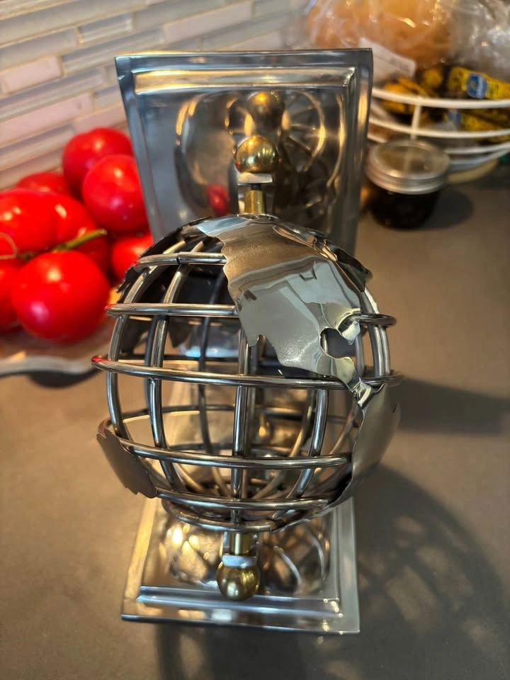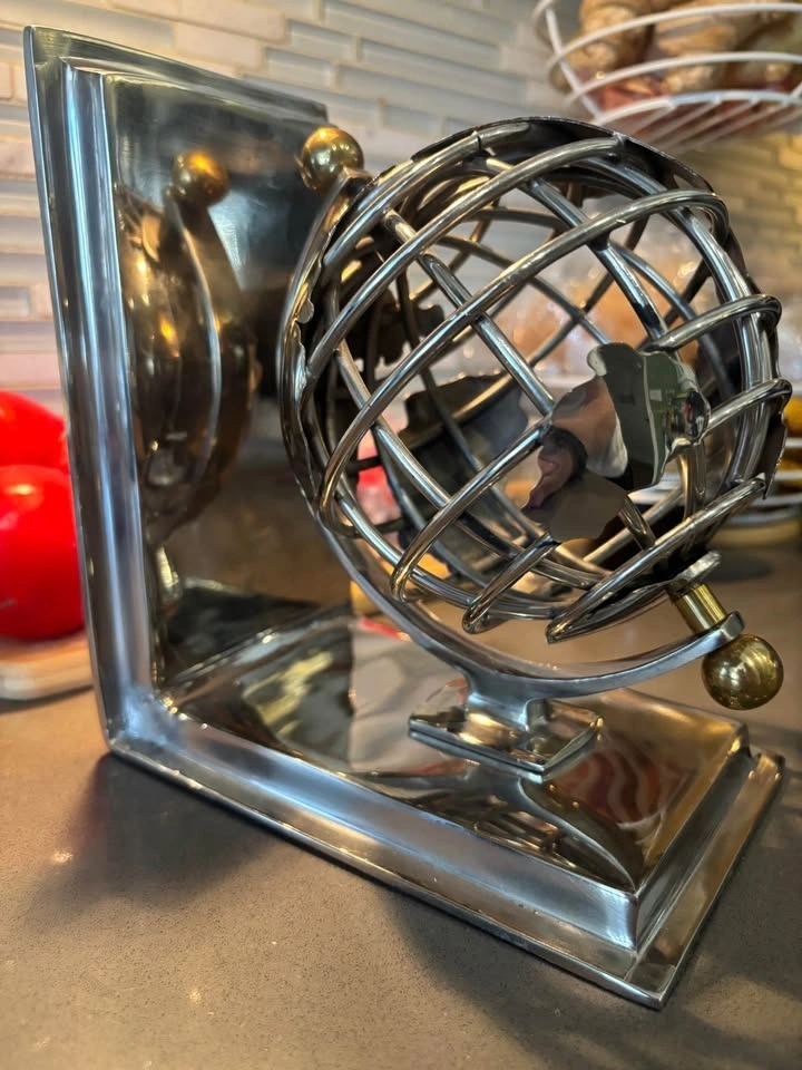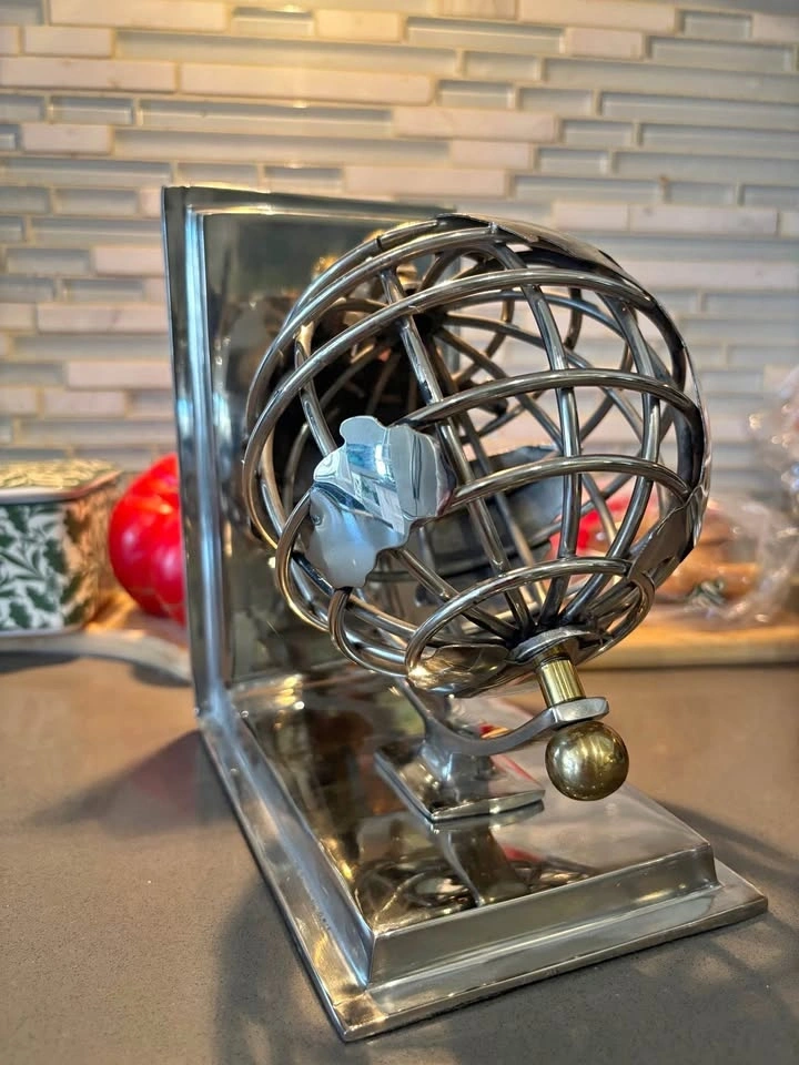 For sale is a striking vintage chrome metal bookend featuring a sculptural spherical wire cage globe design. This eye-catching piece combines function and modern art — perfect for holding books upright on a desk, bookshelf, office, or library shelf.