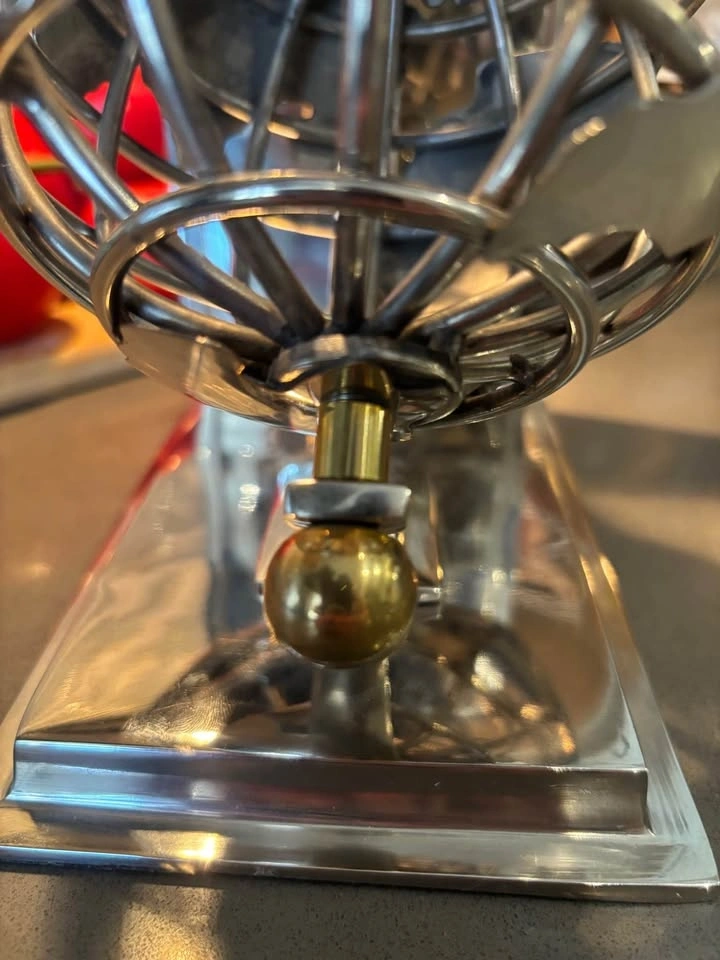 • Intricate intersecting wire rings form an armillary-style globe sphere that pivots on a brass-tone axis with decorative knobs.