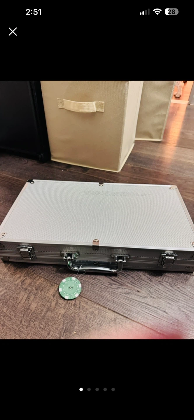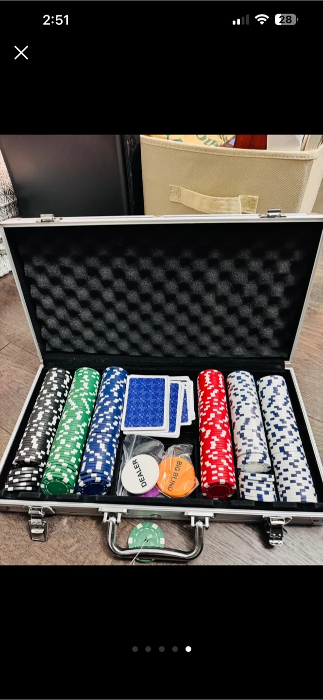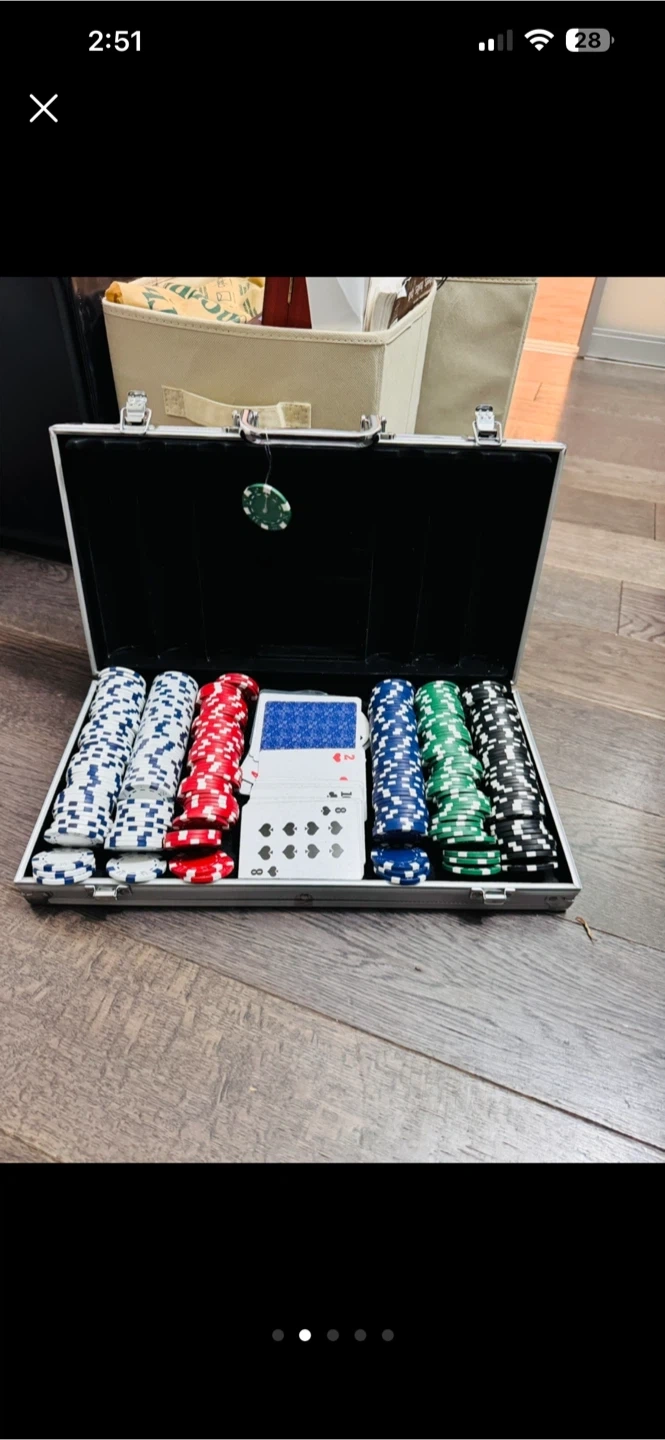 This is a 300-piece poker set from Cardinal Classics, designed for professional weight chips. It includes playing cards, poker dice, and a durable aluminum case for storage and transport. Recommended for ages 8 and up, it's great for game nights with friends and family.