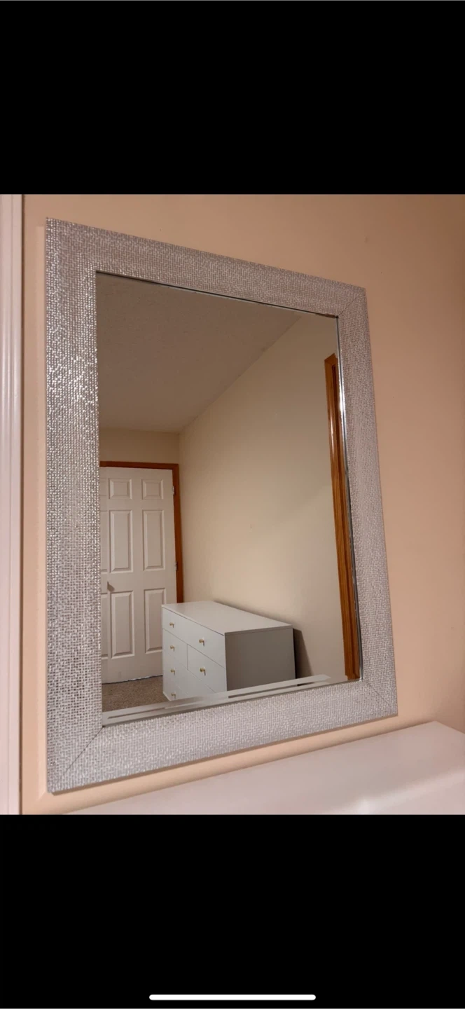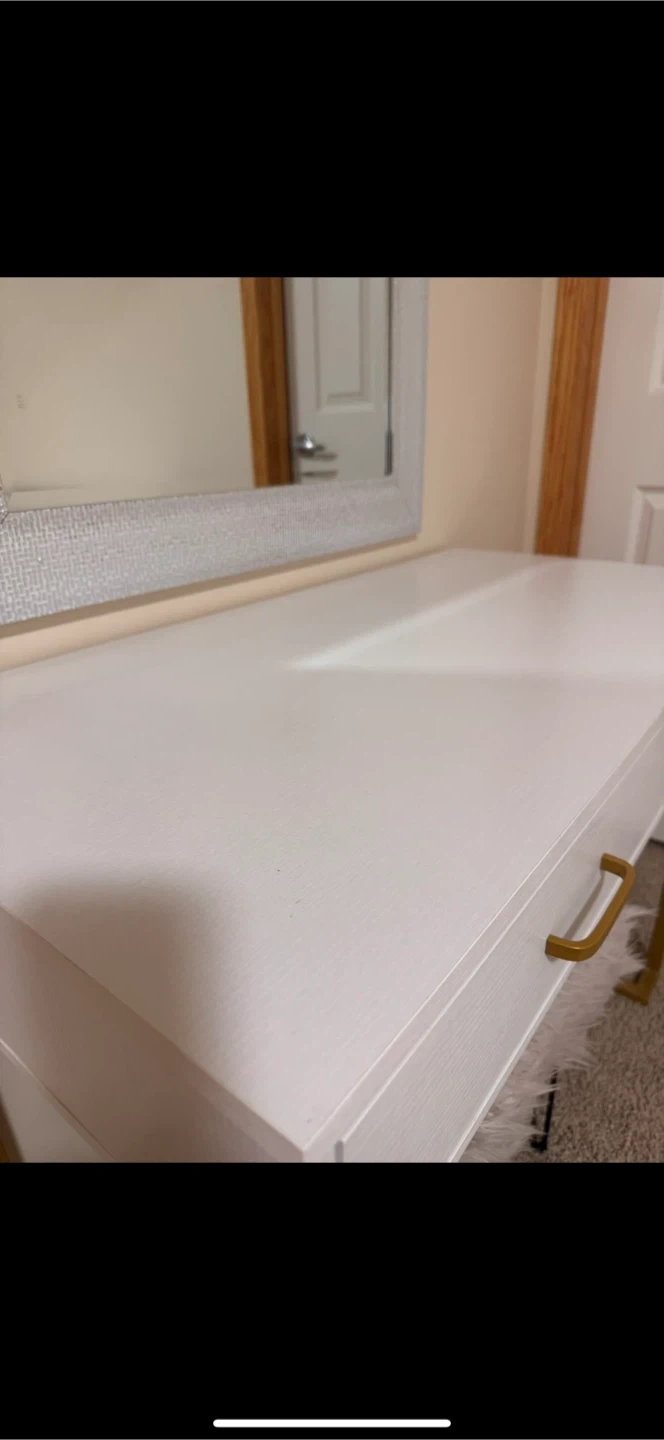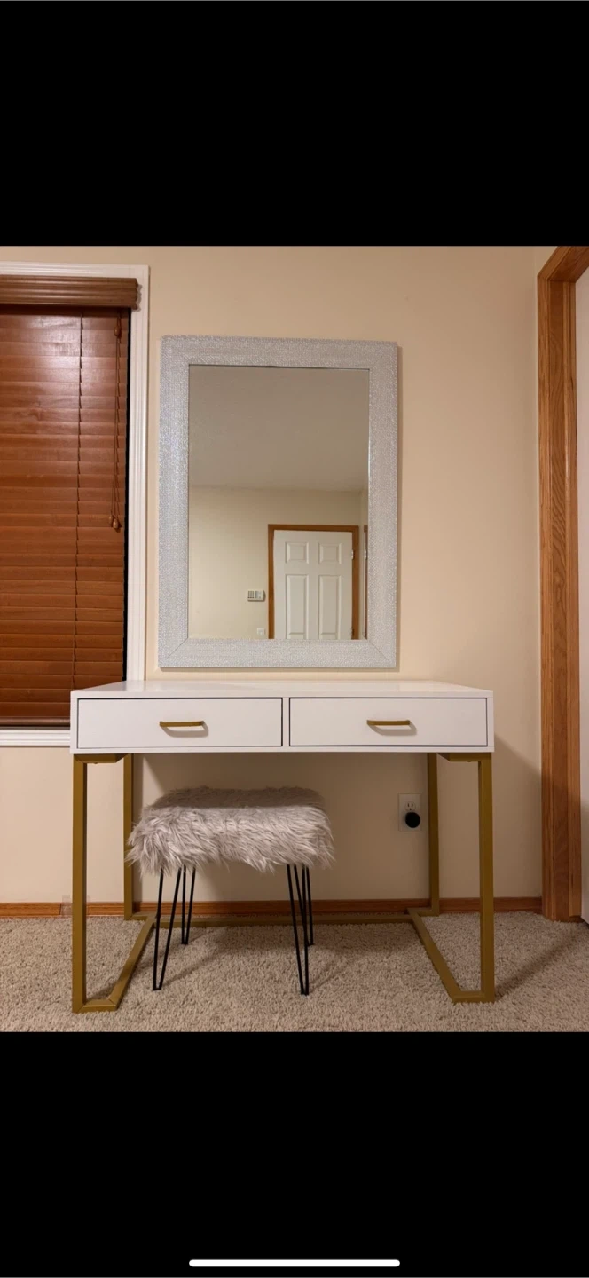 This vanity desk features two drawers with gold hardware. It comes with a mirror. Great for a bedroom or dressing area!No scratches or damages.