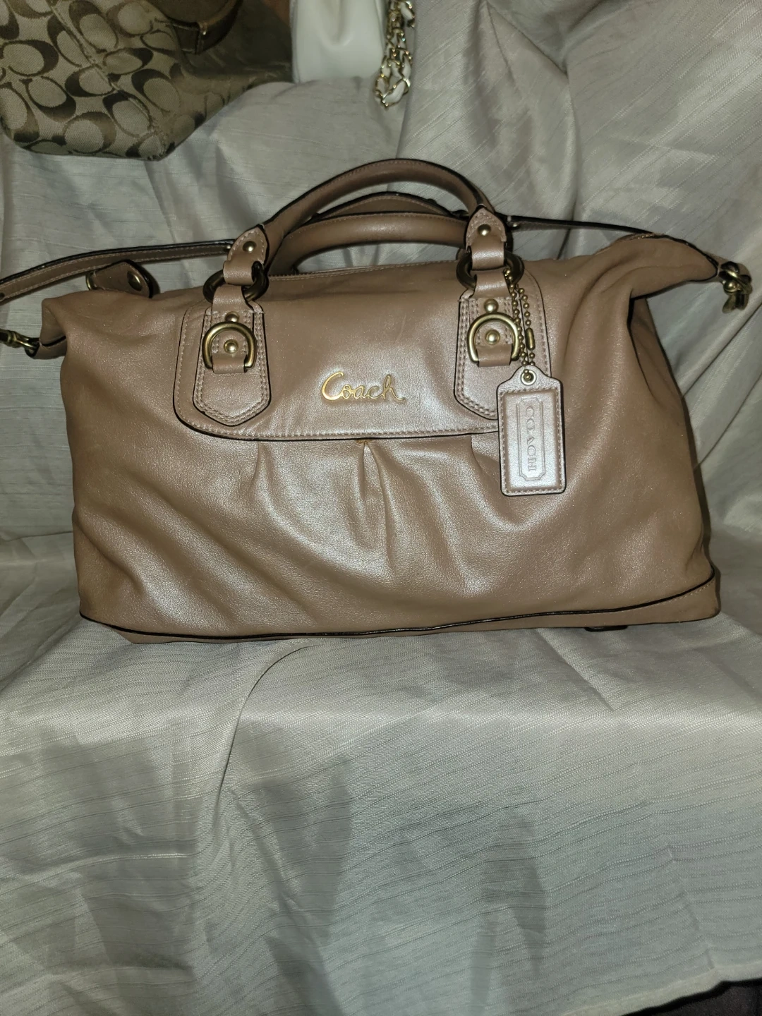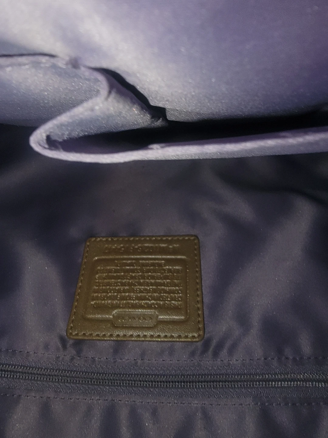 This is a Coach satchel handbag made of brown leather. It has a light purple satin lining with multiple interior pockets. Zipper closure on top.