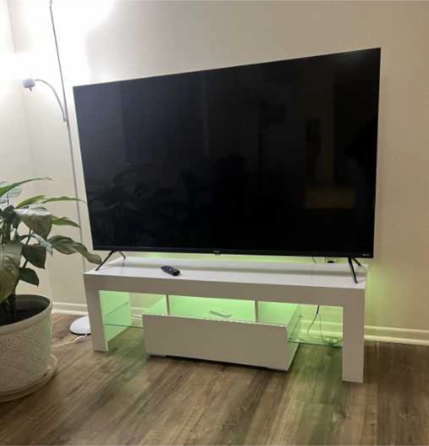 This white TV stand has a modern design with built-in LED lighting that glows green. It features an open shelf area and a pull-out drawer for storage. The stand offers ample space for your media components.