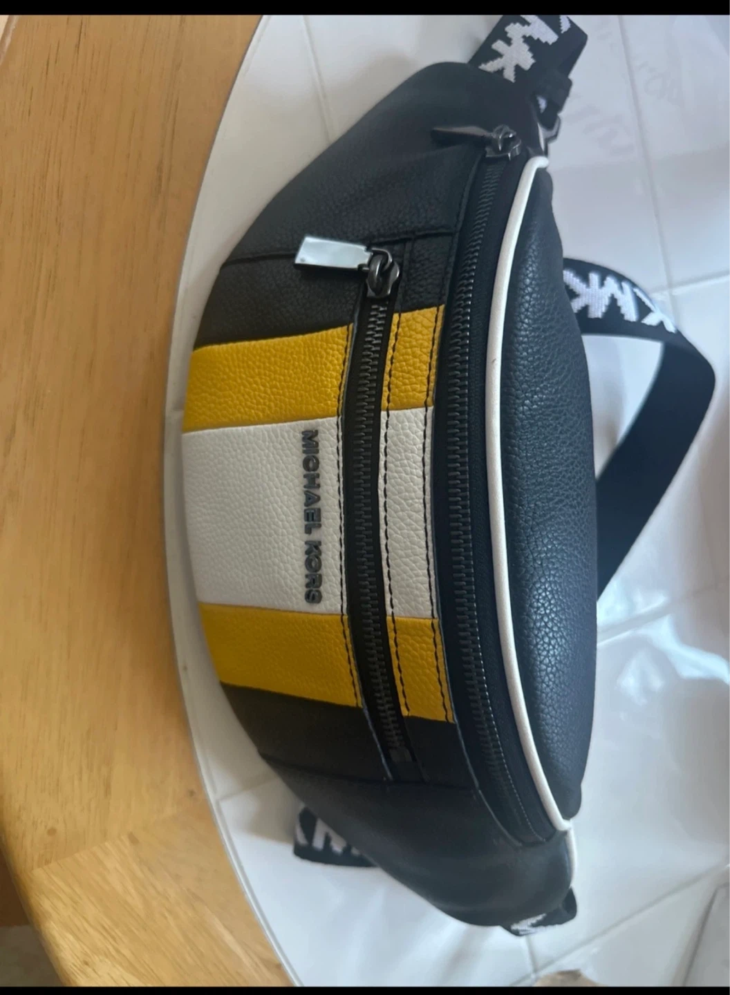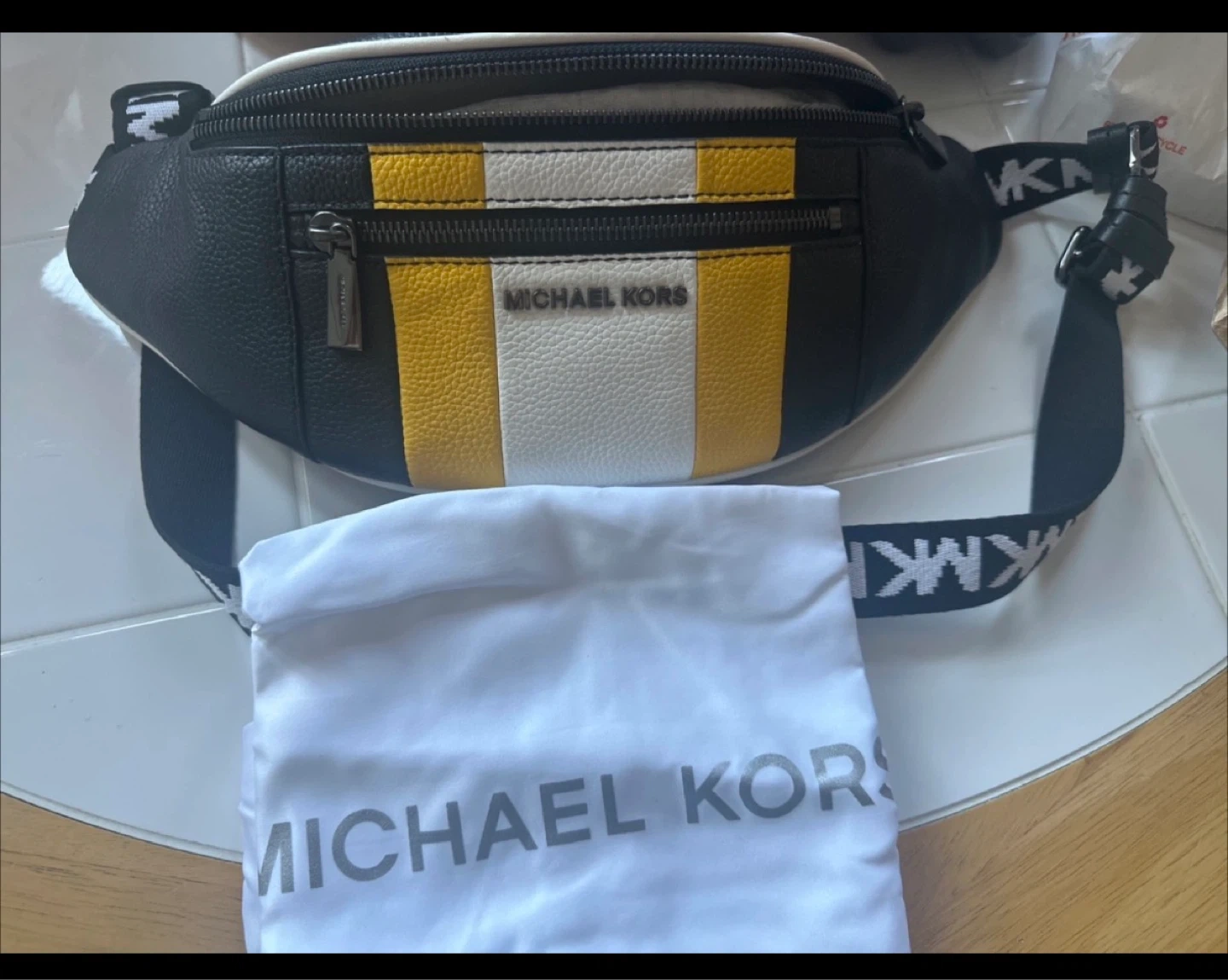 This Michael Kors belt bag is made from leather. It features a colorful stripe design with black, white, and yellow accents. The bag includes a dust bag and care card.