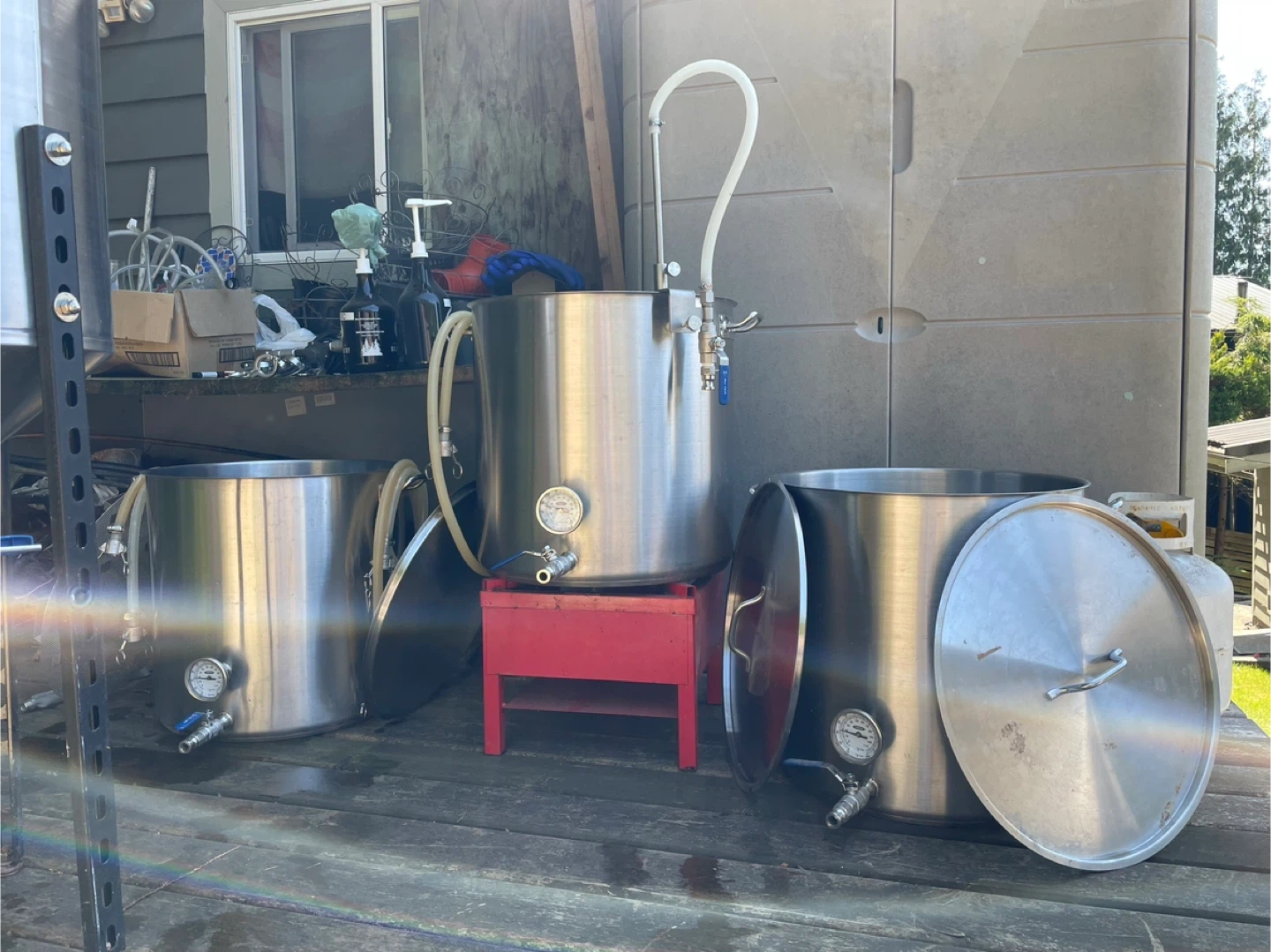 - 100L three-vessel stainless steel brewhouse (hot liquor tank, mash tun, kettle)