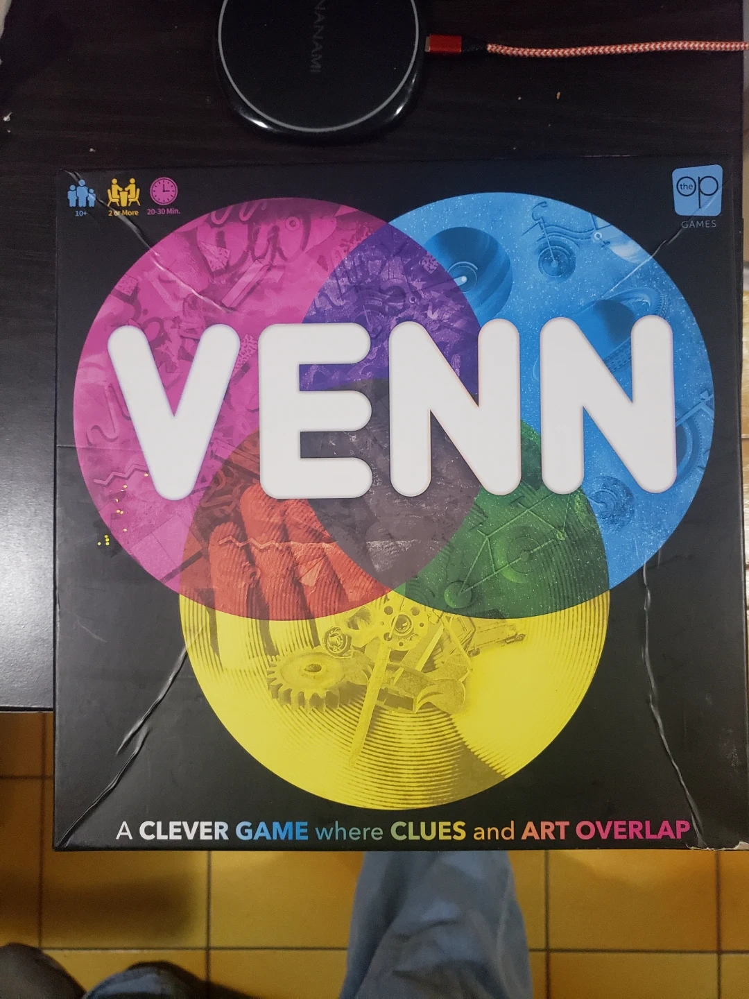 This is the VENN board game, a clever game where clues and art overlap. It's designed for 2 or more players and has a playtime of 20-30 minutes. Suitable for ages 10 and up.